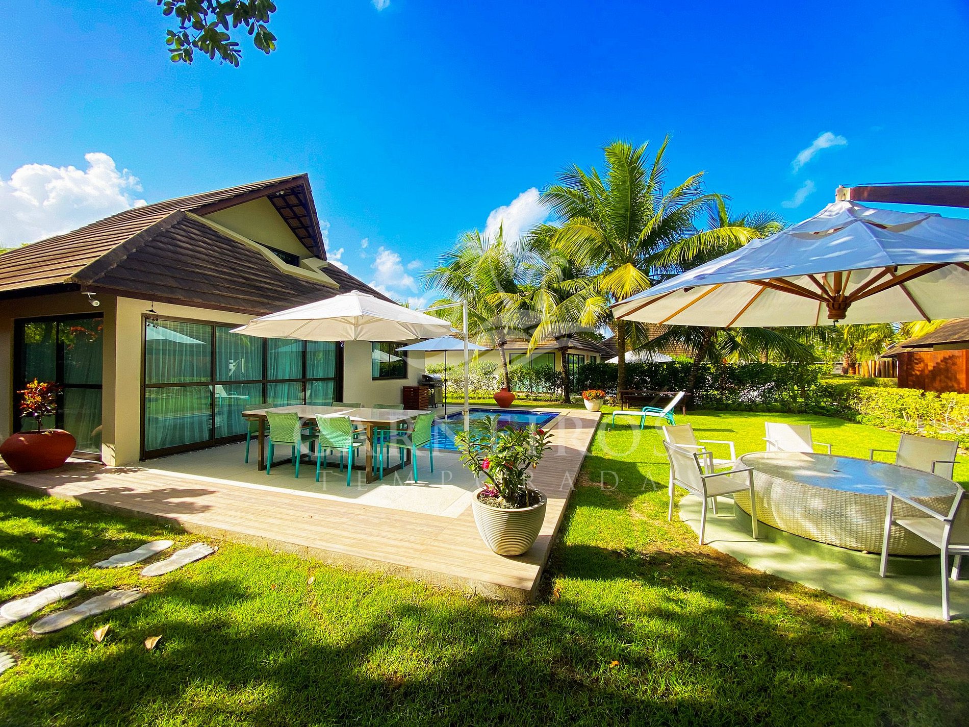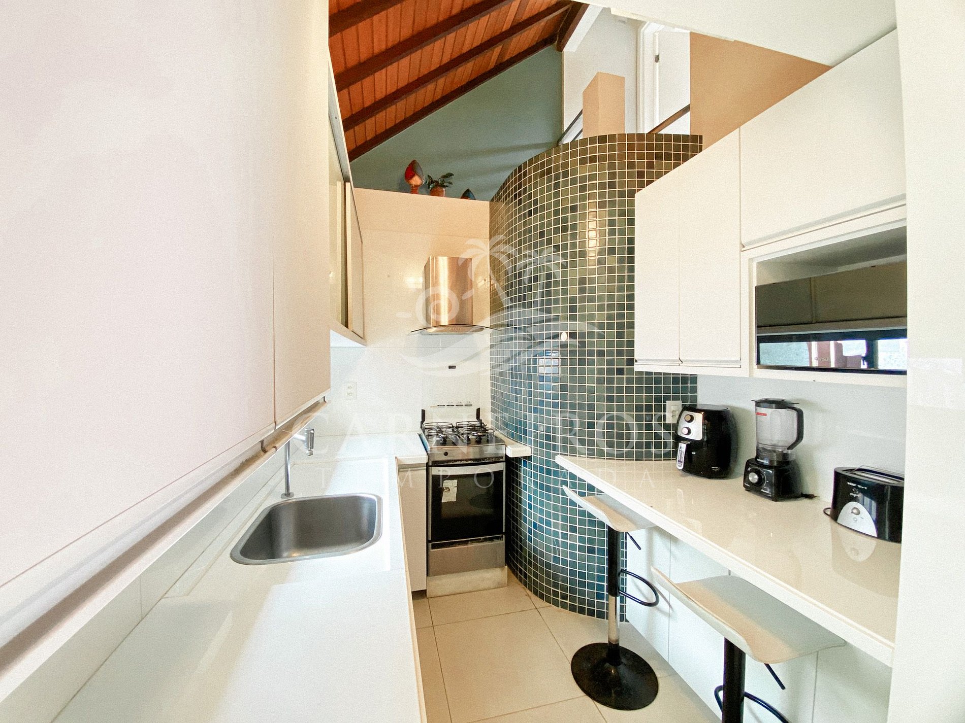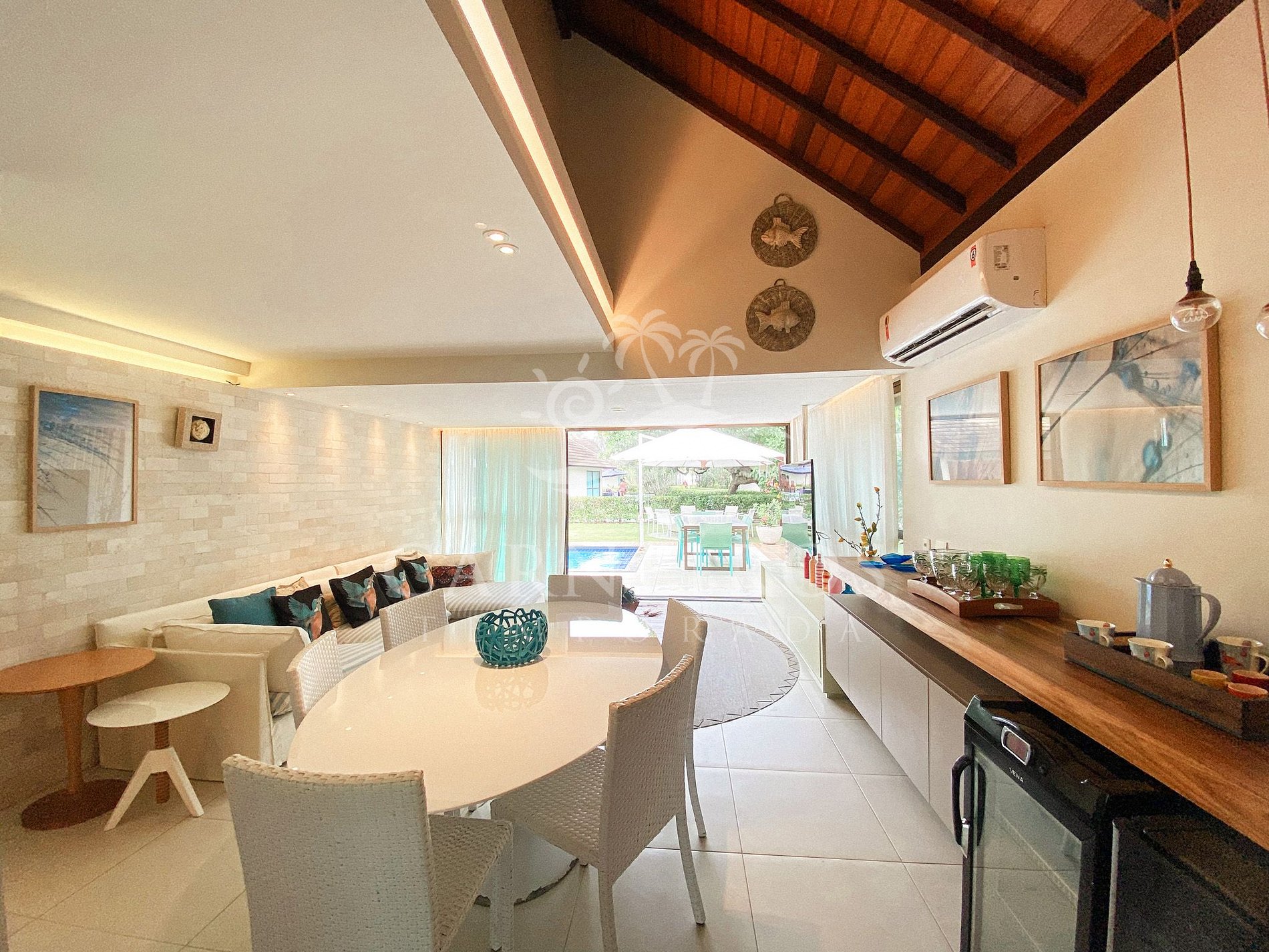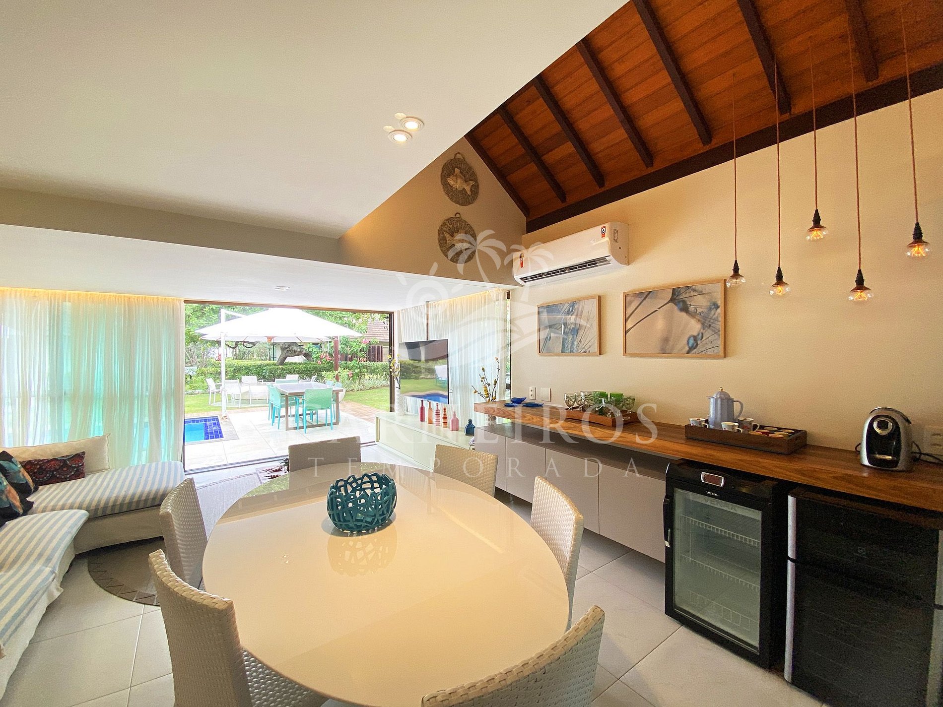 A sala de estar com agradável decoração possui sofá, ar-condicionado, cervejeira e TV com serviço de streaming. A cozinha é completa e possui diversos itens como geladeira, fogão, forno, micro-ondas, liquidificador, sanduicheira, cafeteira, bebedouro, airfryer, batedeira e outros utensílios. Há também espaço para refeições com mesa e 06 cadeiras. O bangalô possui 3 banheiros completos.