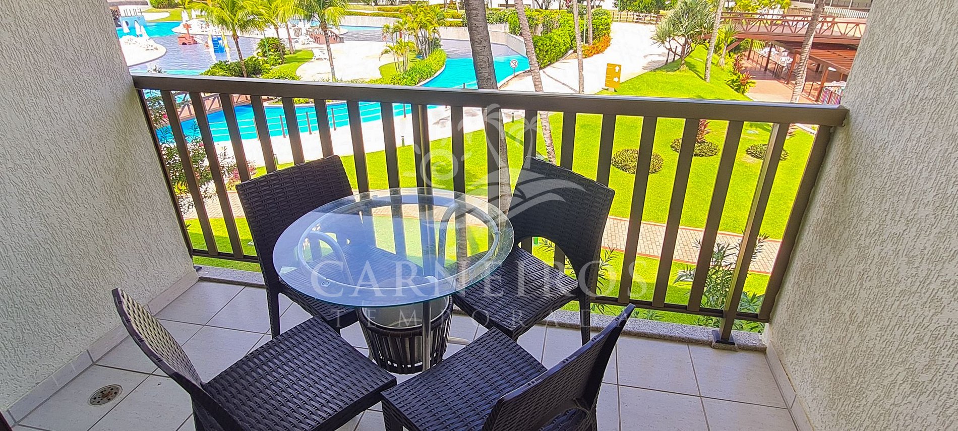 ✹ O flat se encontra no segundo andar do prédio, possui vista para a piscina e também uma linda varanda com mesa e quatro cadeiras ✹