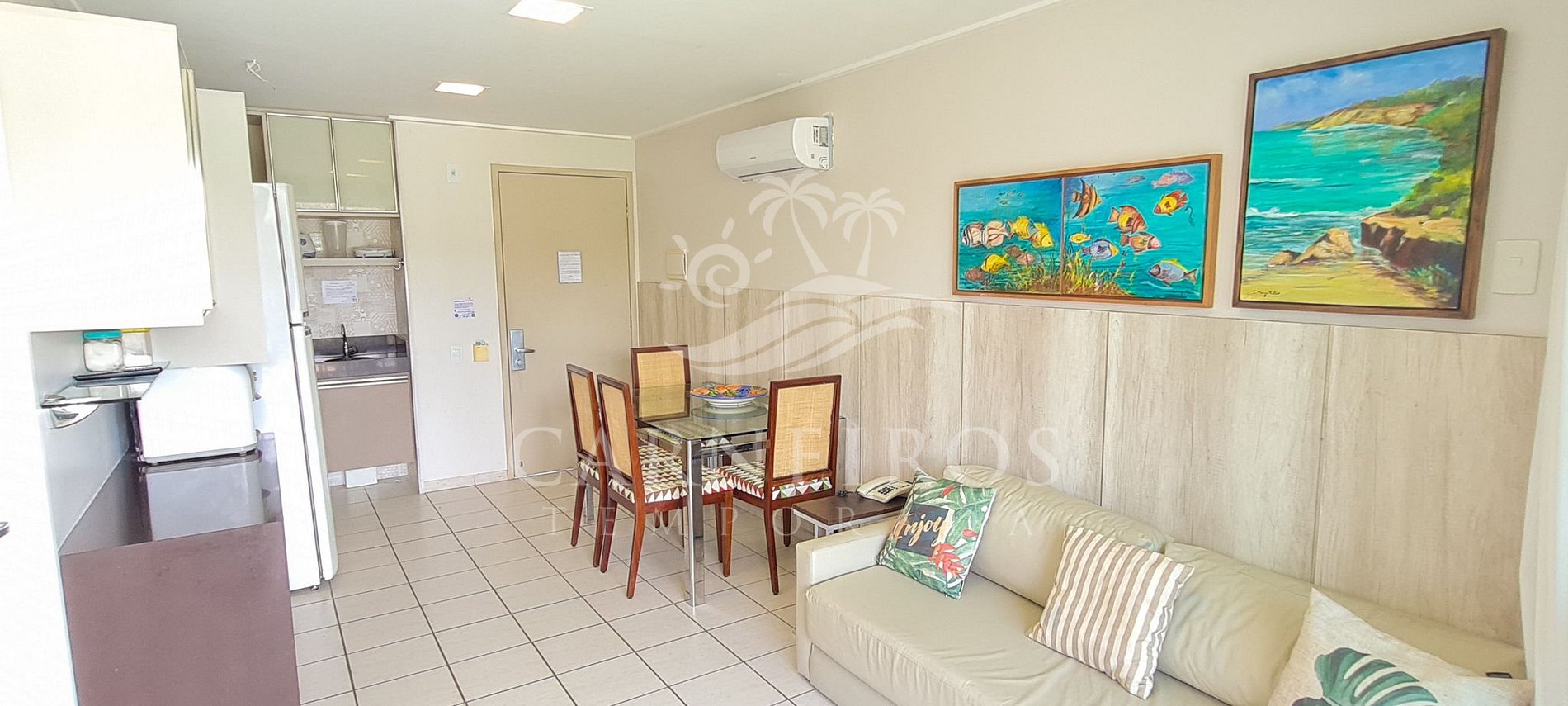 A sala de estar com uma decoração minimalista conta com uma TV com serviço de streaming, sofá-cama (acomoda até 02 pessoas) e ar-condicionado. A cozinha é completa e equipada com os principais utensílios como louça, copos, panelas, talheres, sanduicheira, liquidificador, micro-ondas, fogão elétrico, geladeira e outros. Além disso, temos uma mesa de jantar com quatro cadeiras. Possui também 1 banheiro com ducha quente e atende as necessidades diárias.