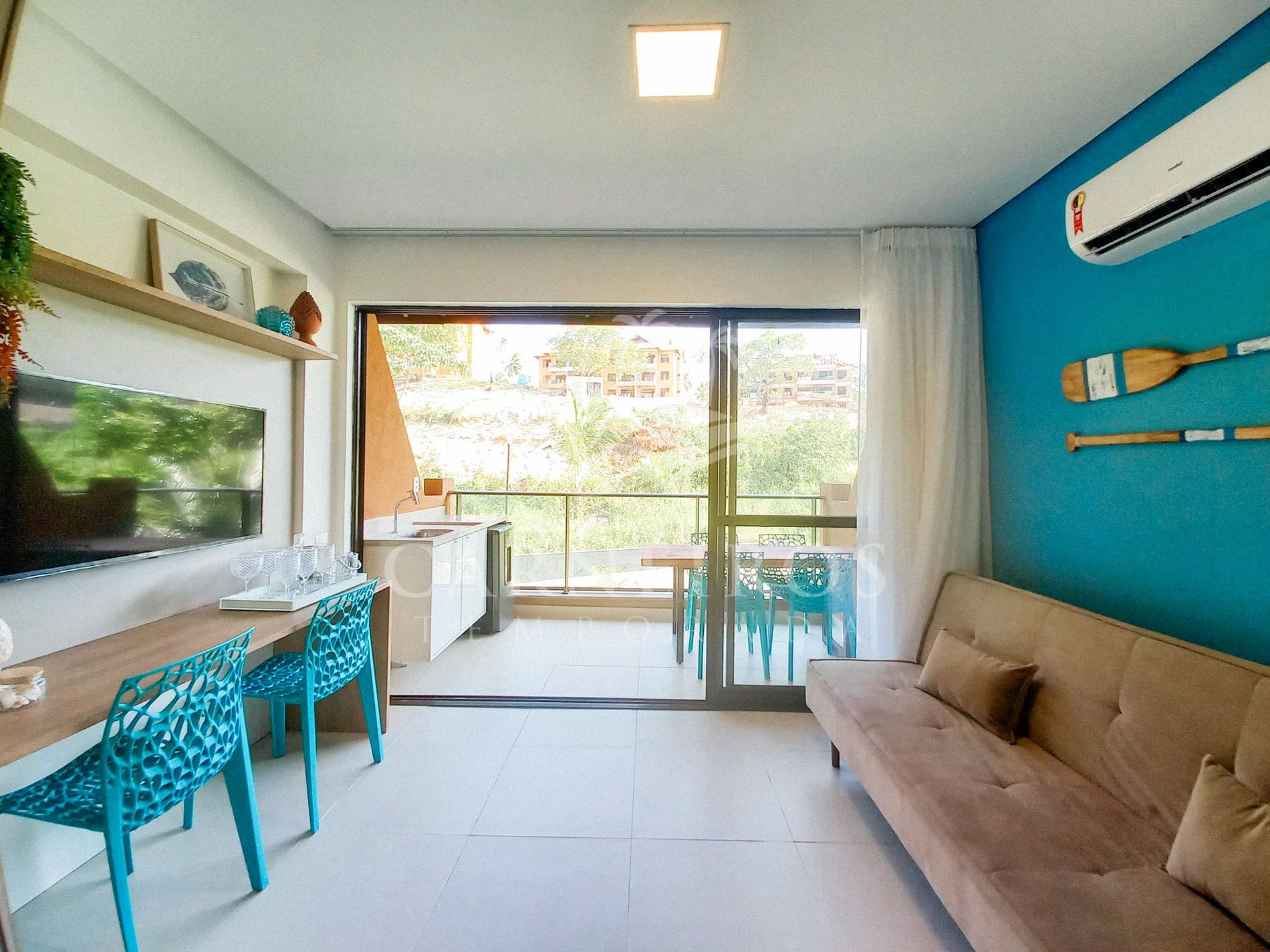 No ambiente integrado, além da decoração agradável temos uma TV com serviço de streaming, balcão e duas cadeiras, sofá-cama e ar-condicionado. A cozinha é completa e possui diversos itens como micro-ondas, fogão cooktop 04 bocas com forno, geladeira, liquidificador, sanduicheira, cafeteira, purificador de água e diversos utensílios. O flat possui 1 banheiro completo.