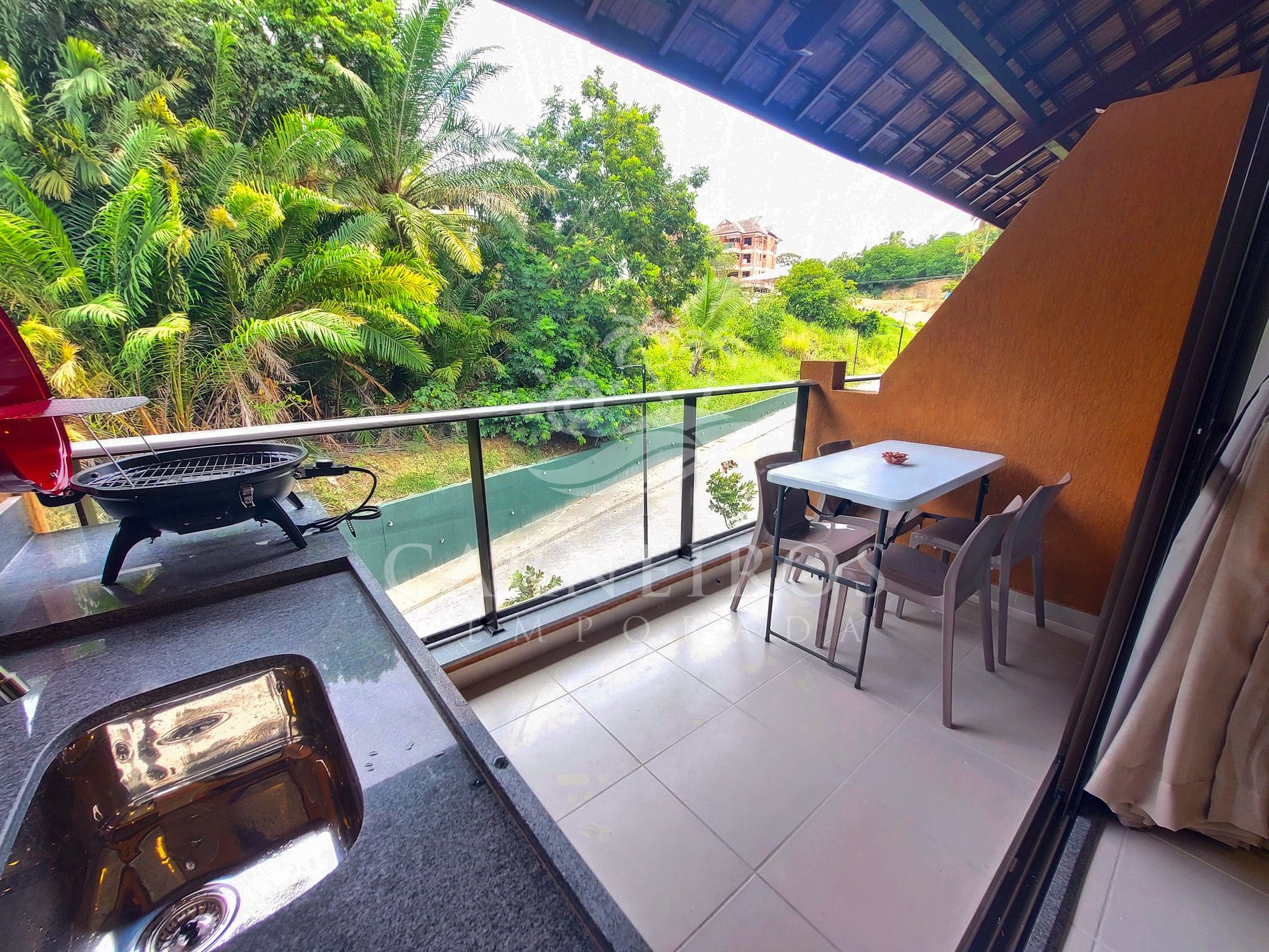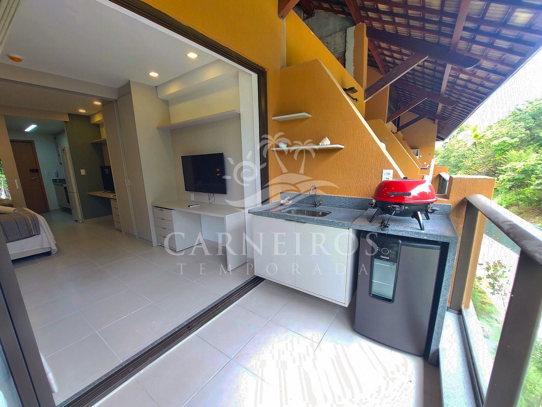 ✹ O flat se encontra no segundo andar do prédio, possui uma linda varanda com vista para o jardim, mesa com quatro cadeiras, churrasqueira elétrica e frigobar ✹