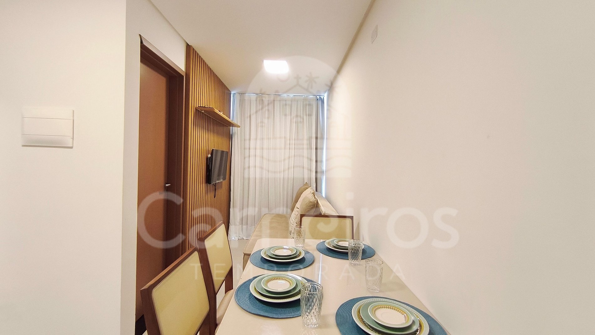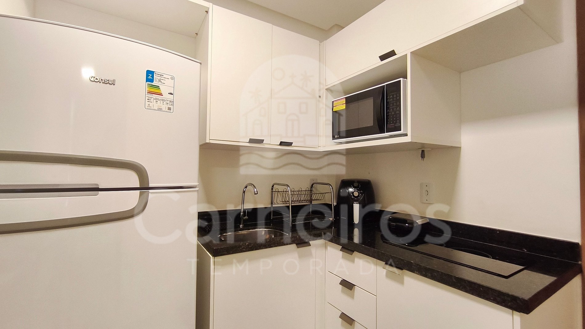 A sala de estar conta com uma decoração aconchegante e minimalista, possui sofá-cama casal e TV. A cozinha é completa e equipada com os principais utensílios como talheres, copos, panelas, cooktop, geladeira, micro-ondas, airfryer e outros. Possui também 1 banheiro completo.