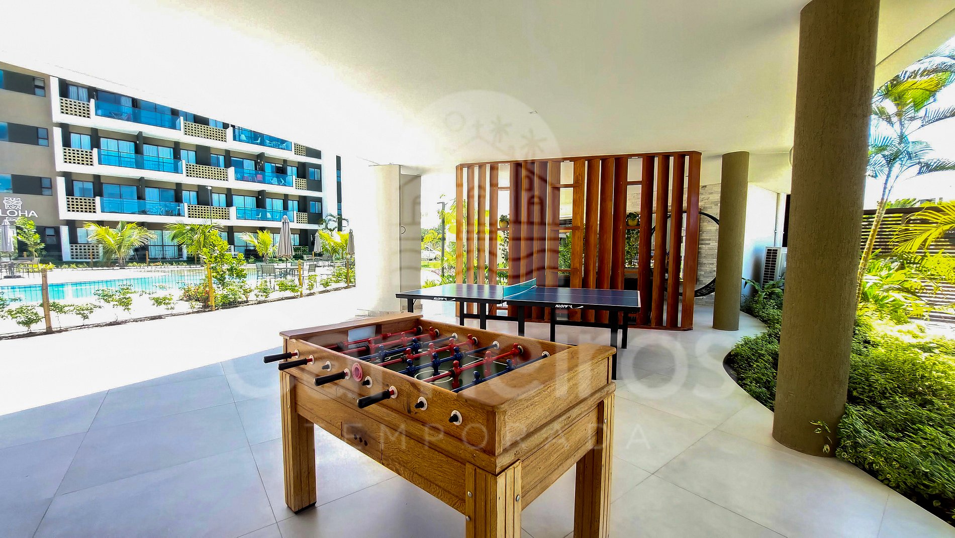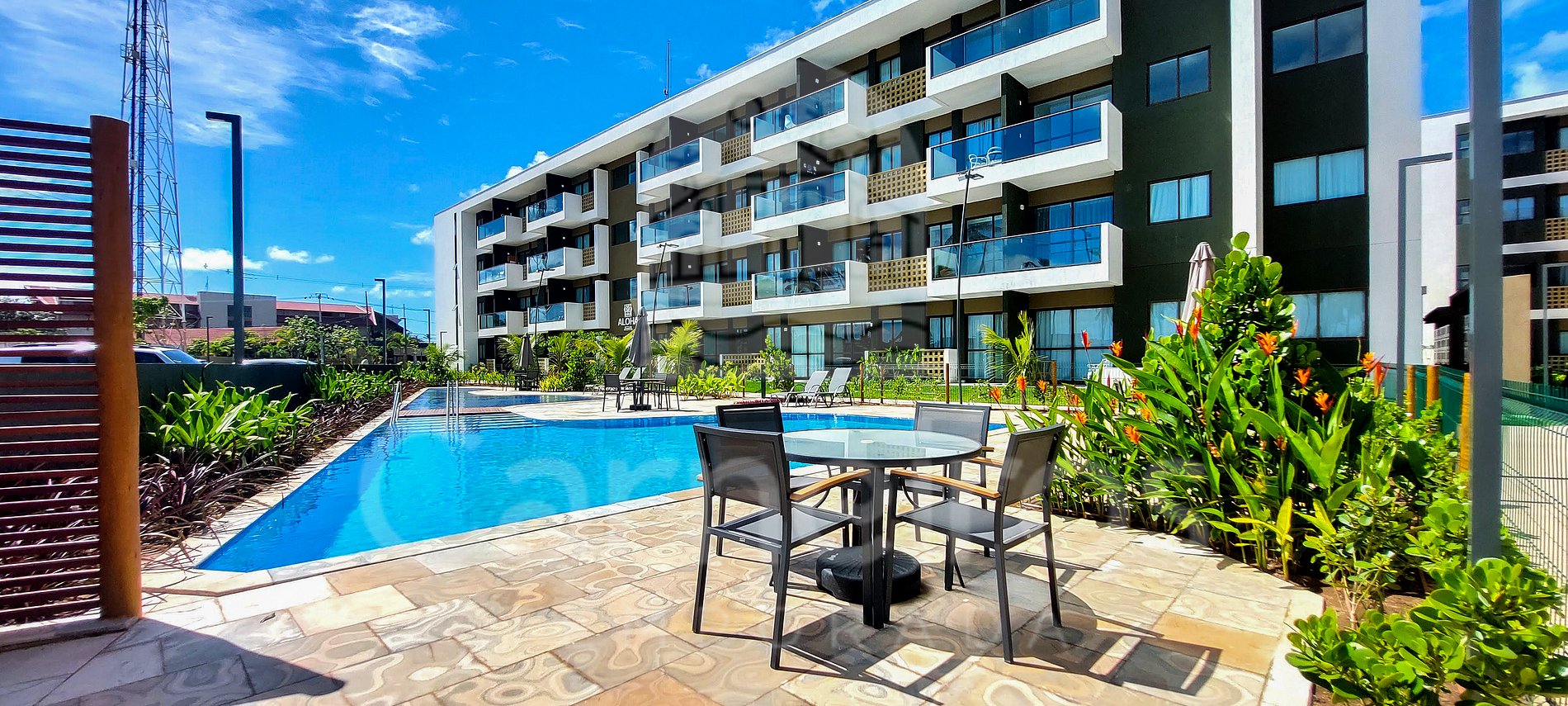 ✹ O flat se encontra no segundo andar do prédio, possui vista para a piscina e varanda com mesa e cadeiras ✹