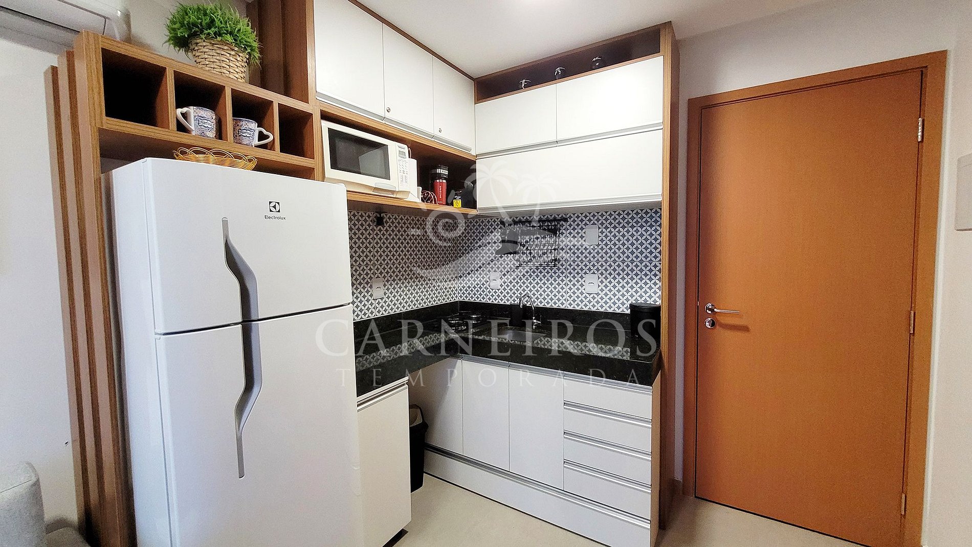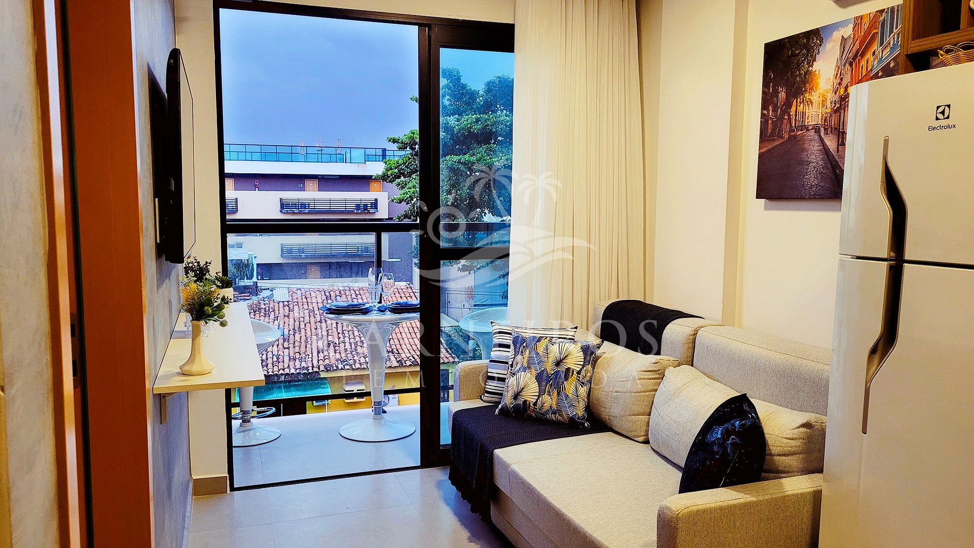 A sala de estar conta com uma decoração agradável que traz calmaria e conforto, contendo um sofá-cama de casal, ar-condicionado e TV com serviços de streaming. A cozinha é completa e equipada com os principais utensílios como louças, copos, talheres, geladeira, fogão, micro-ondas, sanduicheira, cafeteira e outros. O flat possui 1 banheiro completo.