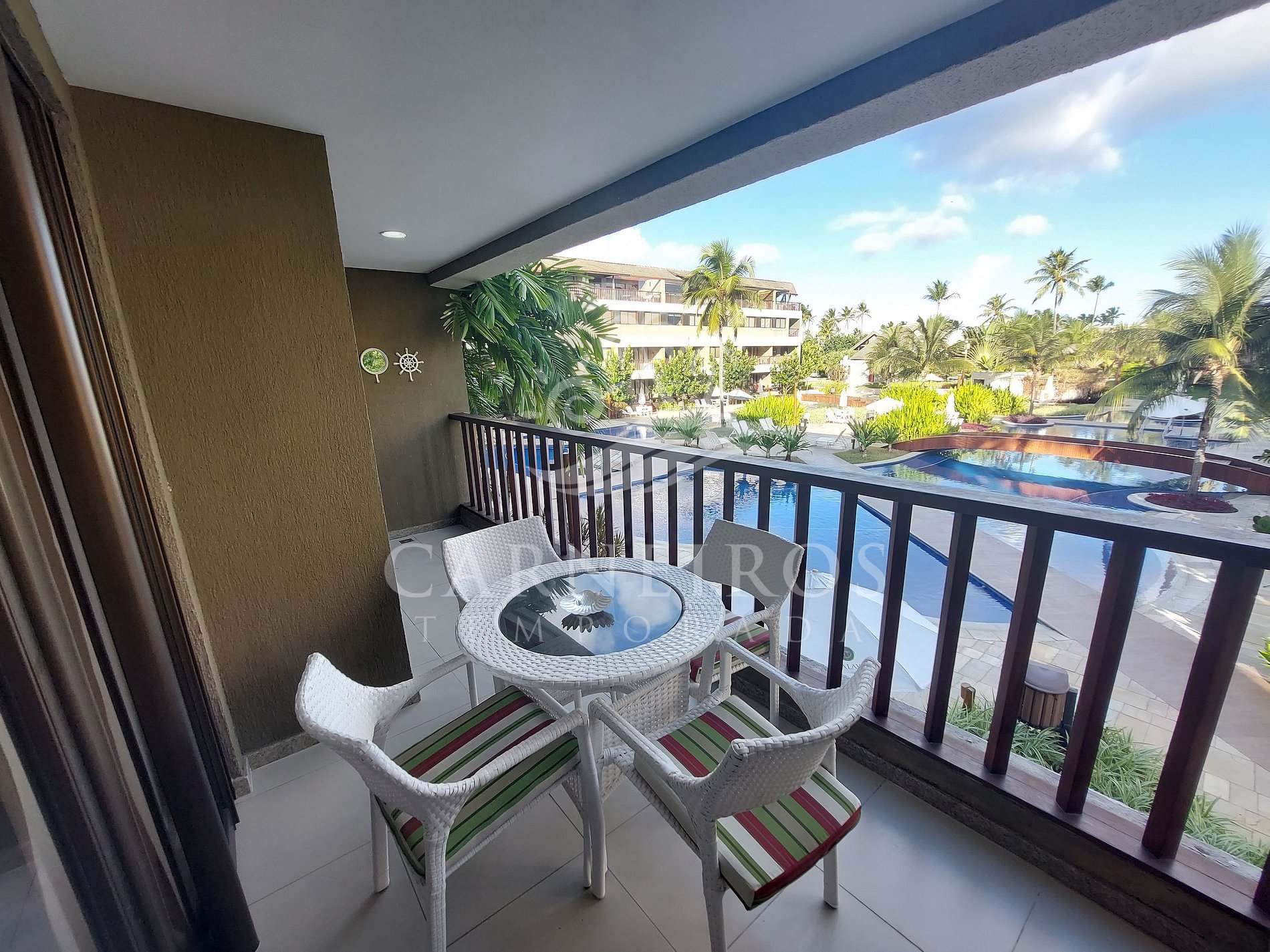 ✹ O flat se encontra no primeiro andar do prédio com vista para a piscina e possui uma linda varanda com uma mesa e 04 cadeiras ✹