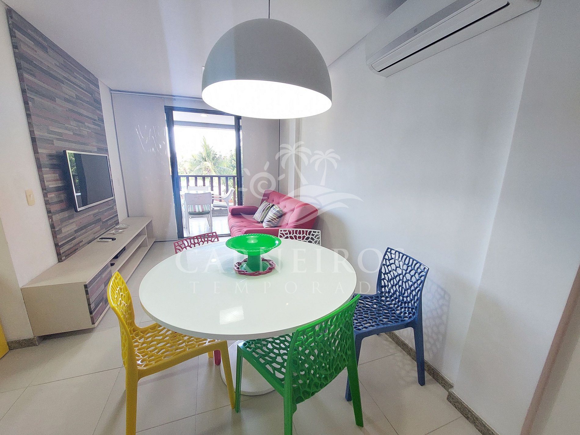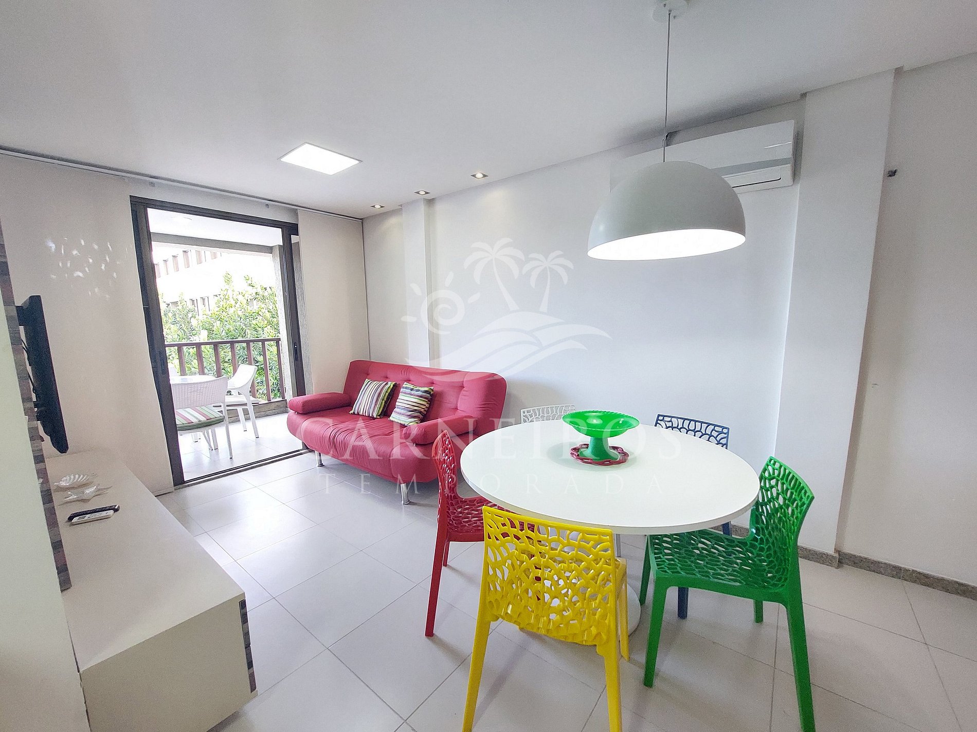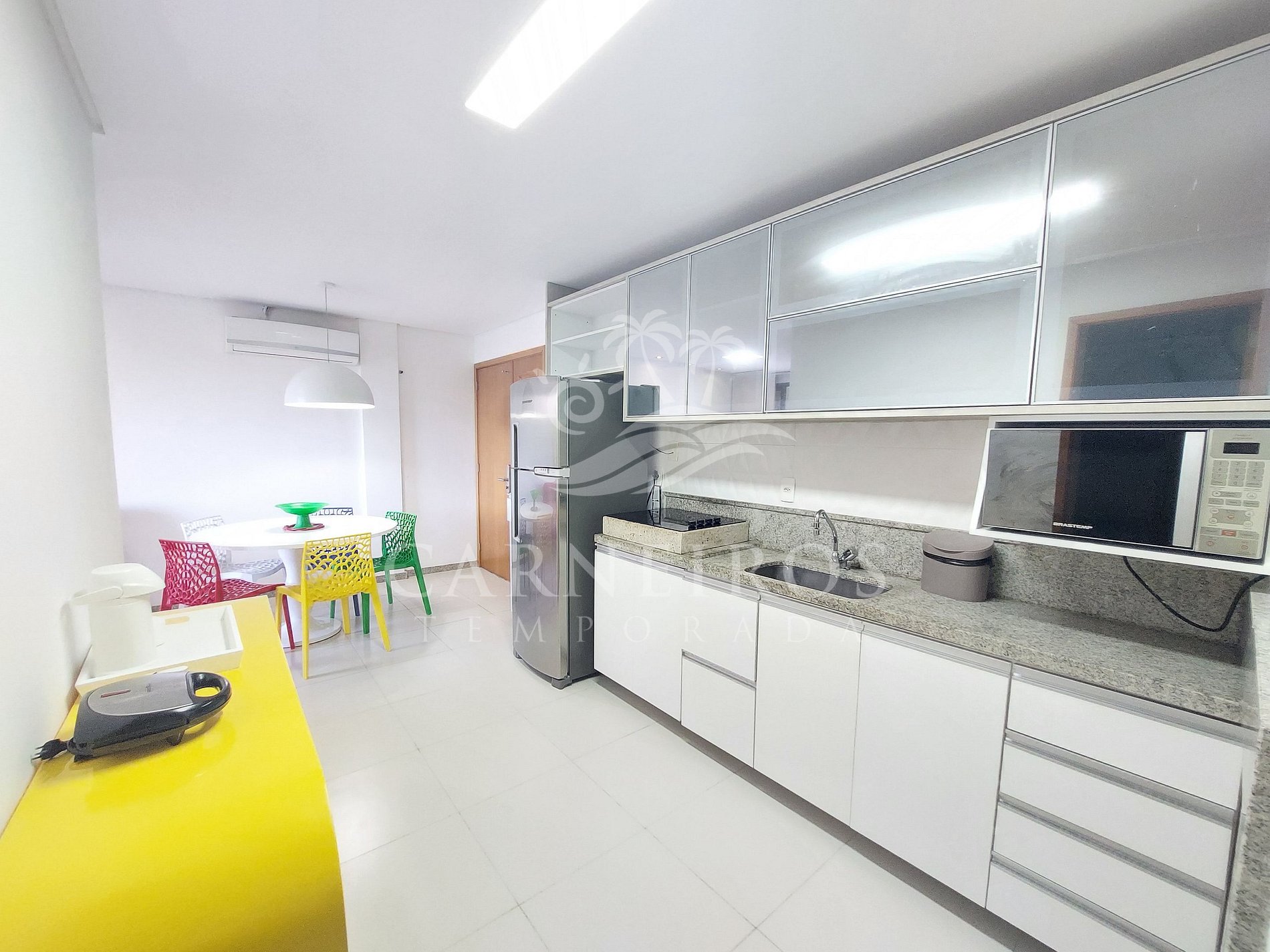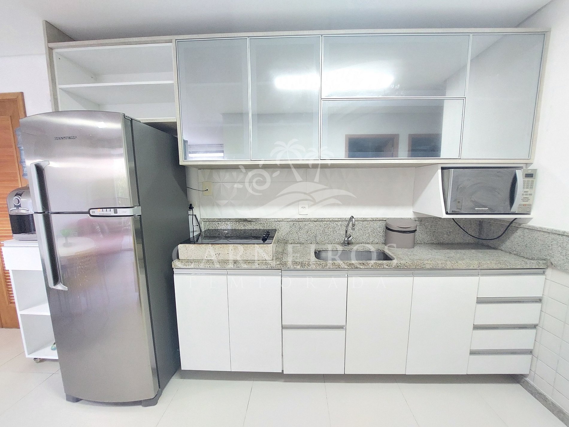 A sala de estar com decoração agradável traz calmaria e conforto, contendo um sofá, TV e ar-condicionado. A cozinha é completa e equipada com os principais utensílios como louça, copos, taças, panelas, talheres, sanduicheira, bebedouro, micro-ondas, cooktop elétrico com 04 bocas, geladeira e outros, além de uma mesa de jantar com 05 cadeiras. Possui também 2 banheiros com ducha quente que atendem às necessidades diárias.