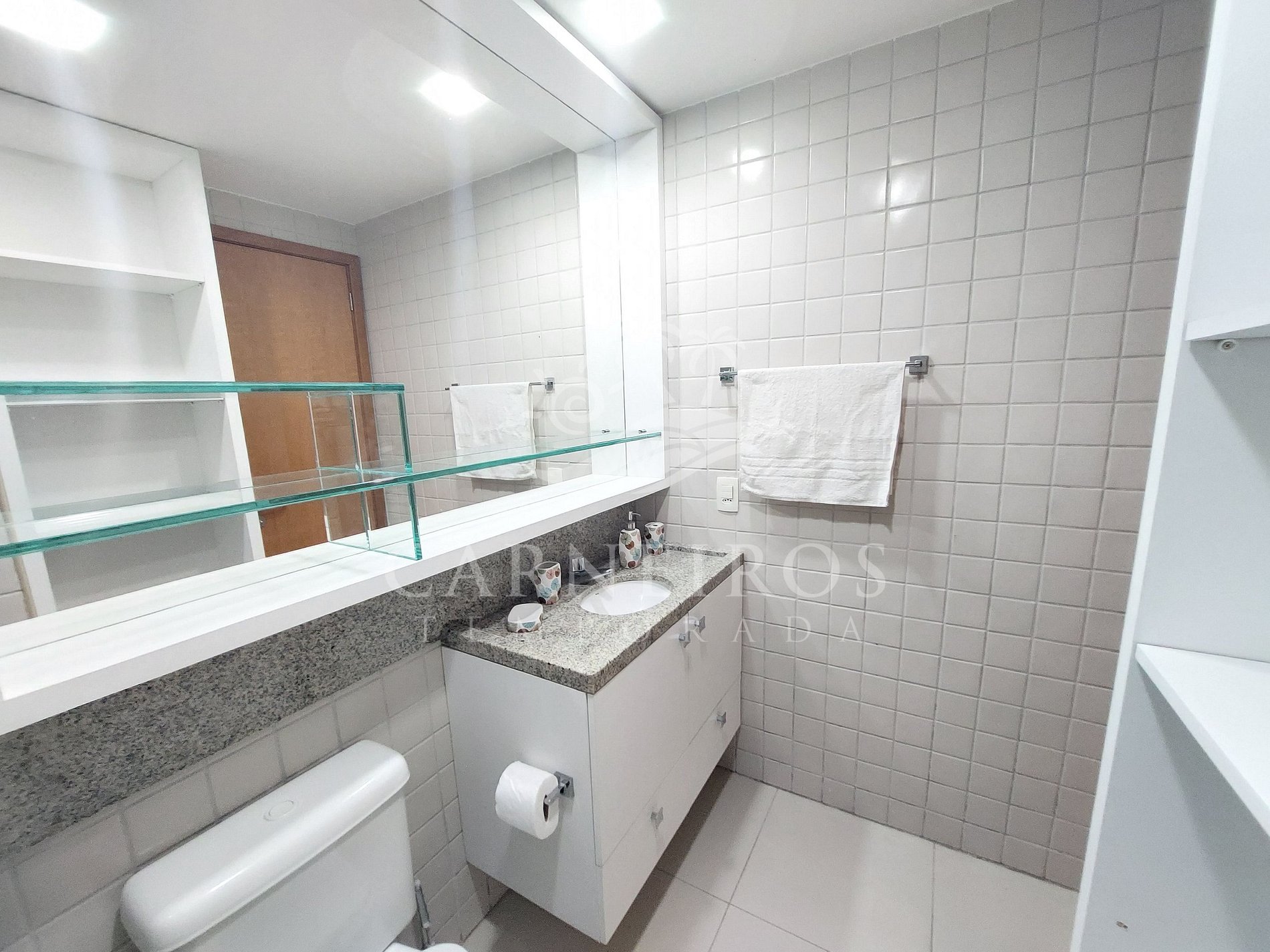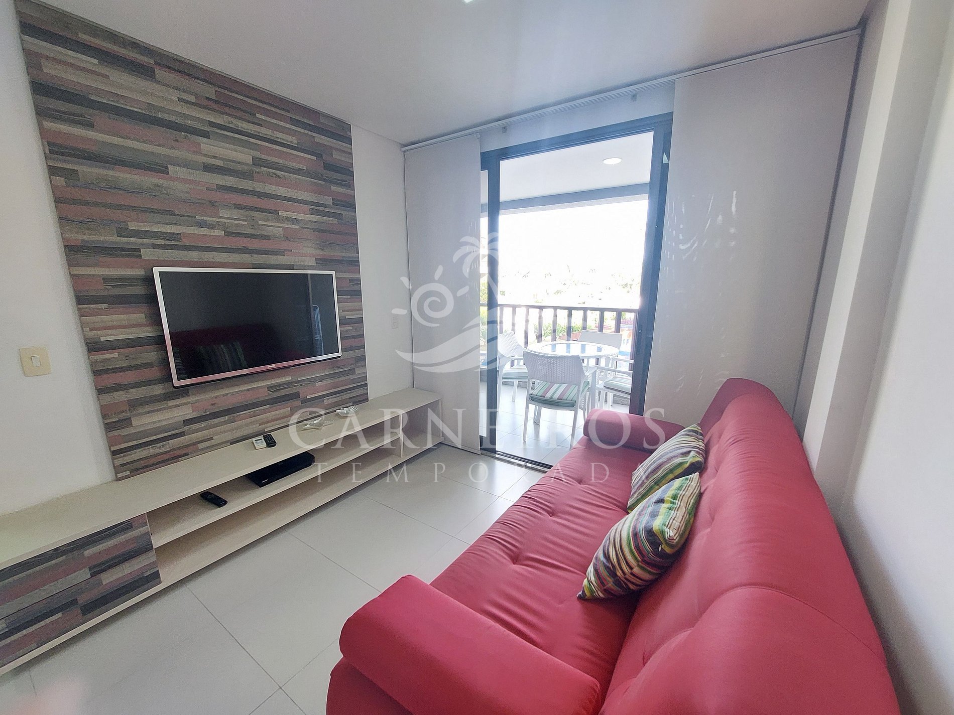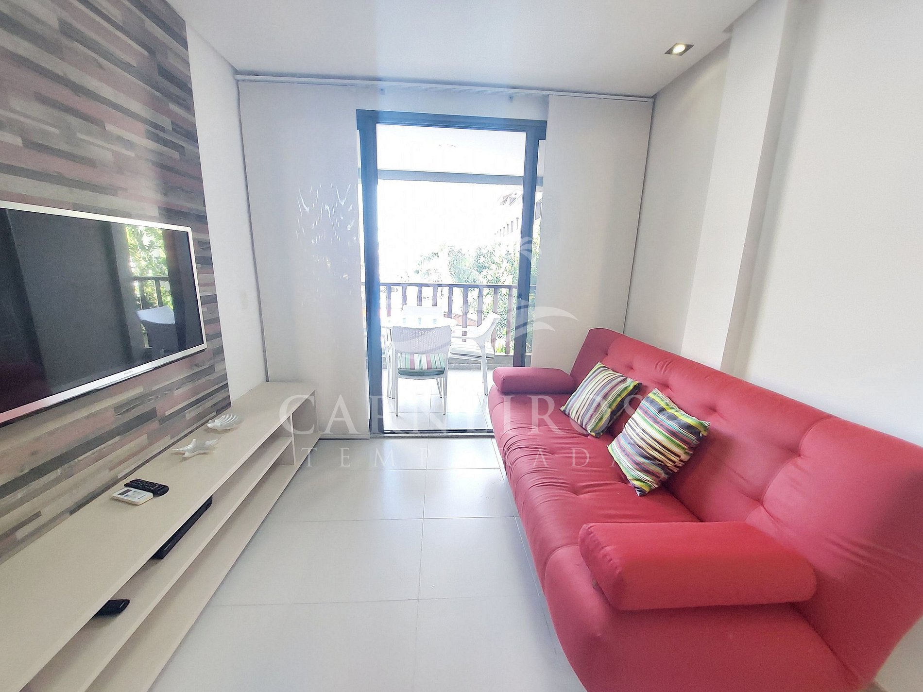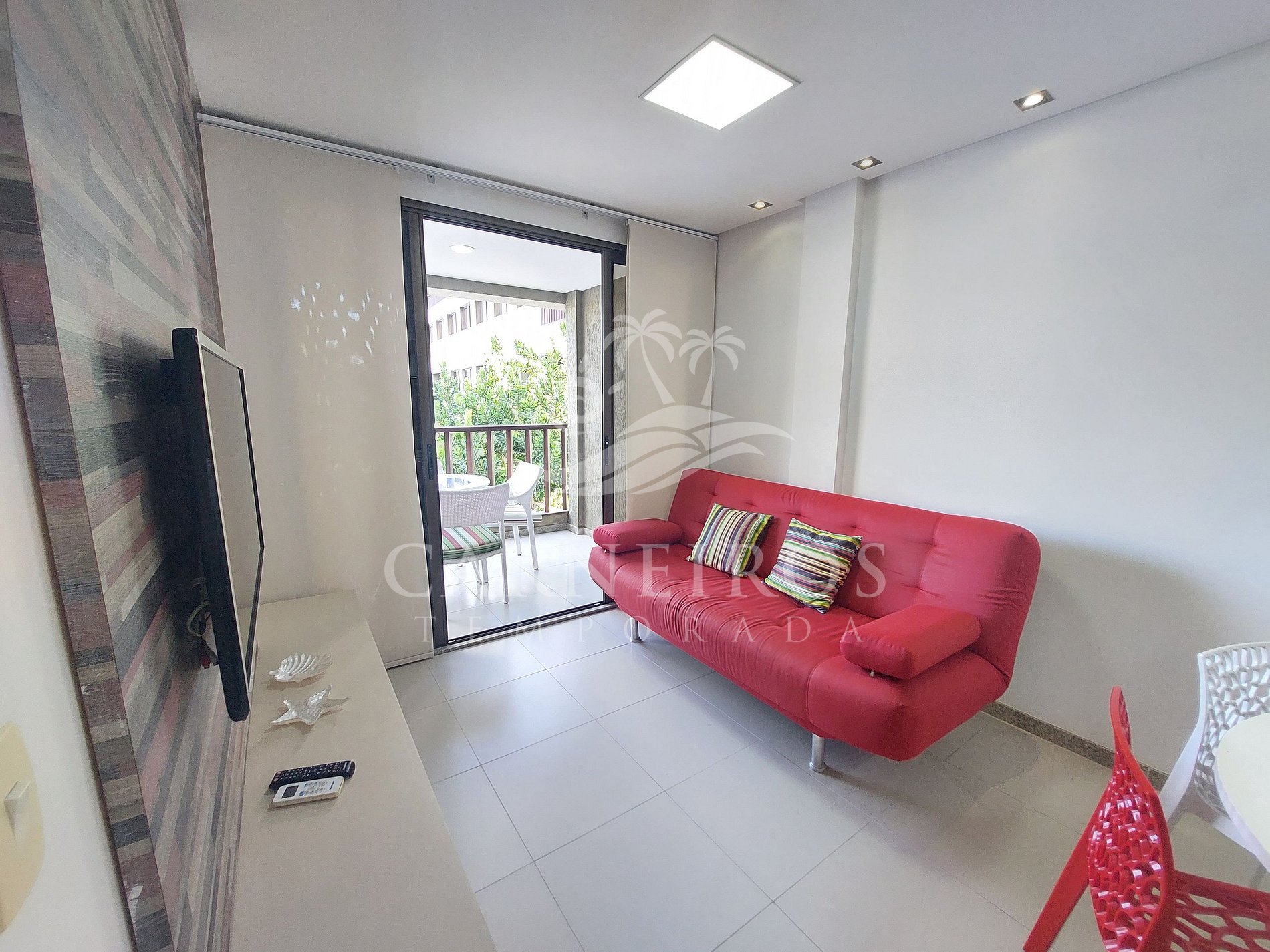 A sala de estar com decoração agradável traz calmaria e conforto, contendo um sofá, TV e ar-condicionado. A cozinha é completa e equipada com os principais utensílios como louça, copos, taças, panelas, talheres, sanduicheira, bebedouro, micro-ondas, cooktop elétrico com 04 bocas, geladeira e outros, além de uma mesa de jantar com 05 cadeiras. Possui também 2 banheiros com ducha quente que atendem às necessidades diárias.