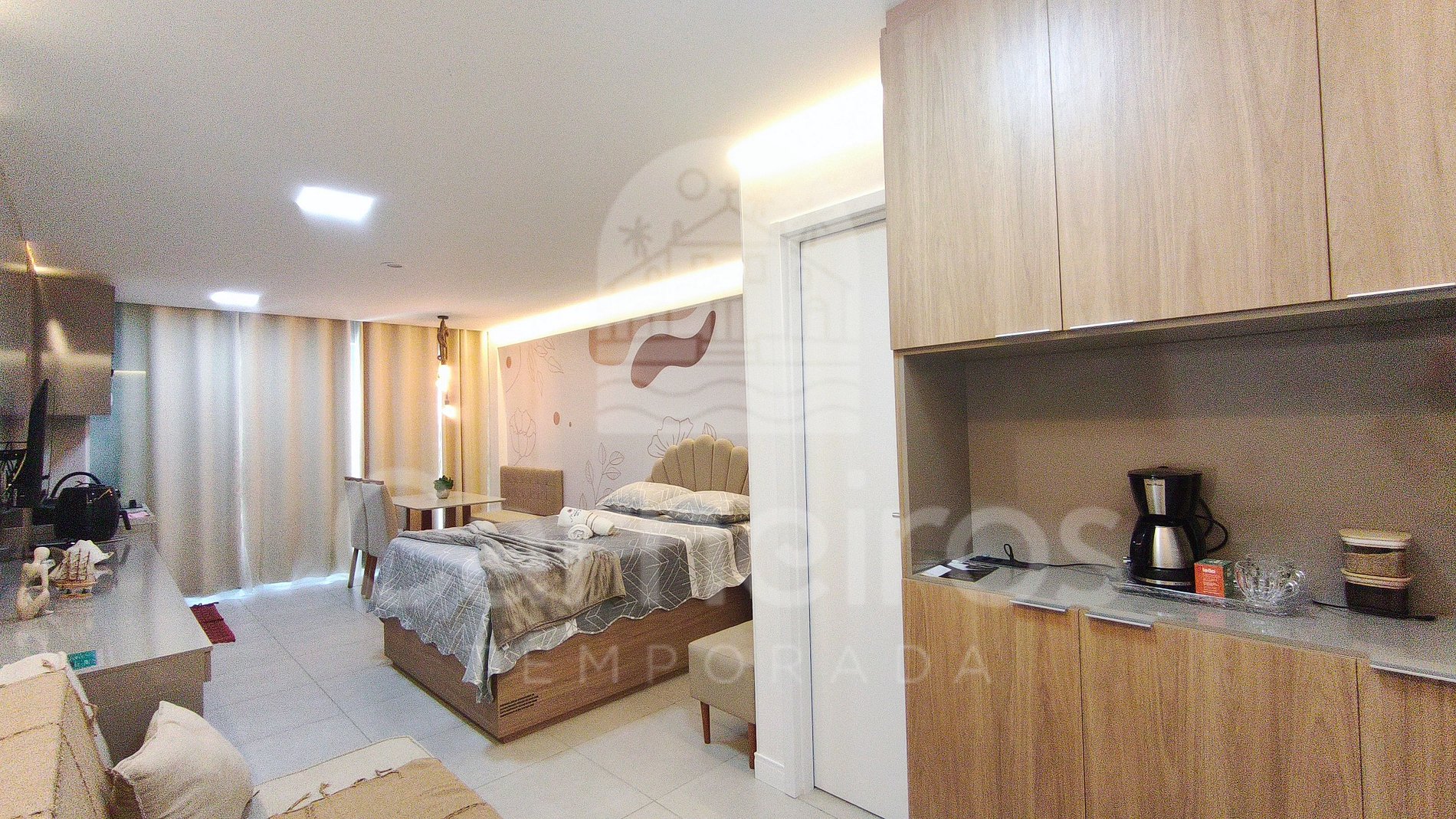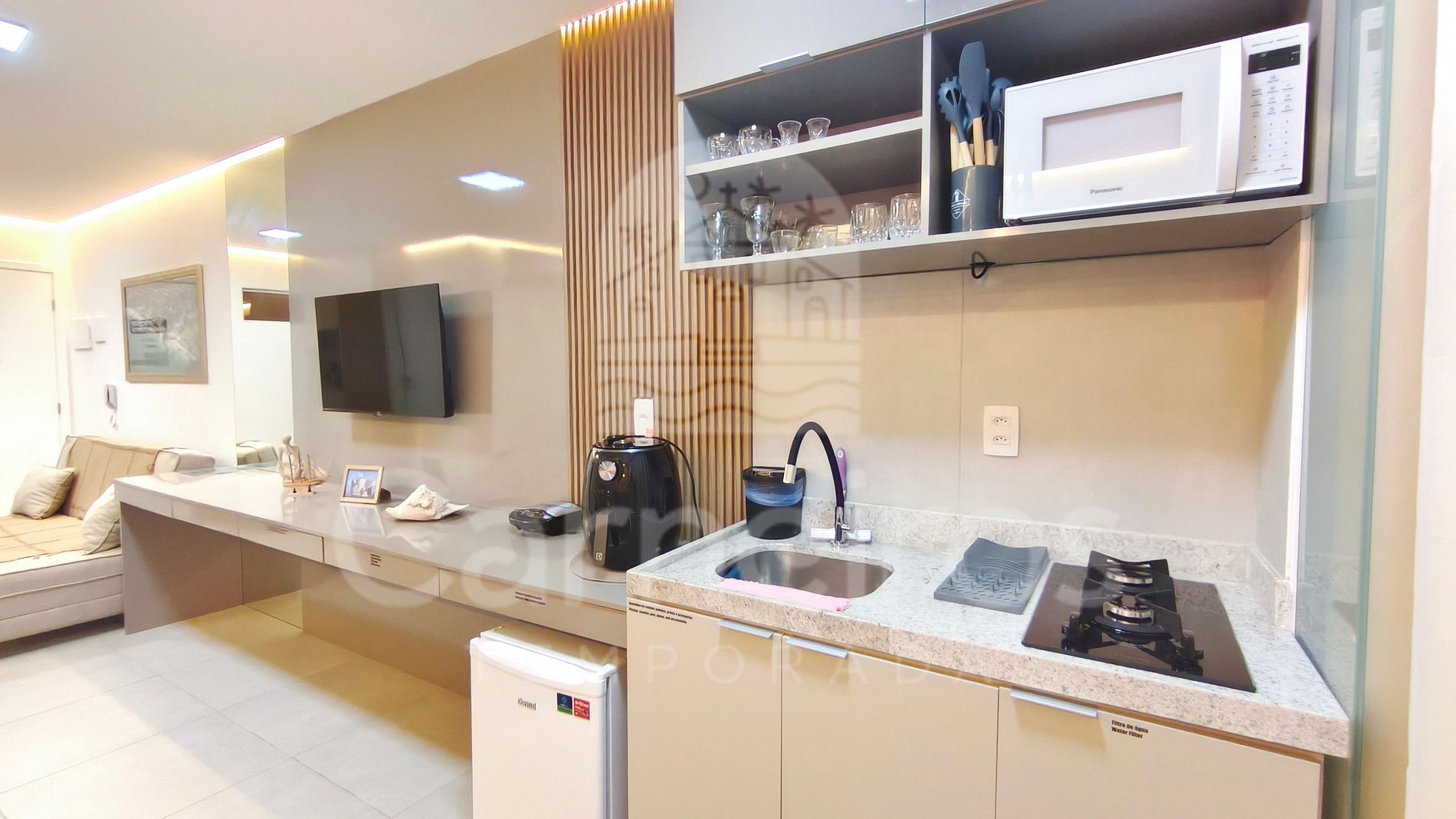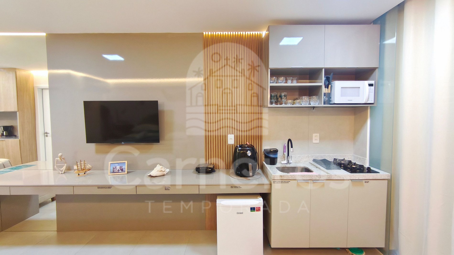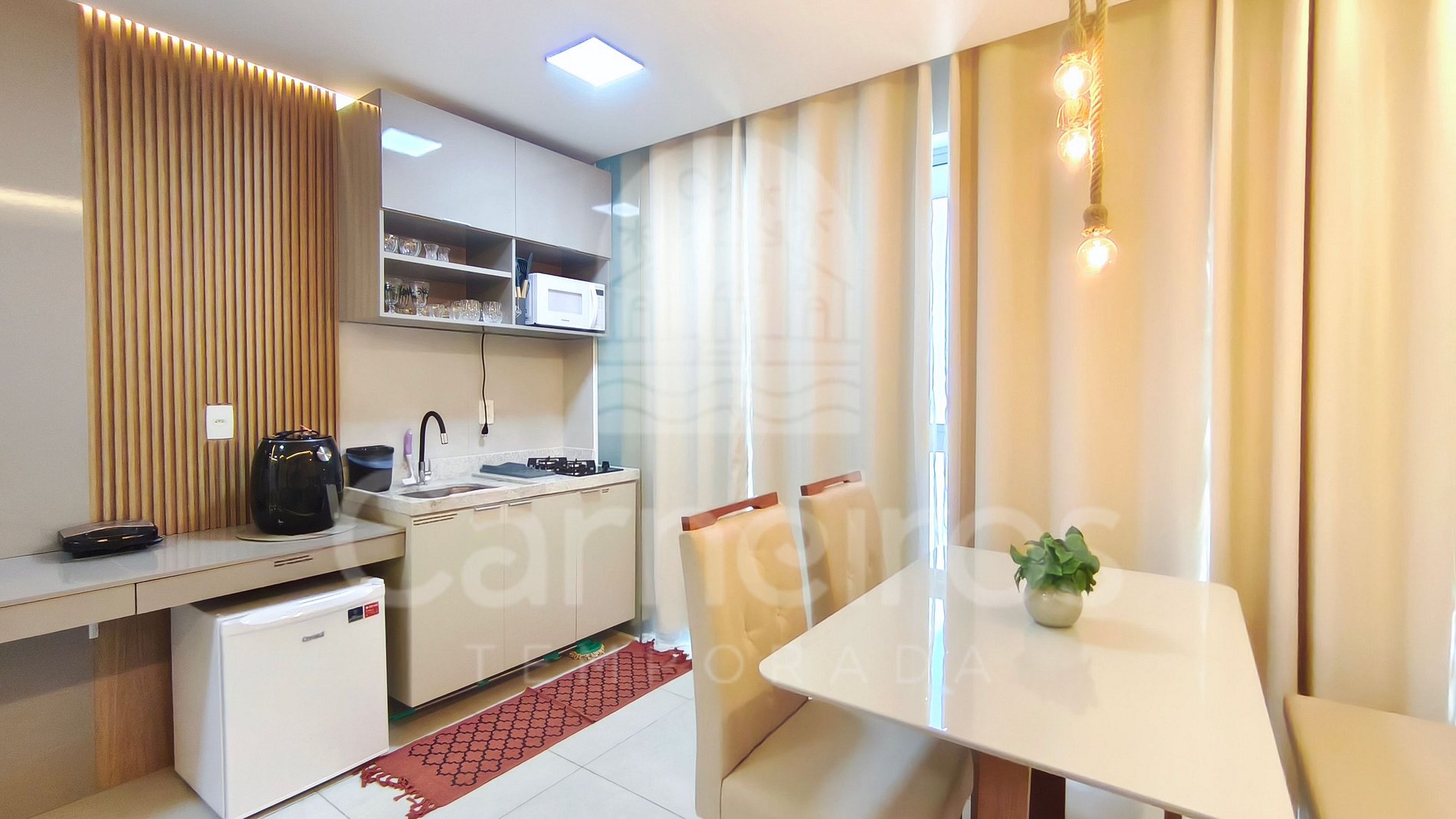 O imóvel conta com uma decoração moderna e possui sofá, TV e ar-condicionado. A cozinha é completa e dispõe de itens como louça, copos, panelas, talheres, micro-ondas, fogão, sanduicheira, frigobar, liquidificador, airfryer e diversos utensílios. Além disso, contém área para refeições com mesa e cadeiras. Possui 01 banheiro completo.