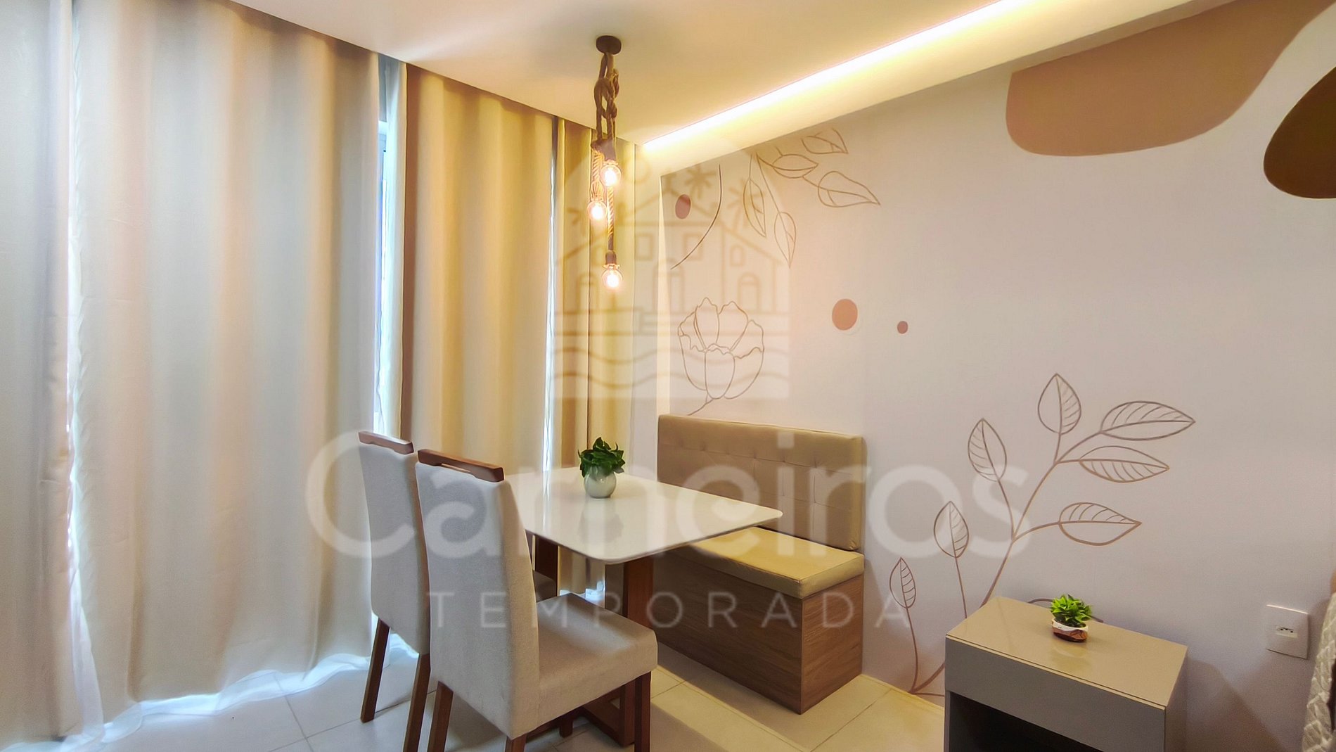 O imóvel conta com uma decoração moderna e possui sofá, TV e ar-condicionado. A cozinha é completa e dispõe de itens como louça, copos, panelas, talheres, micro-ondas, fogão, sanduicheira, frigobar, liquidificador, airfryer e diversos utensílios. Além disso, contém área para refeições com mesa e cadeiras. Possui 01 banheiro completo.