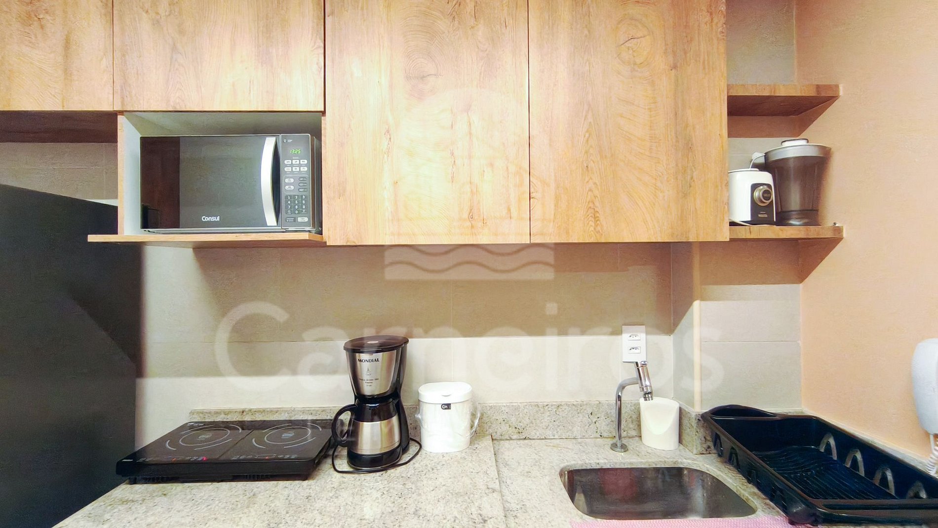 O ambiente integrado possui decoração aconchegante e moderna com camas, TV e ar-condicionado. A cozinha é completa com geladeira, fogão elétrico 2 bocas, micro-ondas, cafeteira elétrica, liquidificador, entre outros utensílios. Também possui um banheiro completo.