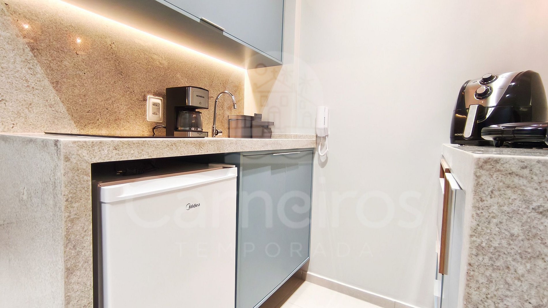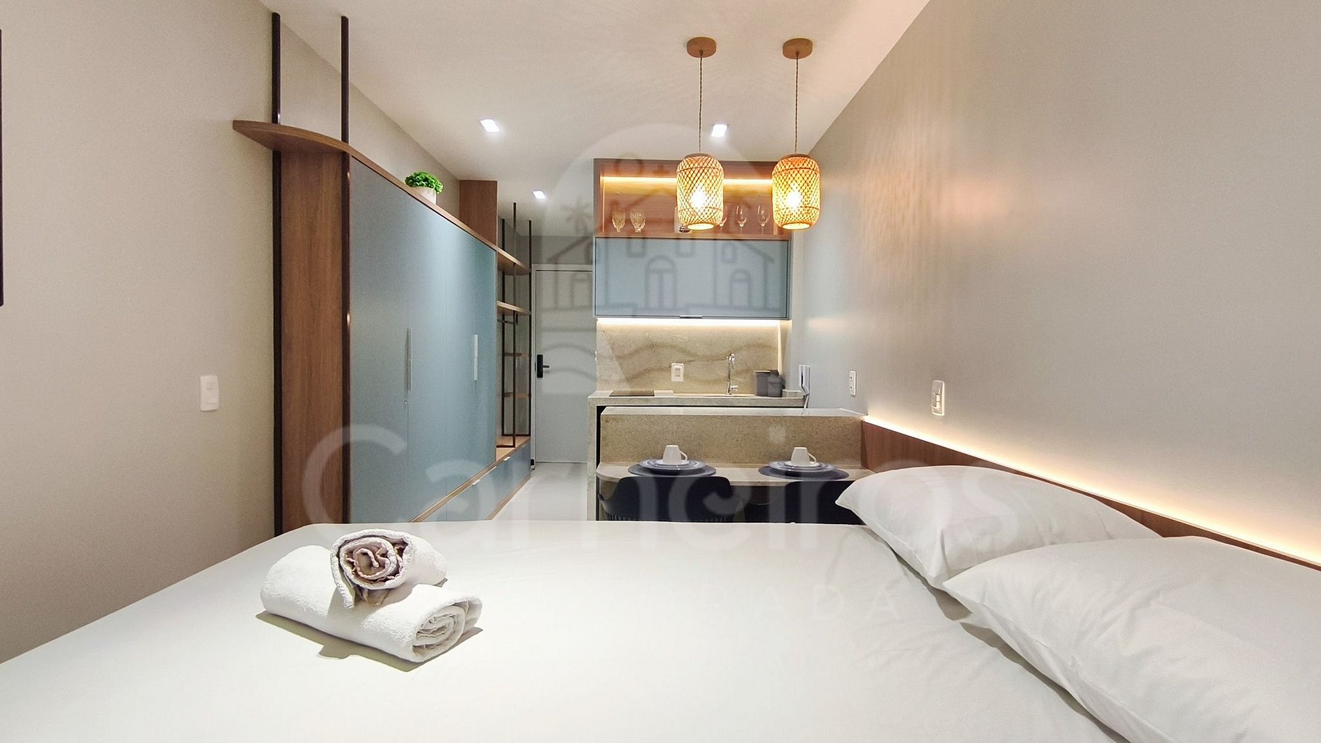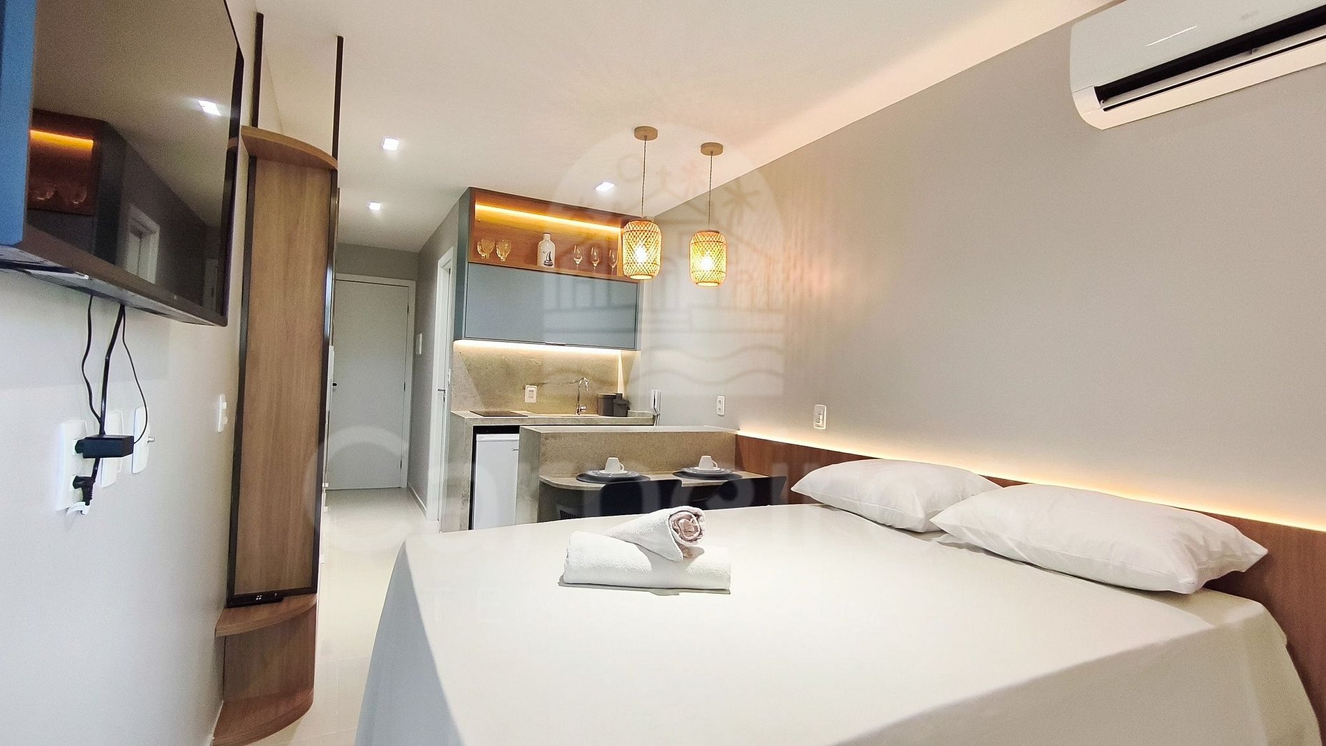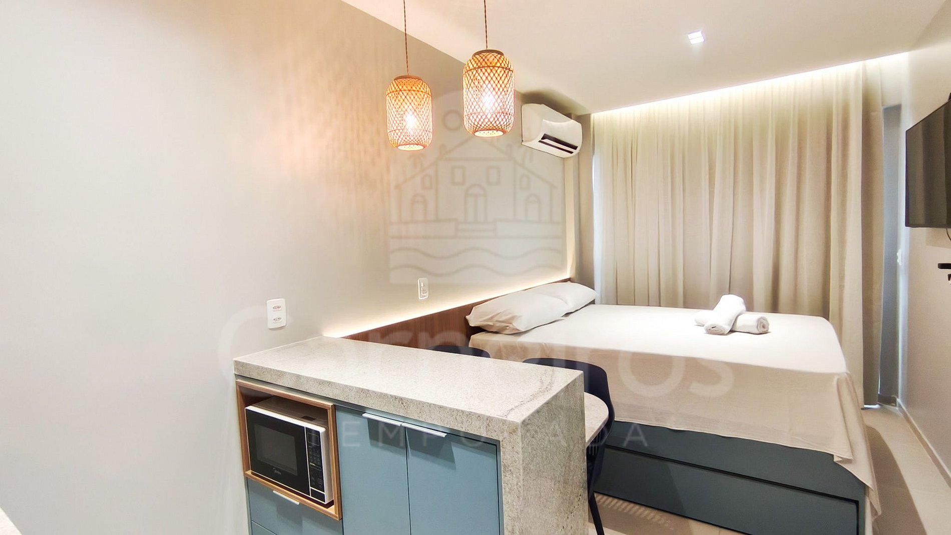 O Studio contém uma TV (com serviço de streaming), ar-condicionado e cama. A cozinha conta com bancada para reifeição e é equipada com os principais itens como louça, copos, talheres, fogão cooktop 2 bocas, maquina de café, airfryer, micro-ondas, liquidificador, sanduicheira e frigobar. A acomodação possui 01 banheiro completo.