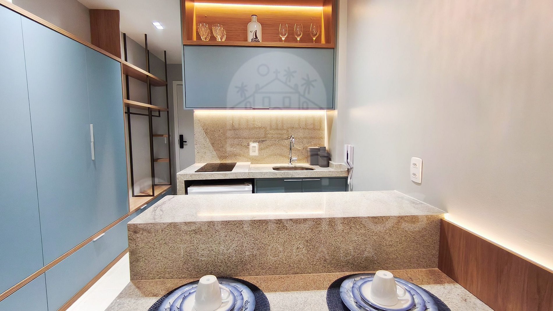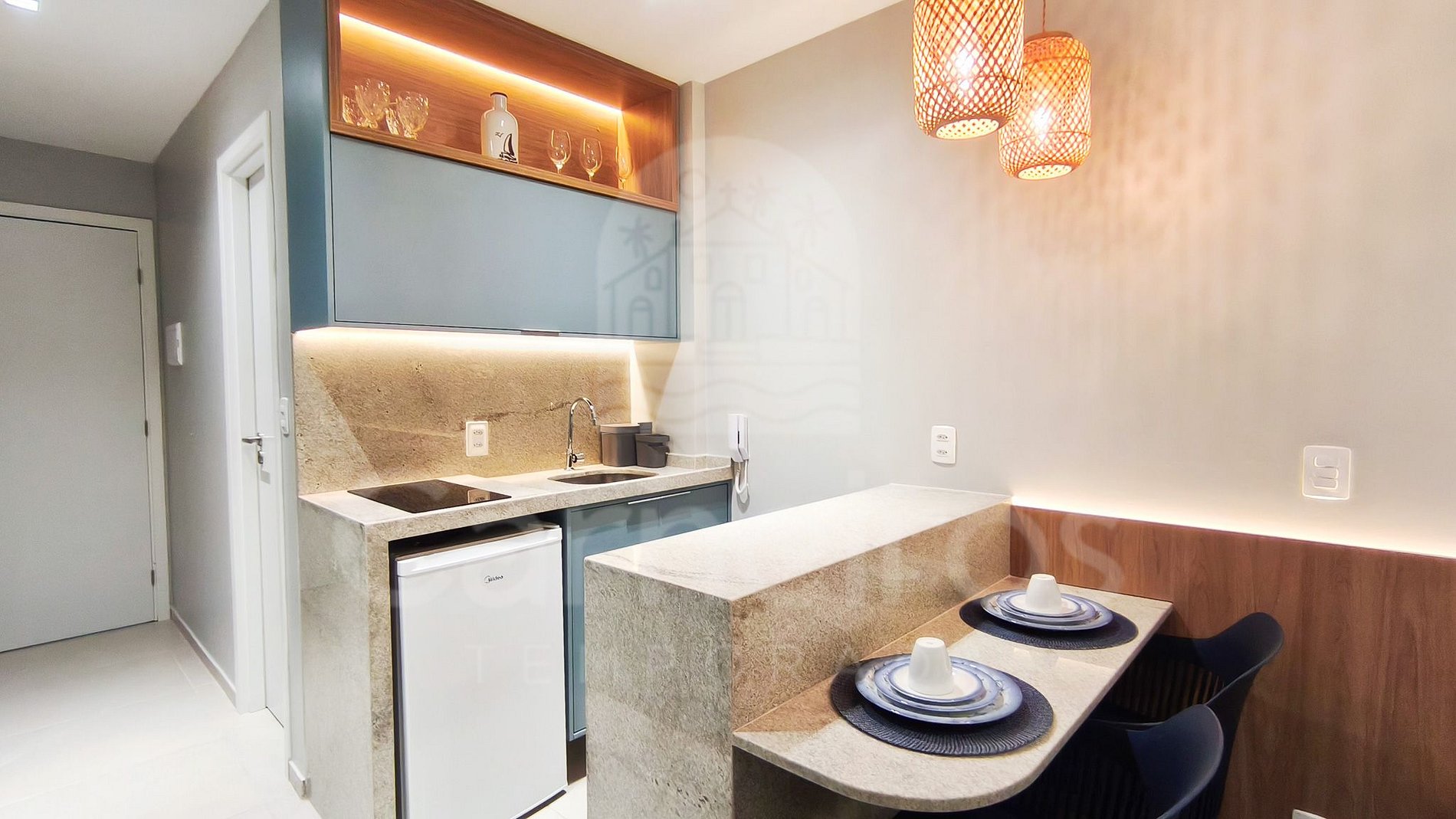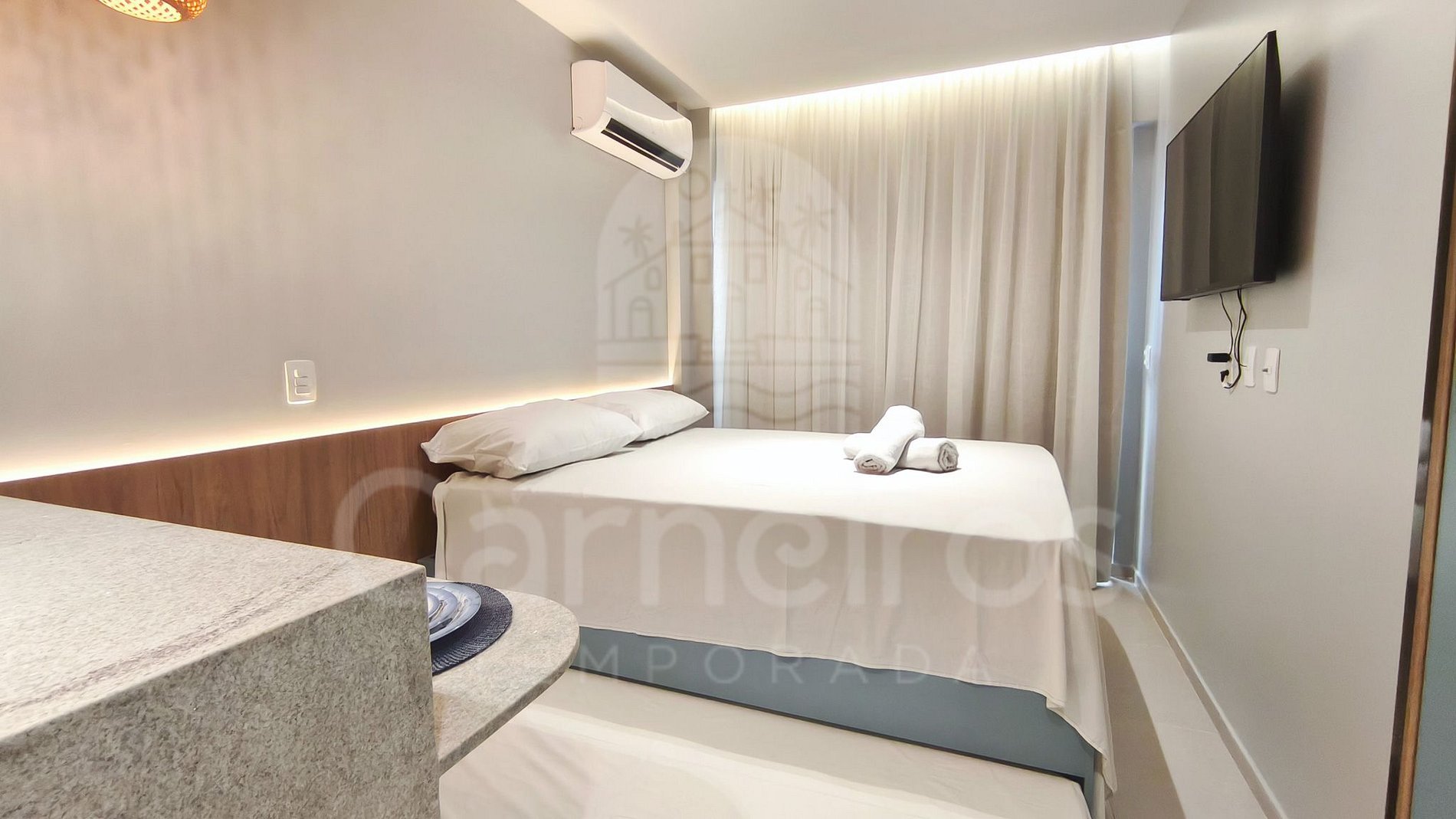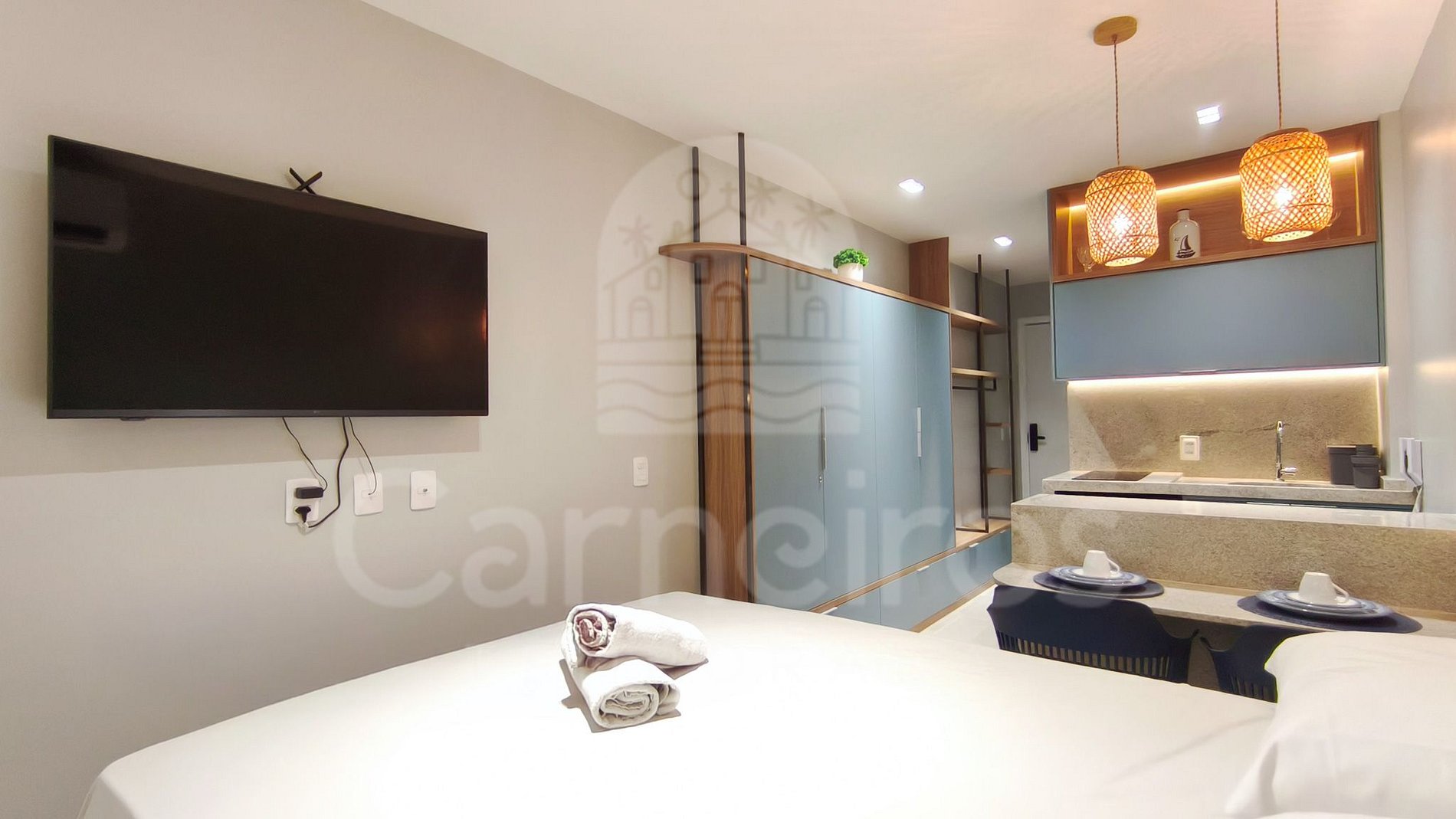 O Studio contém uma TV (com serviço de streaming), ar-condicionado e cama. A cozinha conta com bancada para reifeição e é equipada com os principais itens como louça, copos, talheres, fogão cooktop 2 bocas, maquina de café, airfryer, micro-ondas, liquidificador, sanduicheira e frigobar. A acomodação possui 01 banheiro completo.