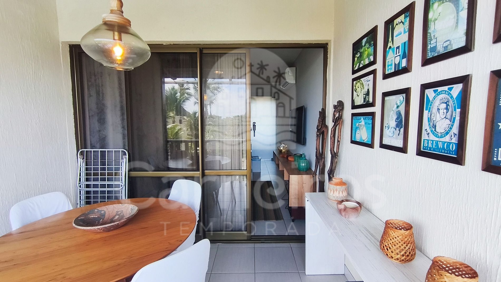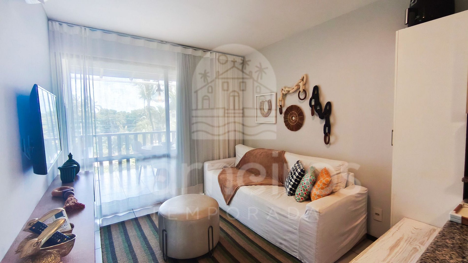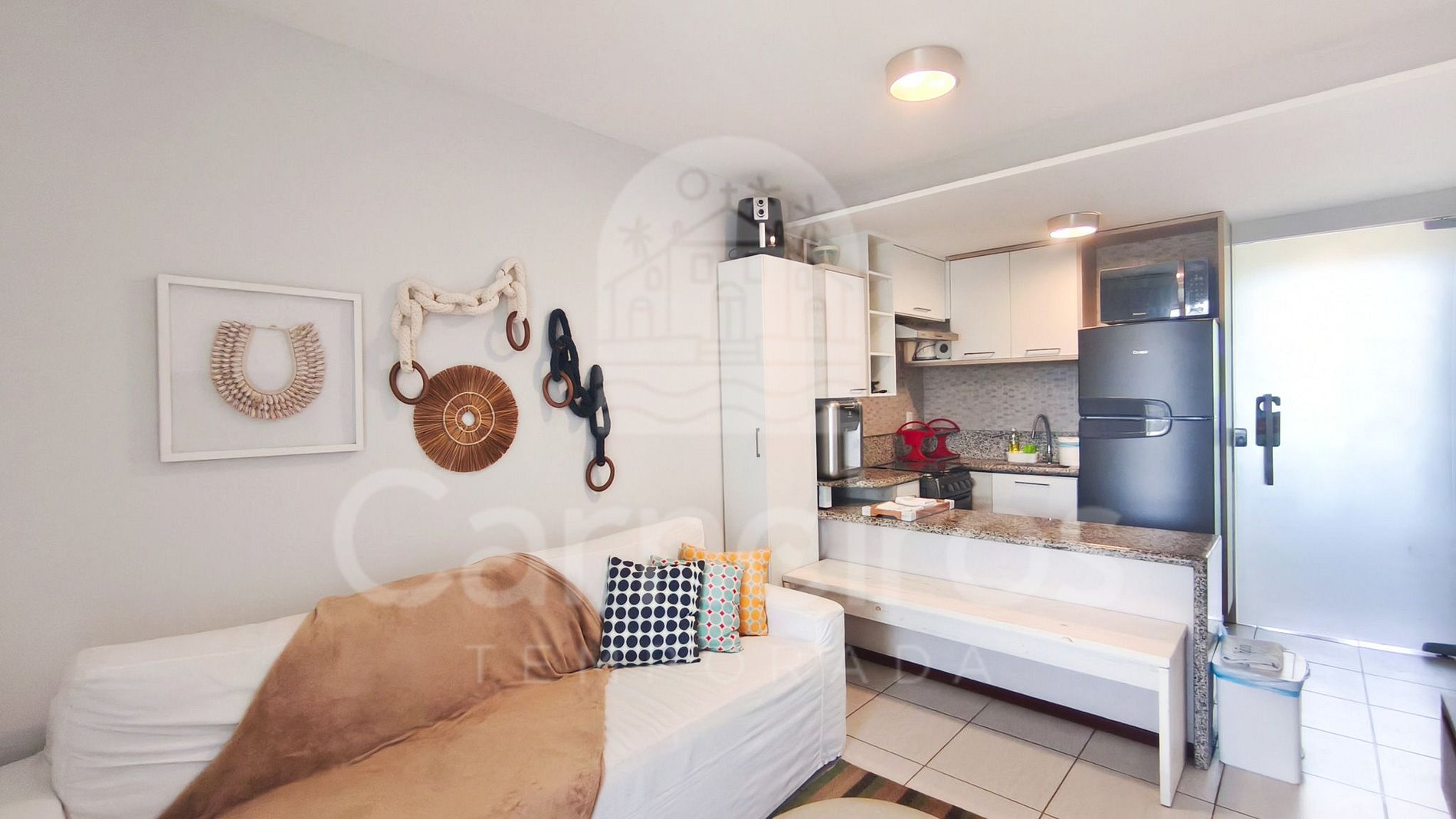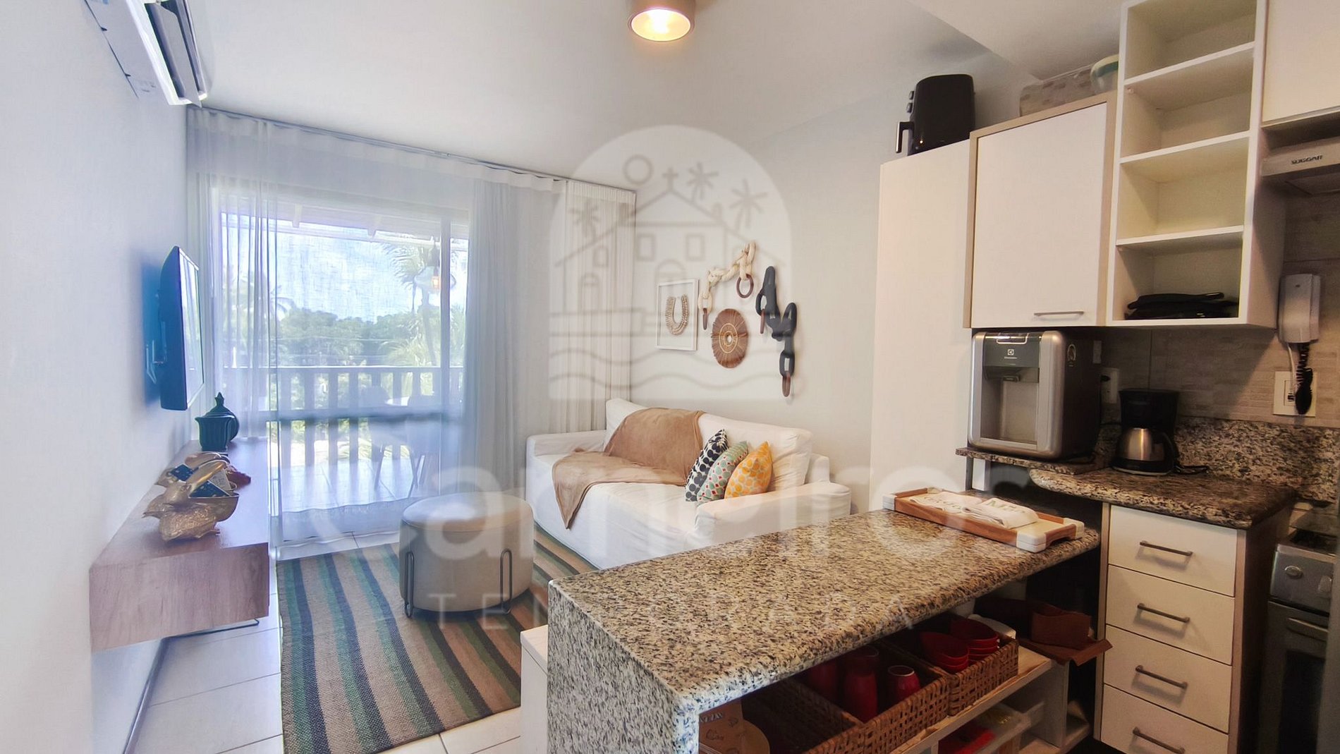 A sala de estar, que conta com uma decoração agradável e moderna, traz sofá, TV e ar-condicionado. A cozinha é completa e equipada com os principais utensílios, como louça, copos, panelas, talheres, sanduicheira, micro-ondas, fogão, forno, liquidificador, geladeira, cafeteira e outros. Possui também 2 banheiros completos.