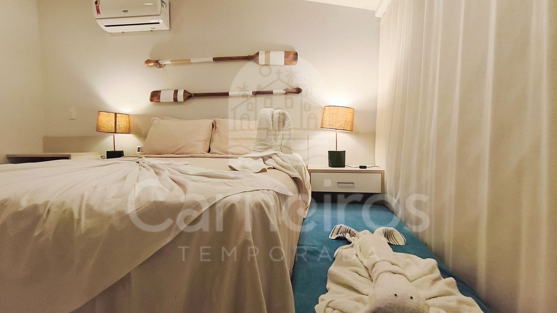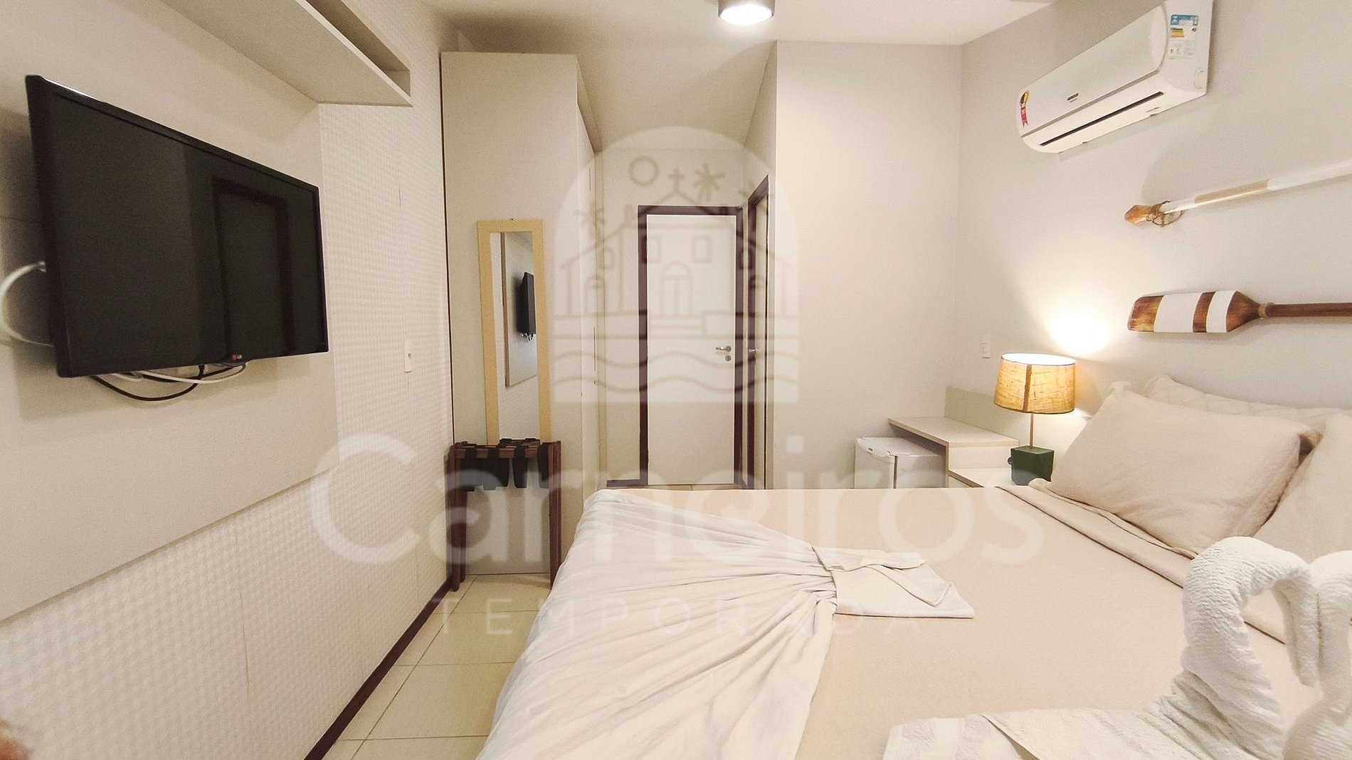 - Suíte: 1 cama Queen + 1 bicama de solteiro, frigobar, TV, ar-condicionado, armário e banheiro;