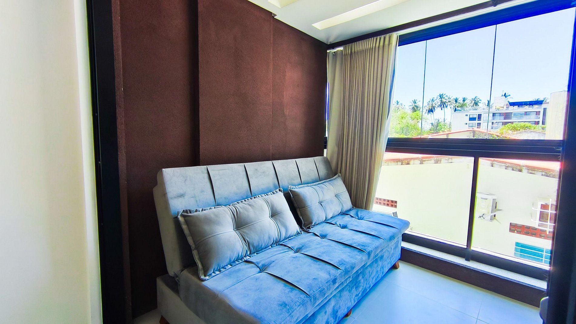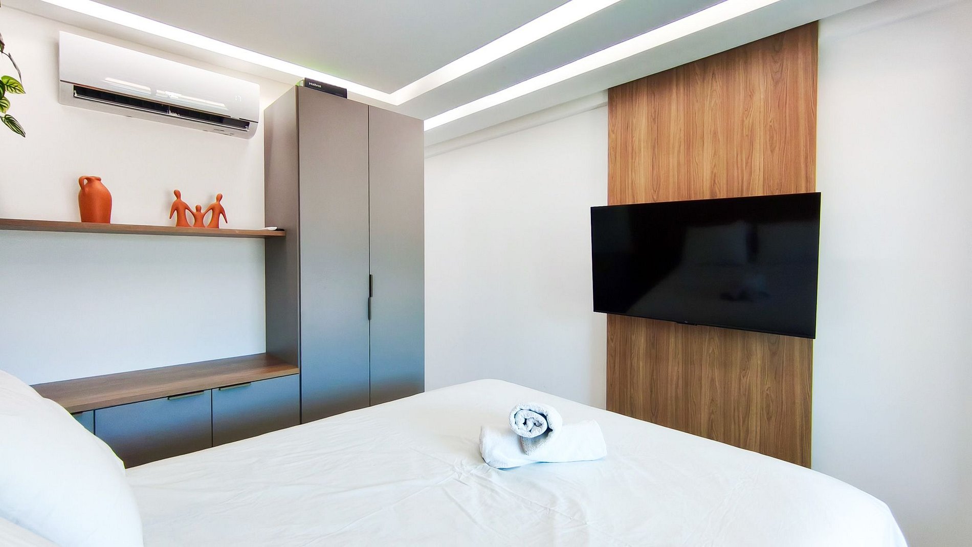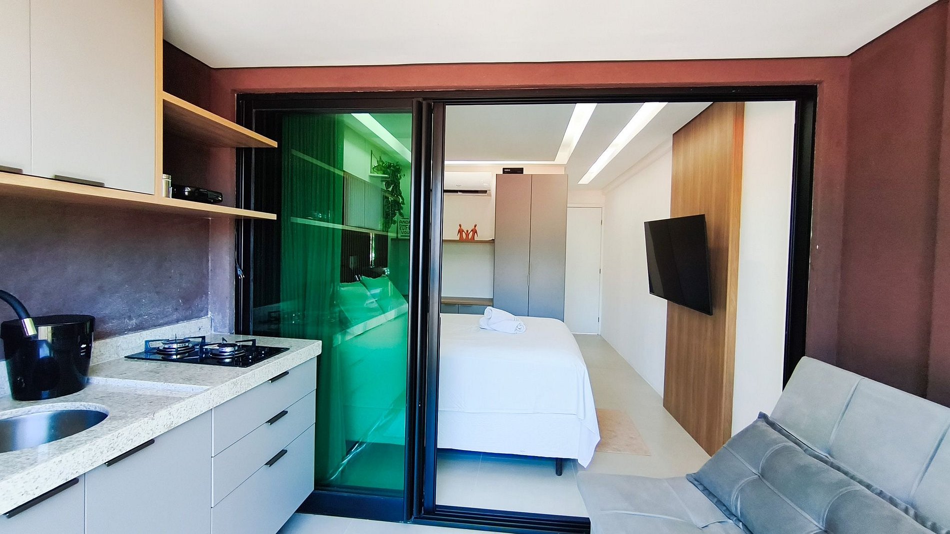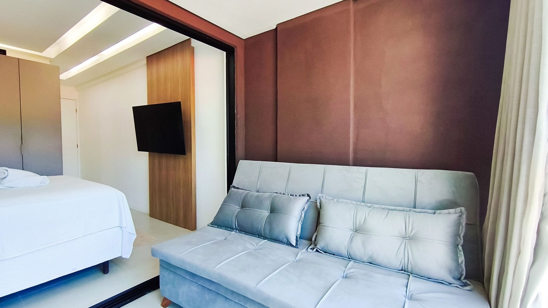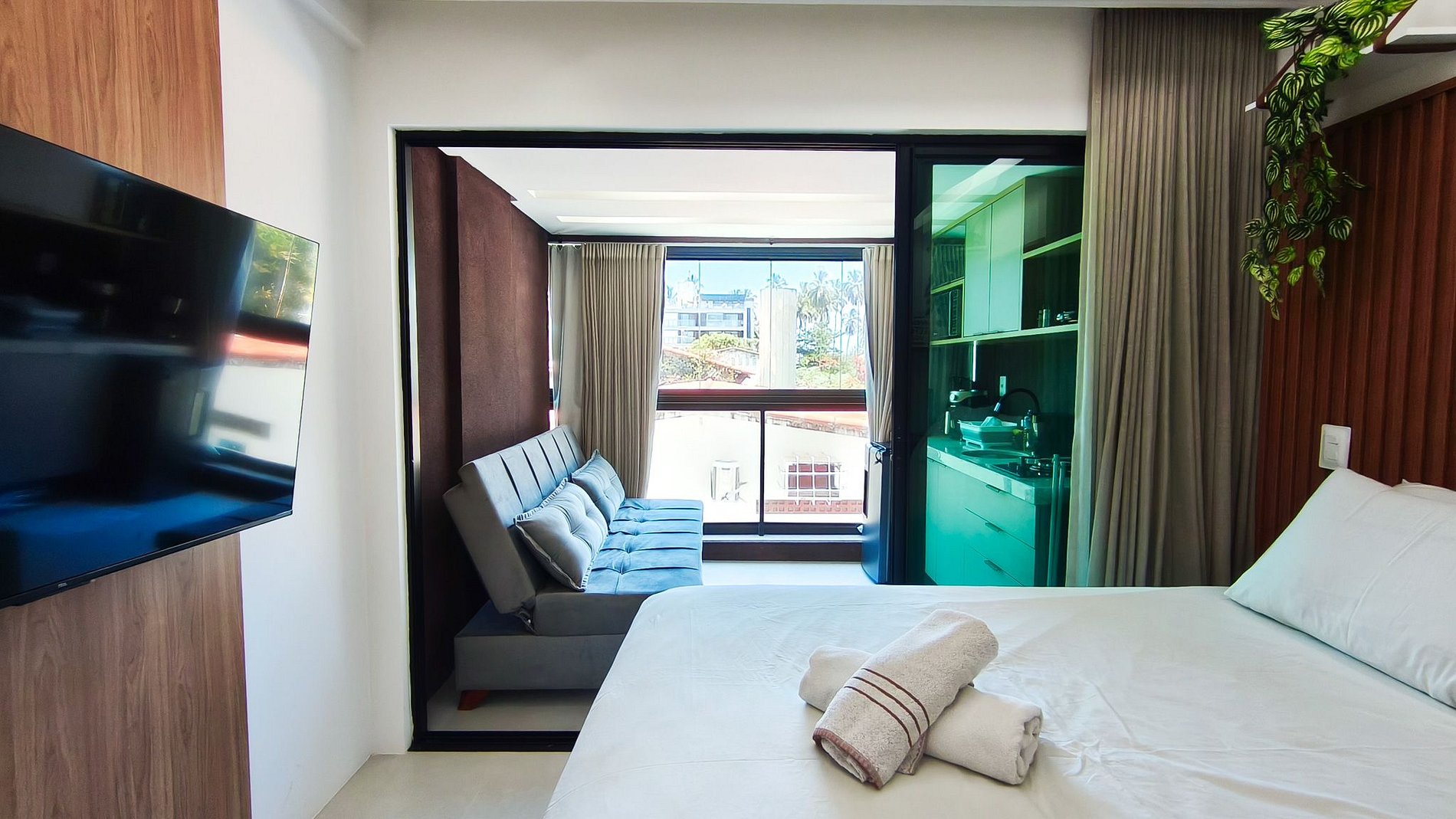 - Estúdio: 1 cama de Queen + 01 sofá-cama casal, TV, armário e ar-condicionado;