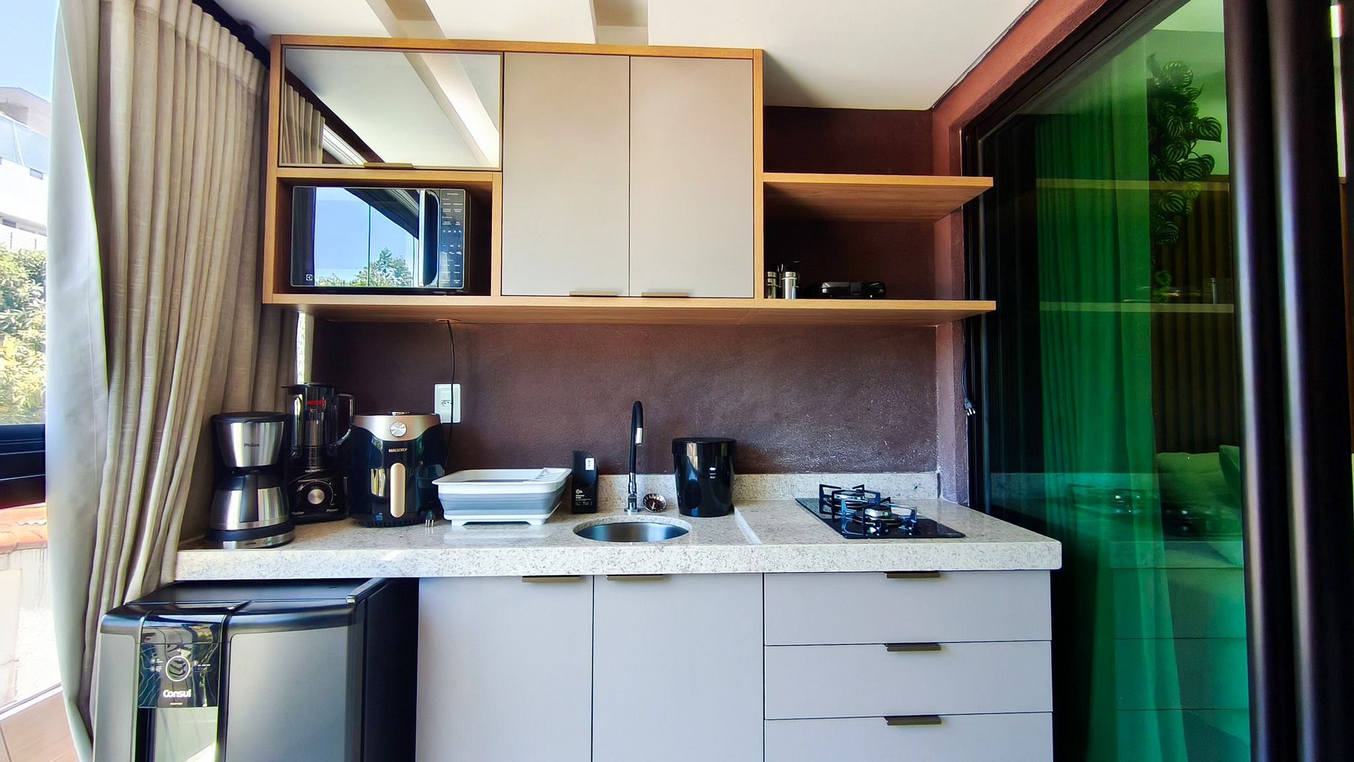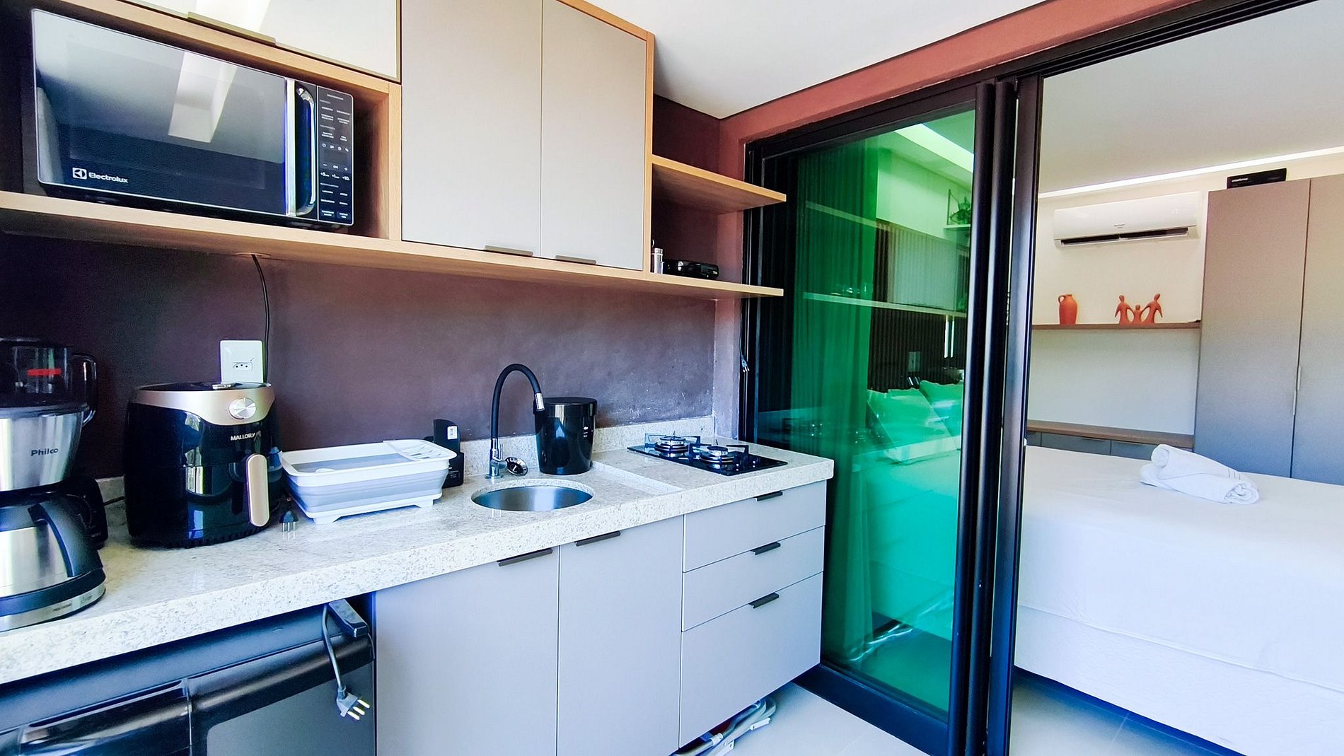 No ambiente integrado você encontrará uma decoração moderna, TV (com serviço de streaming), cama Queen, sofá, armário e ar-condicionado. A cozinha é completa e possui diversas comodidades como louça, copos, panelas, talheres, airfryer, micro-ondas, fogão cooktop 02 bocas, frigobar, cafeteira e diversos utensílios. O imóvel possui 01 banheiro completo.