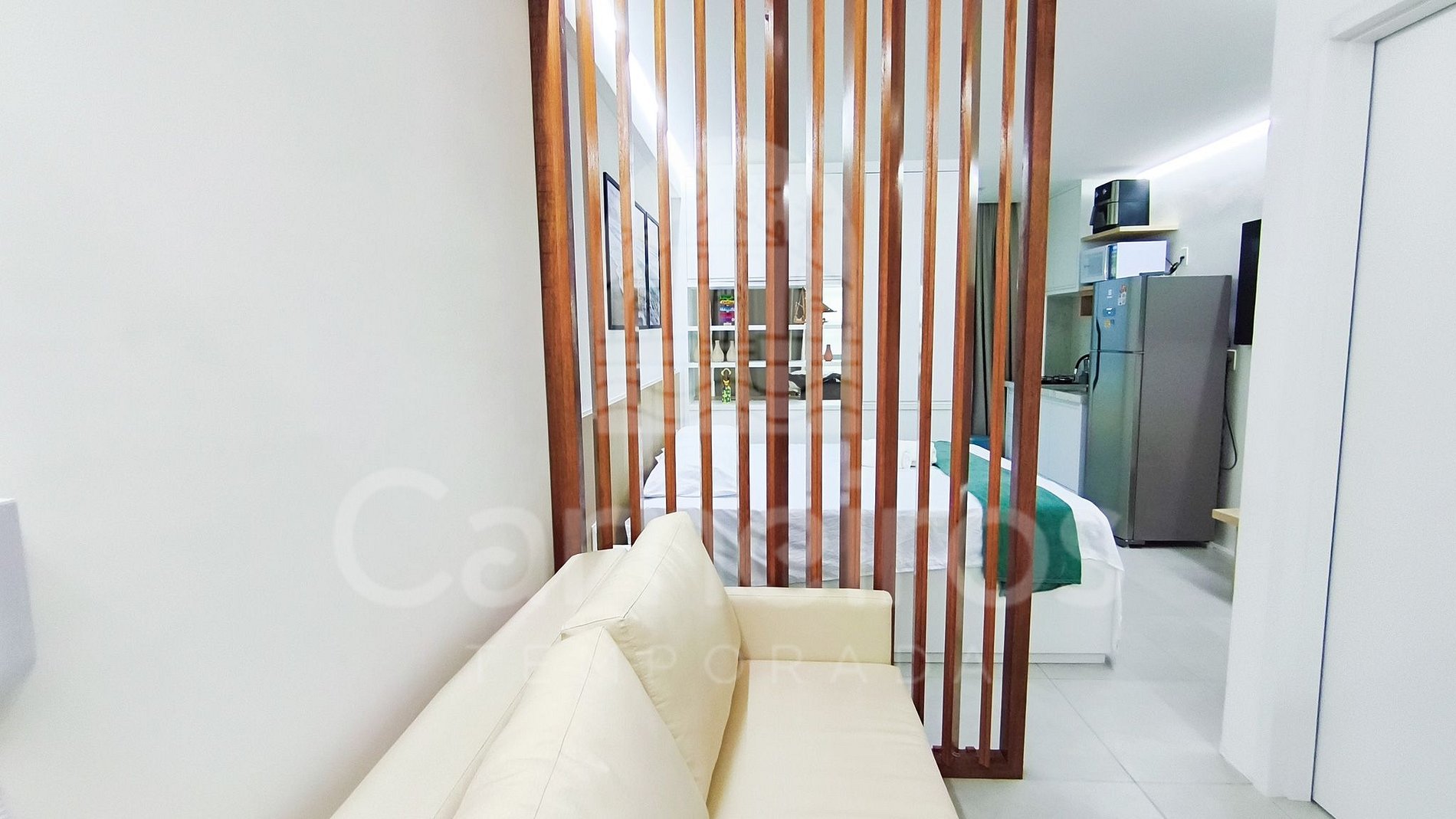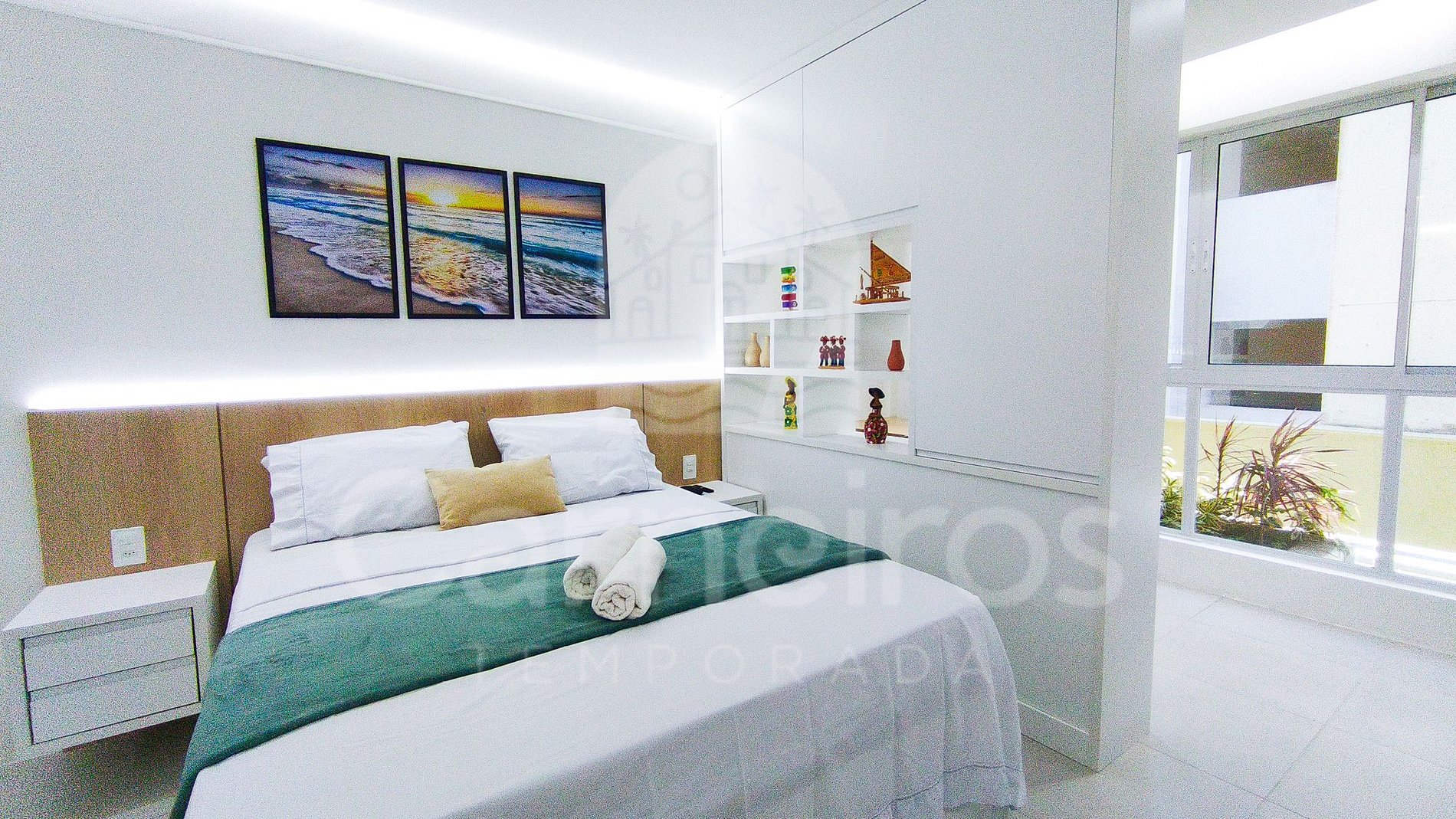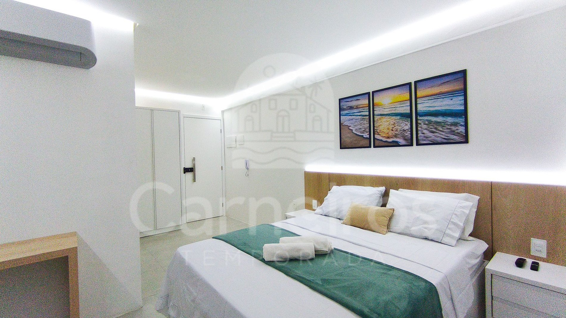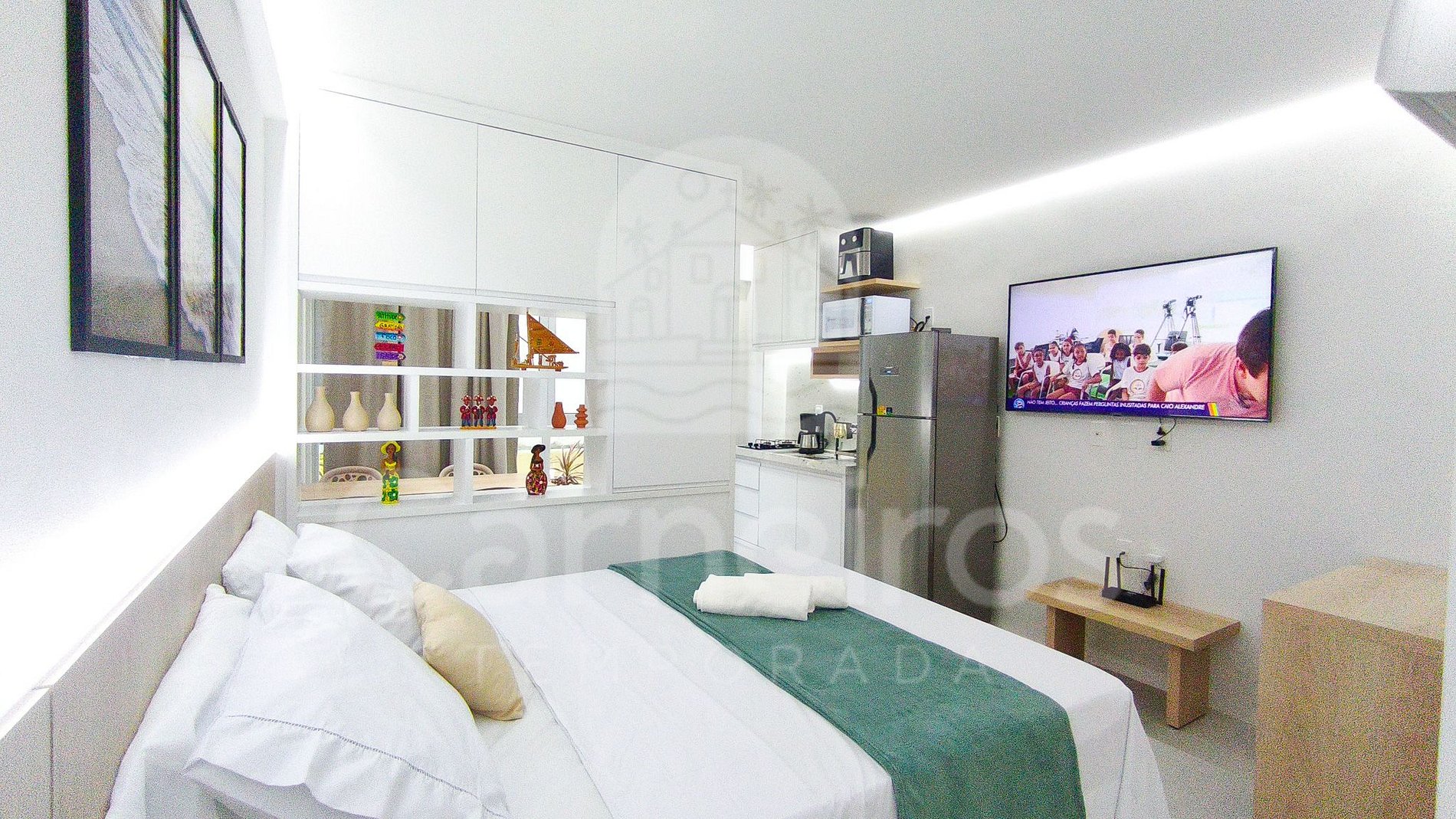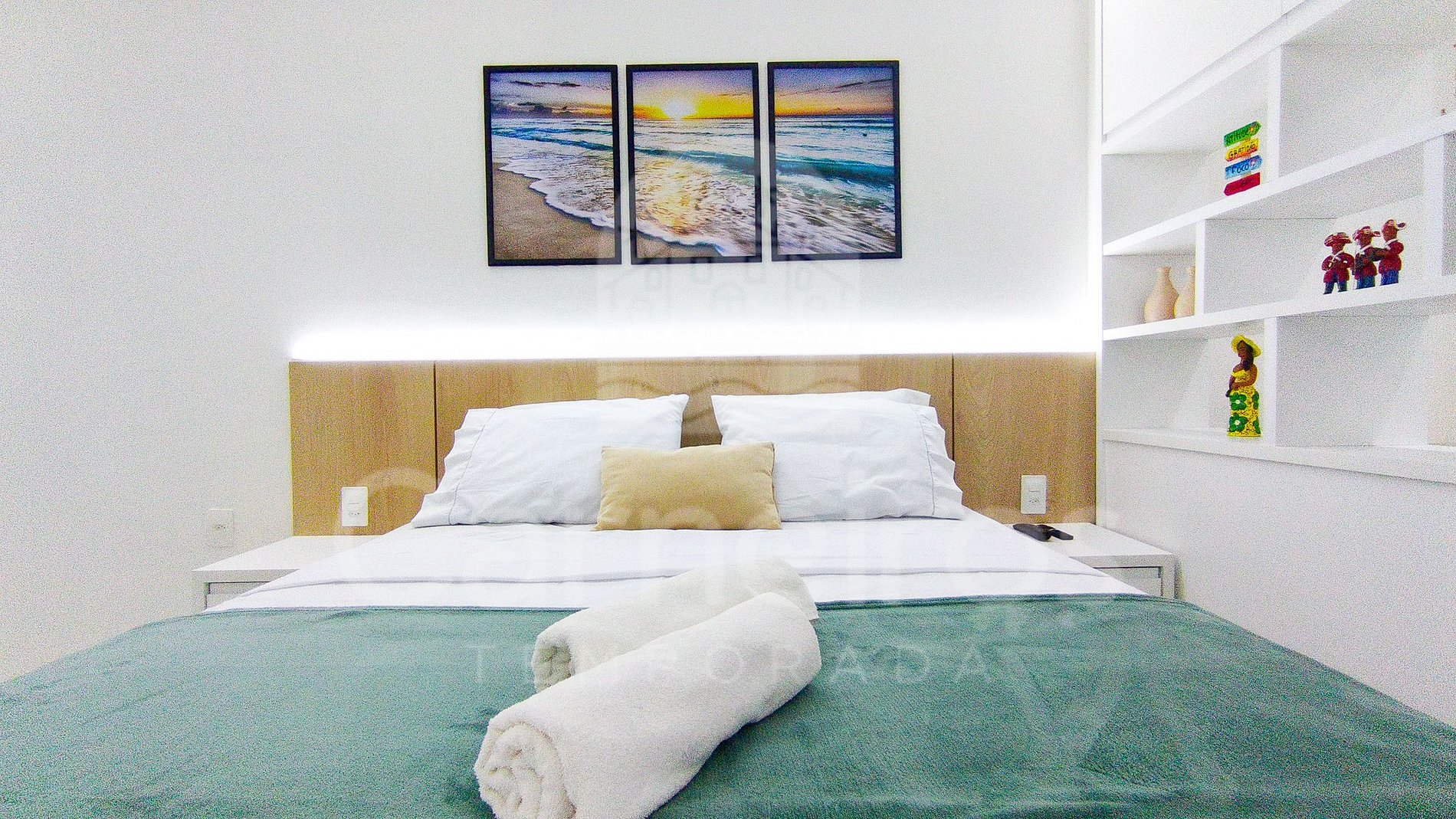O imóvel conta com uma decoração moderna, TV, armário, cama Queen, espaço para refeições e ar-condicionado. A cozinha é completa e dispõe de itens como louça, copos, panelas, talheres, geladeira, micro-ondas, fogão, sanduicheira, cafeteira, liquidificador, airfryer e diversos utensílios. Possui 01 banheiro completo.