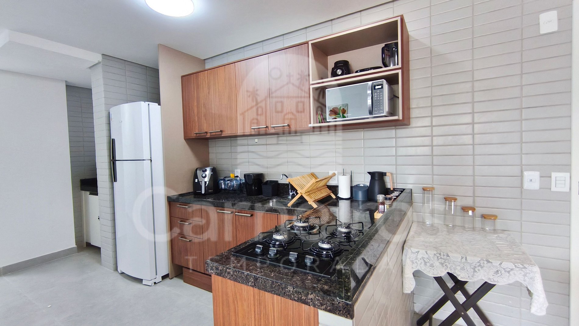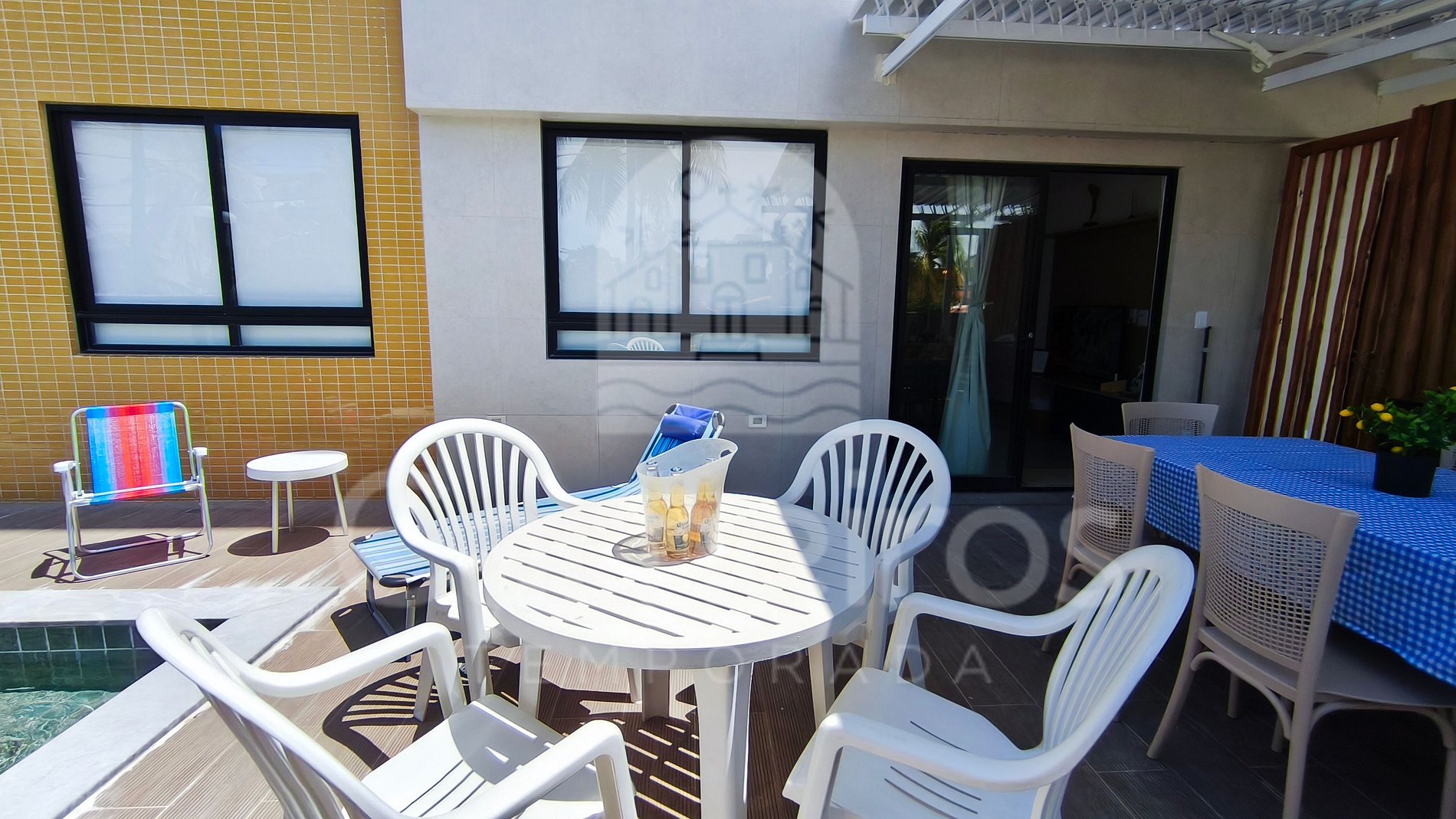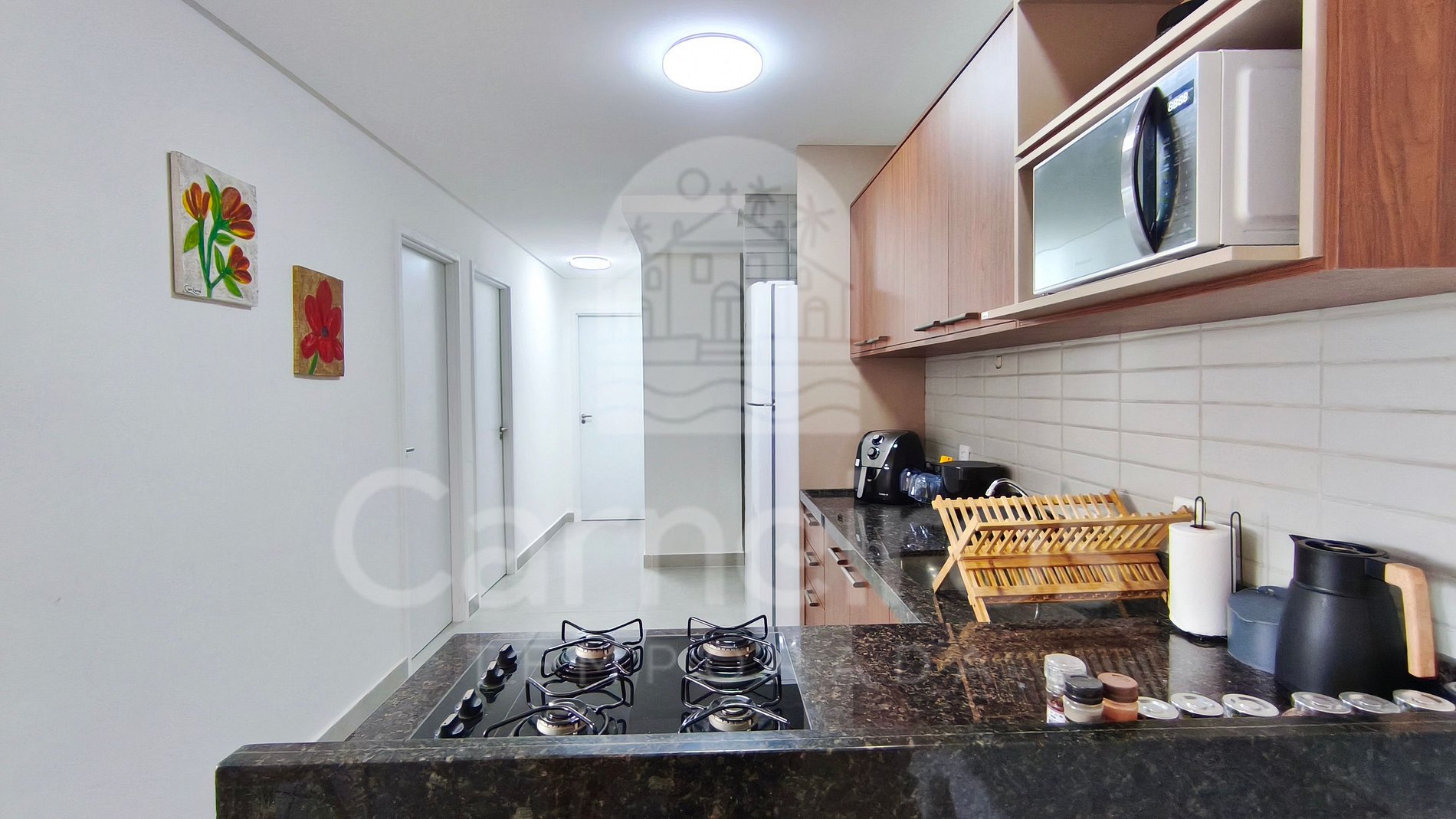 A sala de estar, com uma decoração moderna e agradável, conta com TV, sofá-cama e ar-condicionado. A cozinha é completa e equipada com os principais itens como louça, copos, panelas, talheres, geladeira, fogão, forno, micro-ondas, liquidificador, sanduicheira, cafeteira, airfryer, botijão de água/purificador, freezer horizontal e diversos utensílios. O apartamento possui espaço interno para refeições com mesa de jantar e 4 cadeiras e um externo com mesa e 6 cadeiras. O imóvel contém 2 banheiros completos.