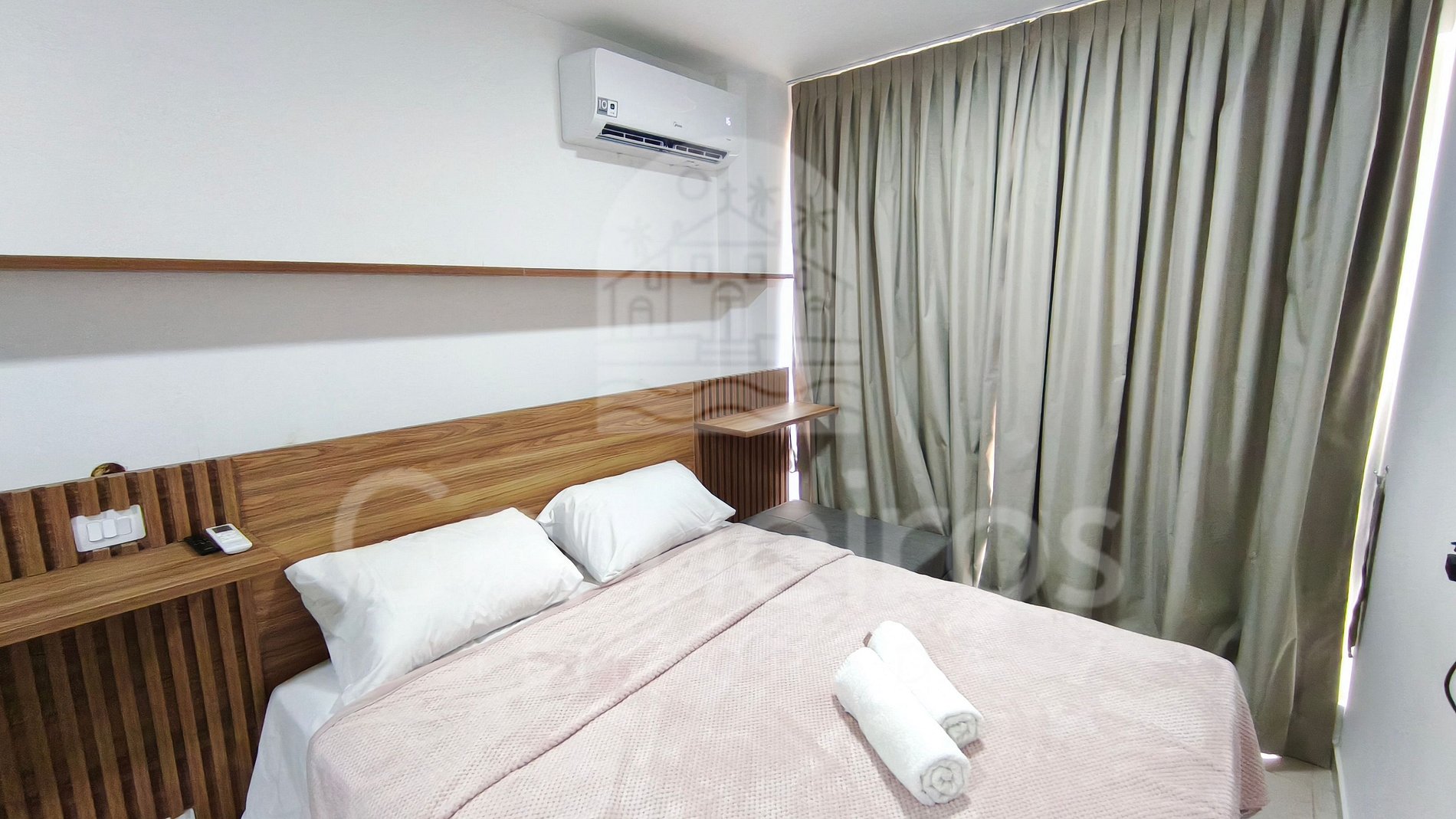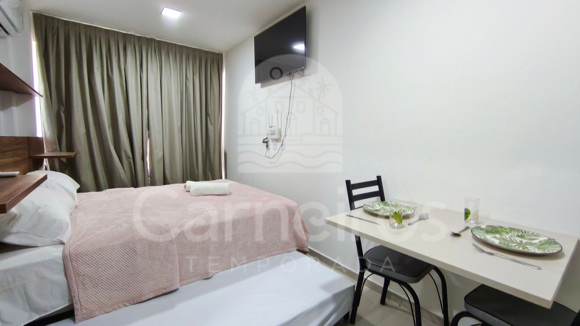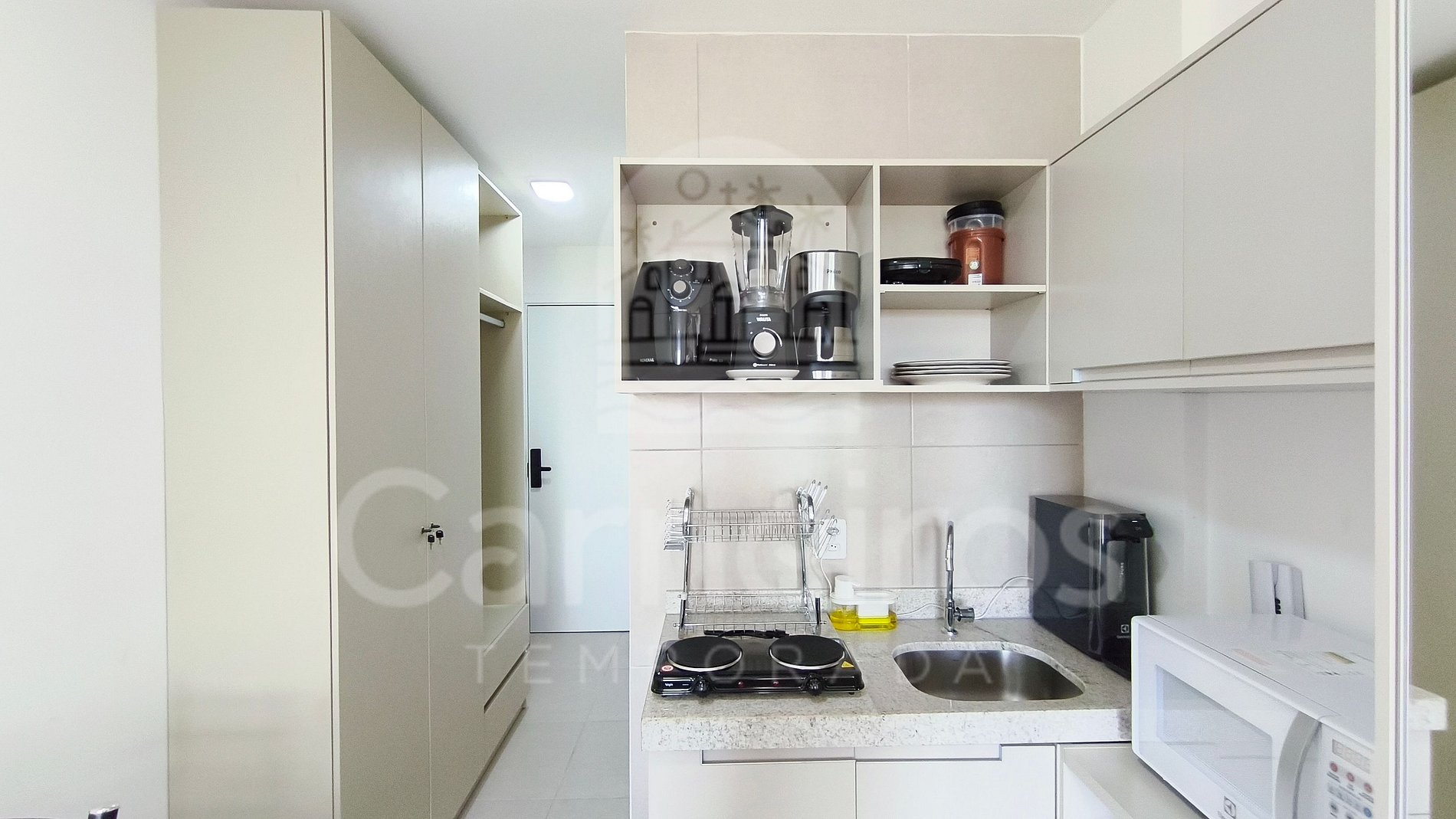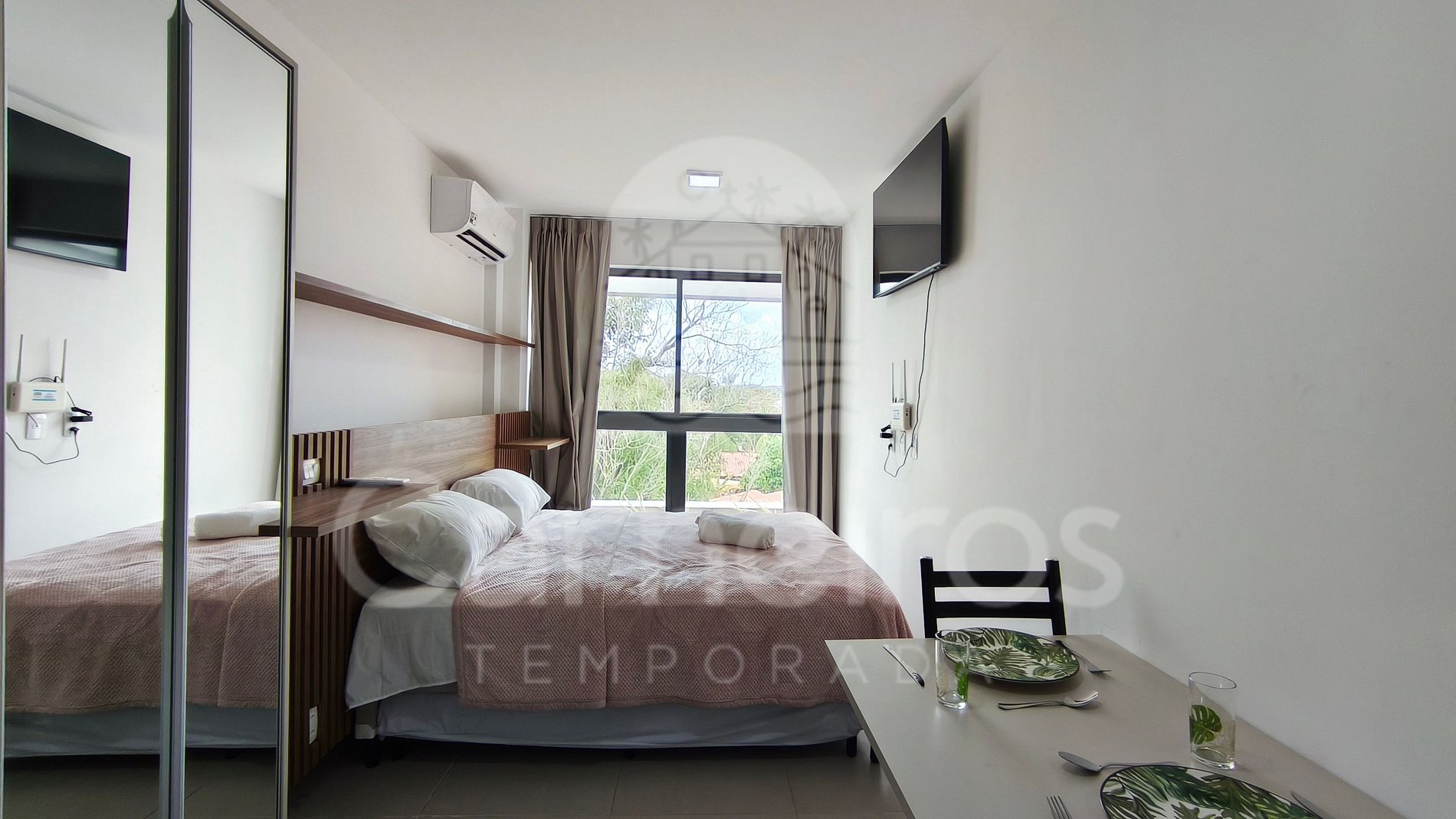 O Studio contém uma TV (com serviço de streaming), ar-condicionado e cama. A cozinha conta com bancada para reifeição e é equipada com os principais itens como louça, copos, talheres, fogão elétrico 2 bocas, maquina de café, airfryer, micro-ondas, liquidificador, sanduicheira e frigobar. A acomodação possui 01 banheiro completo.