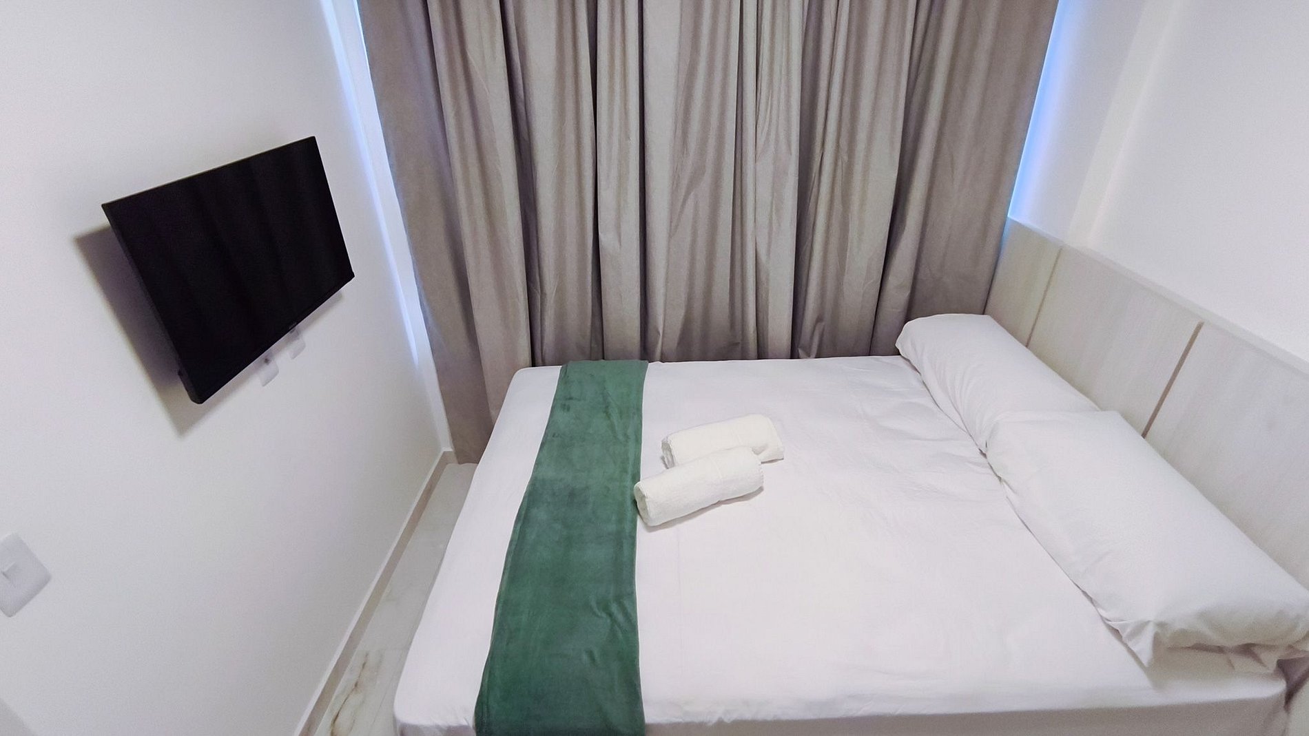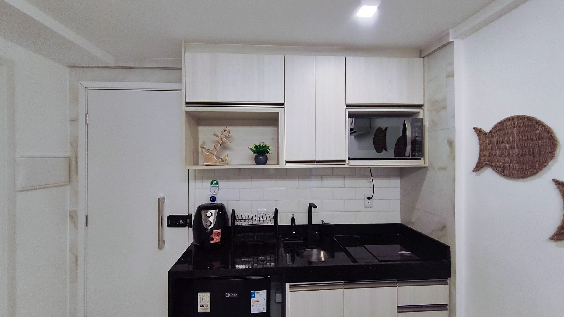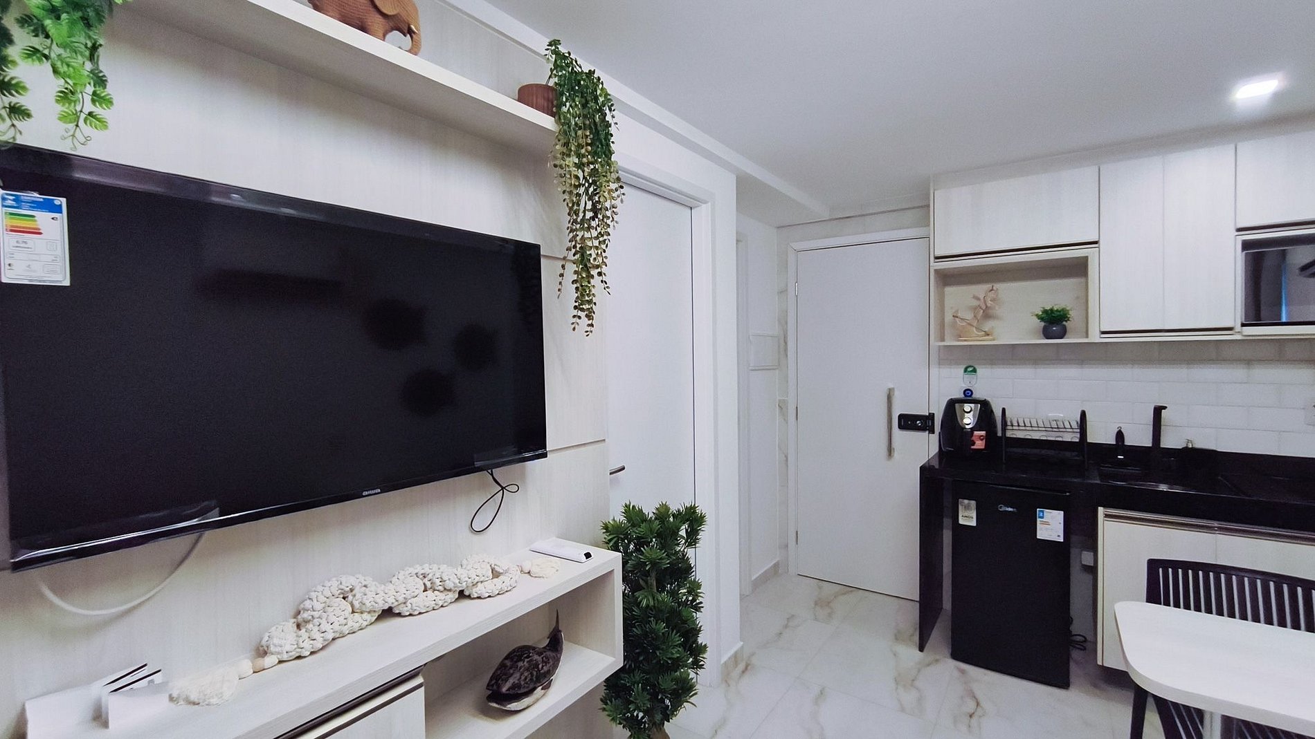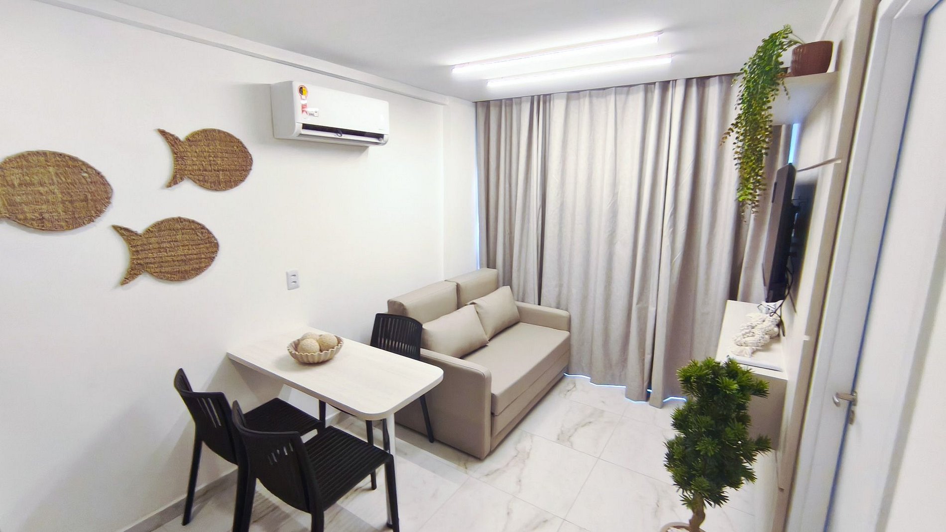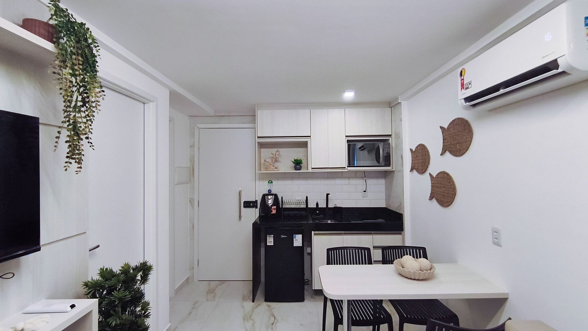 ✹ O flat se encontra no segundo andar do prédio. A sala tem uma agradável decoração minimalista com TV, sofá-cama de casal e ar-condicionado. A cozinha é completa e equipada com os principais utensílios como geladeira, micro-ondas, fogão 02 bocas, liquidificador, sanduicheira e outros, contando também com uma mesa e 02 cadeiras. Possui também 1 banheiro social com box, armário e chuveiro quente à gás, além do banheiro da suíte.