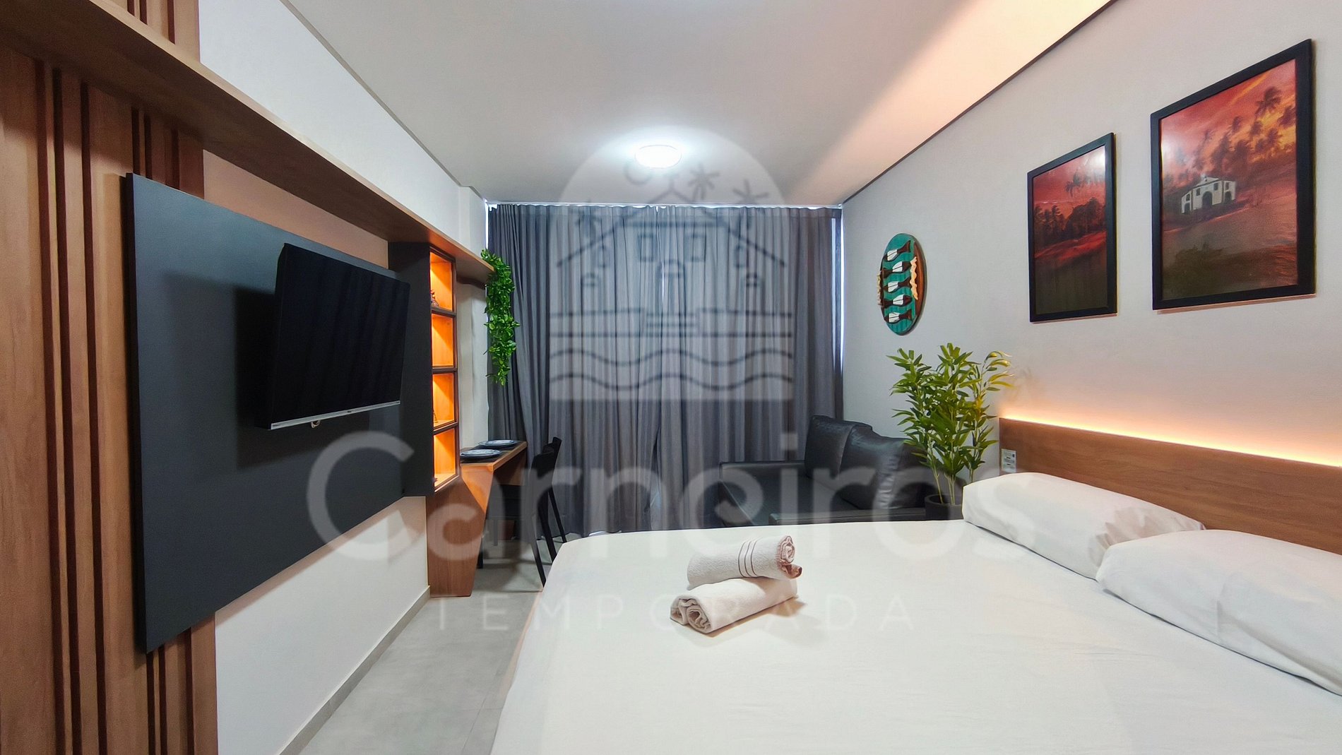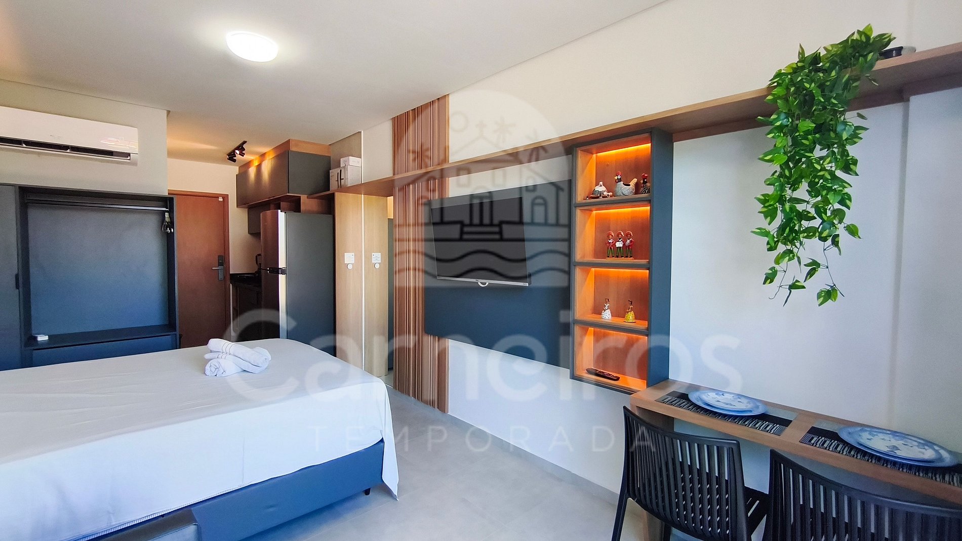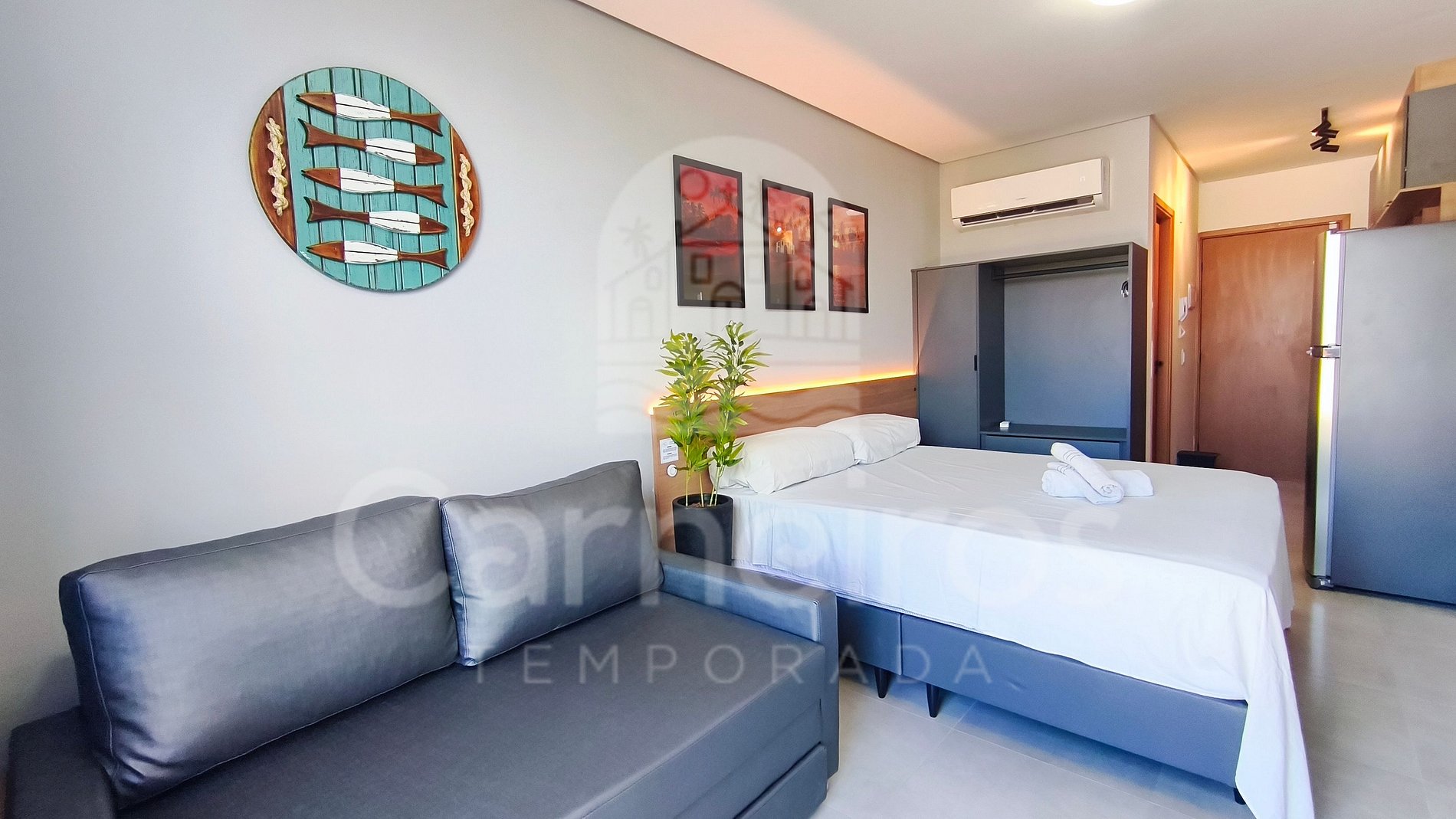 - Studio: 1 cama Queen + 1 sofá-cama, TV e ar-condicionado;