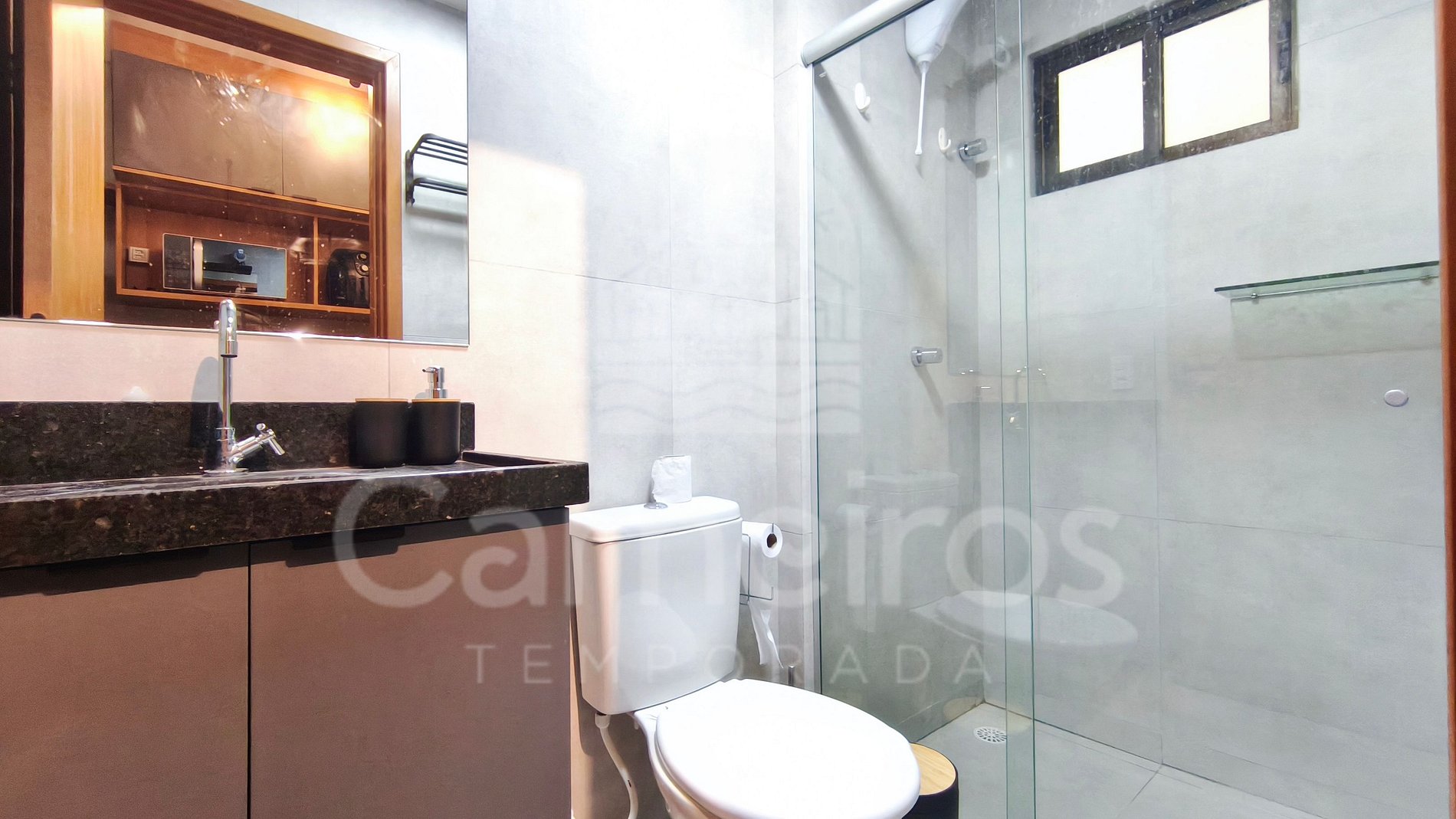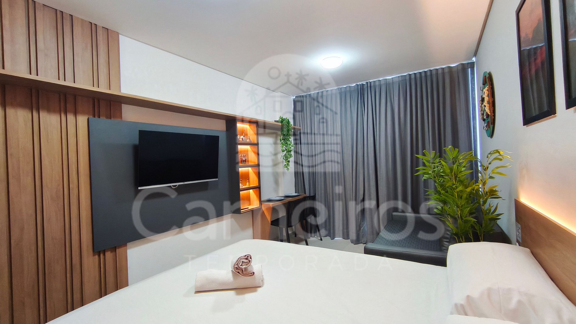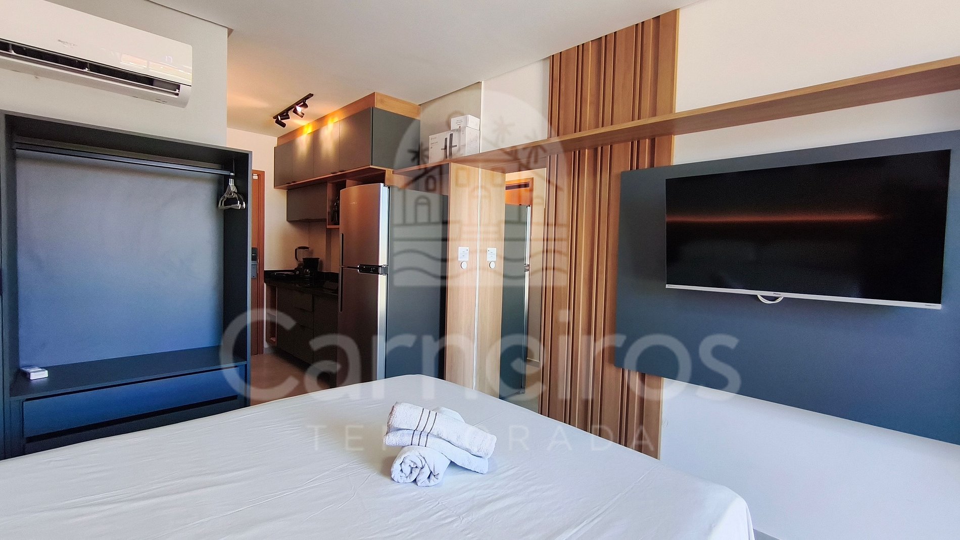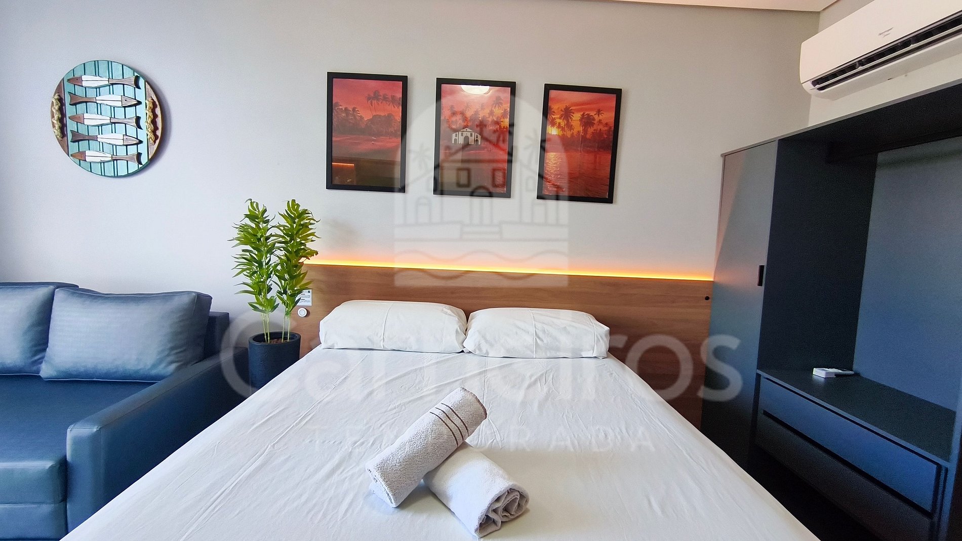 - Studio: 1 cama Queen + 1 sofá-cama, TV e ar-condicionado;