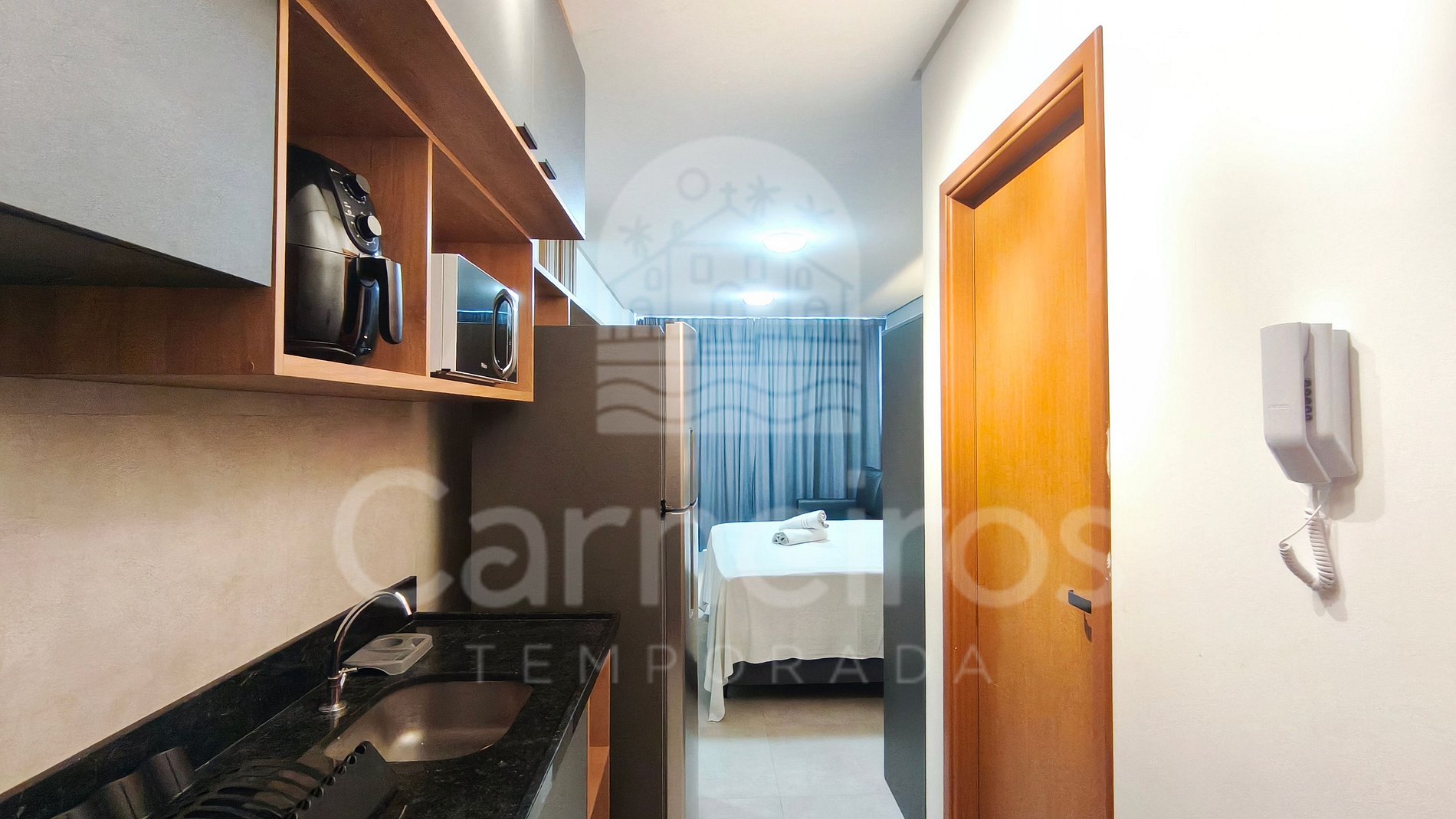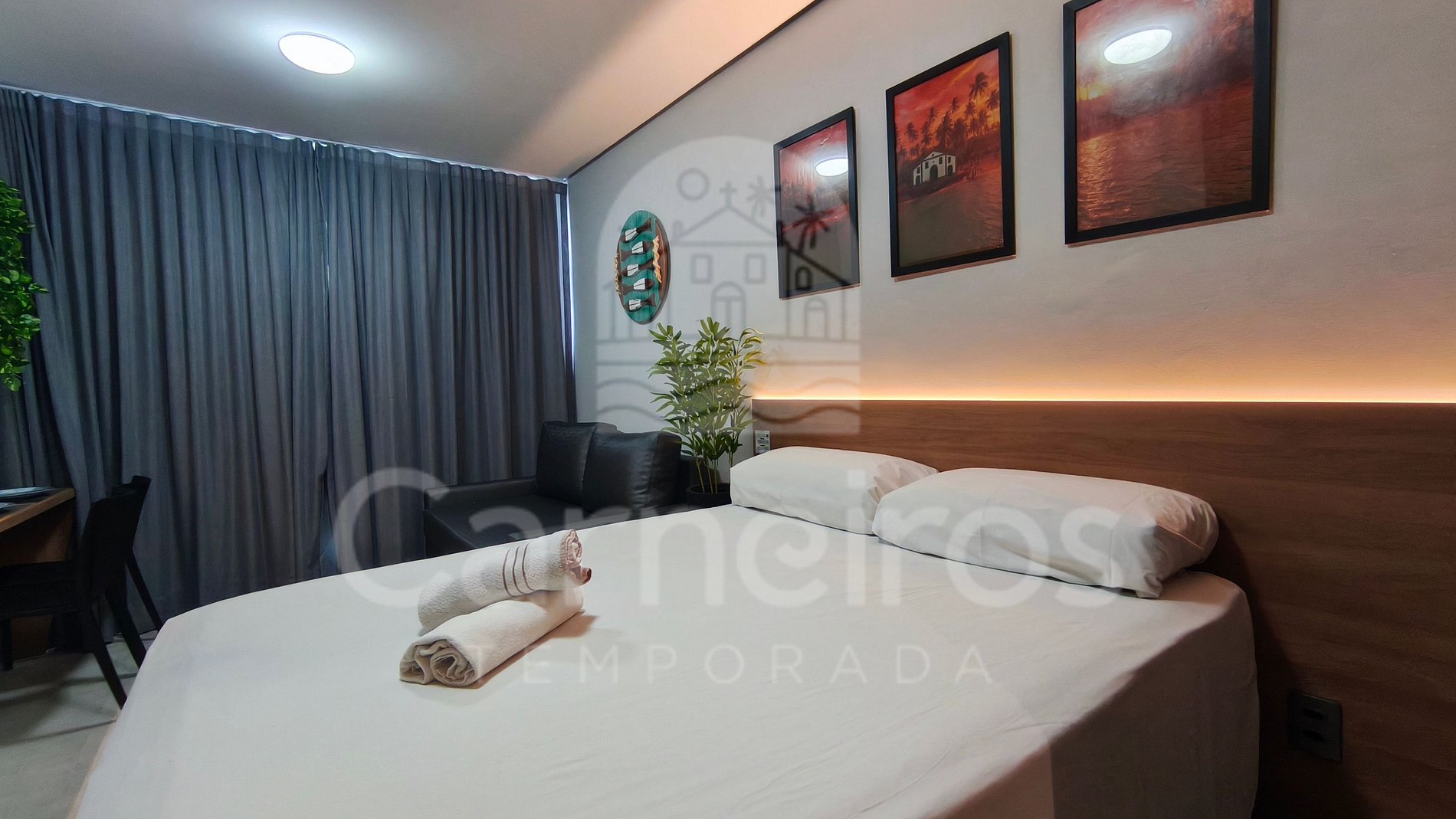 - Studio: 1 cama Queen + 1 sofá-cama, TV e ar-condicionado;