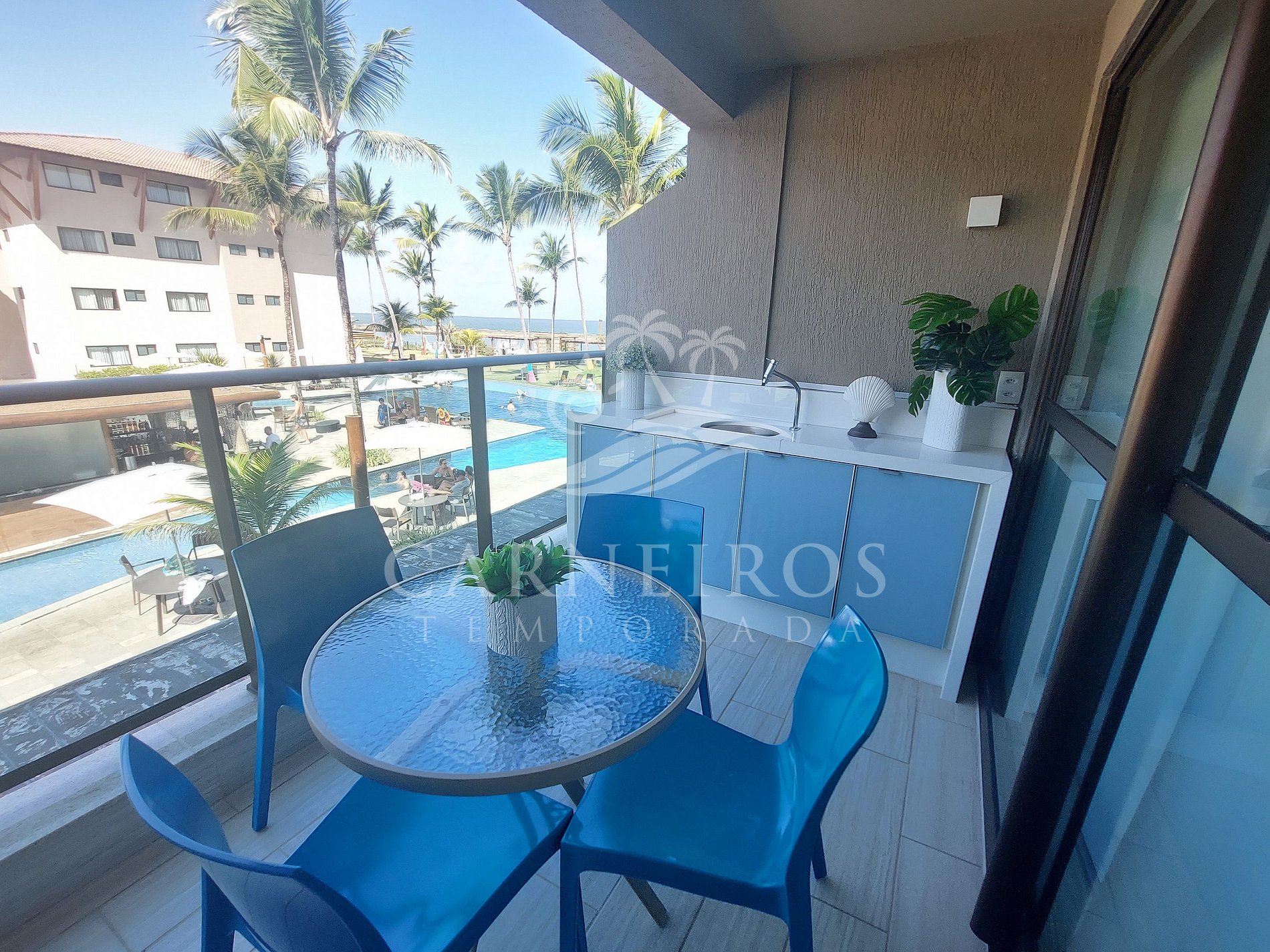 ✹ O flat se encontra no primeiro andar do prédio com vista para as piscinas e conta com uma varanda gourmet com churrasqueira, quatro cadeiras e mesa. ✹