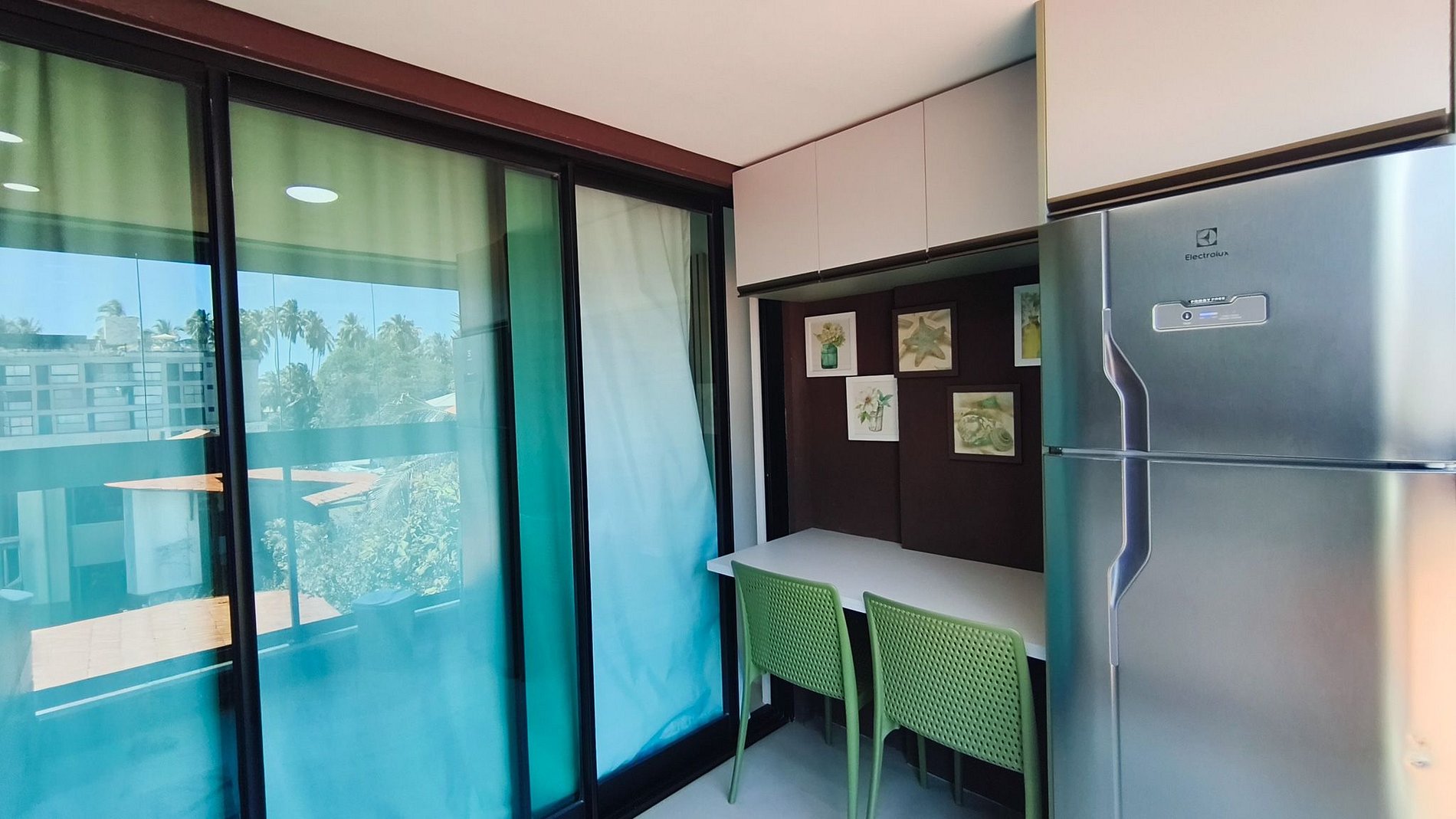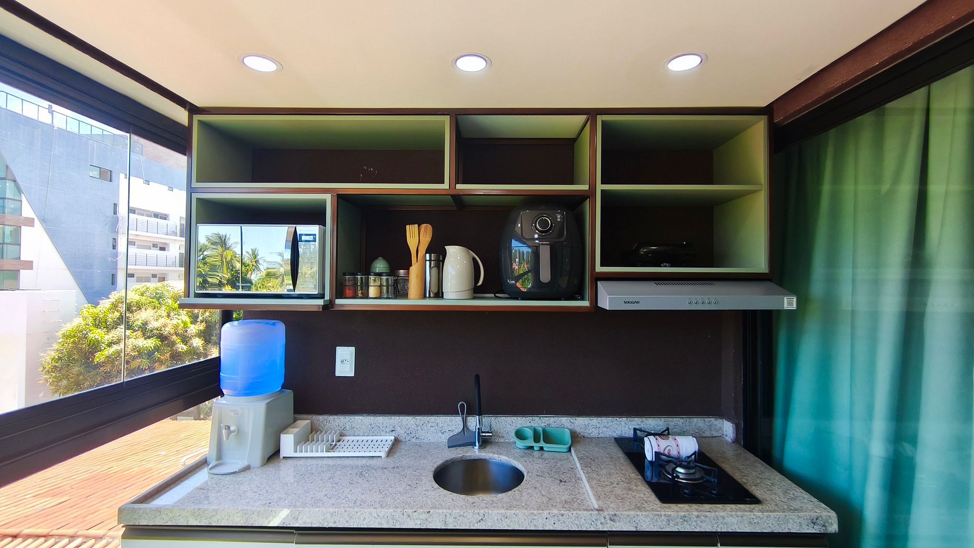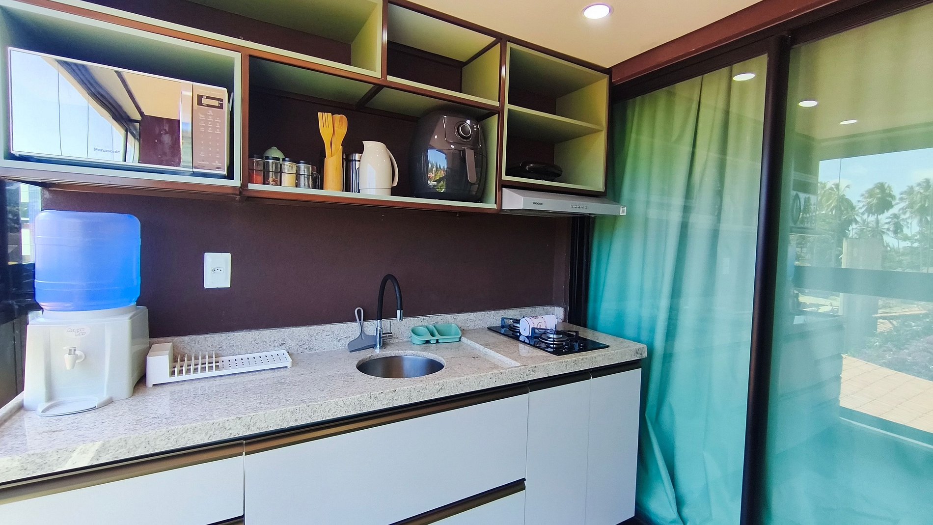 No ambiente integrado você encontrará uma decoração agradável com TV e ar-condicionado. A cozinha é completa e possui diversas comodidades como louça, copos, panelas, talheres, micro-ondas, fogão cooktop 02 bocas, geladeira, airfryer, liquidificador e diversos utensílios. Possui 01 banheiro completo.