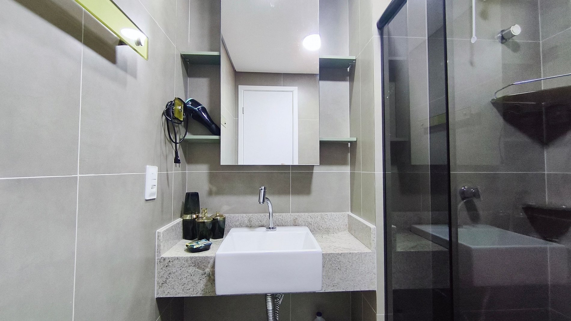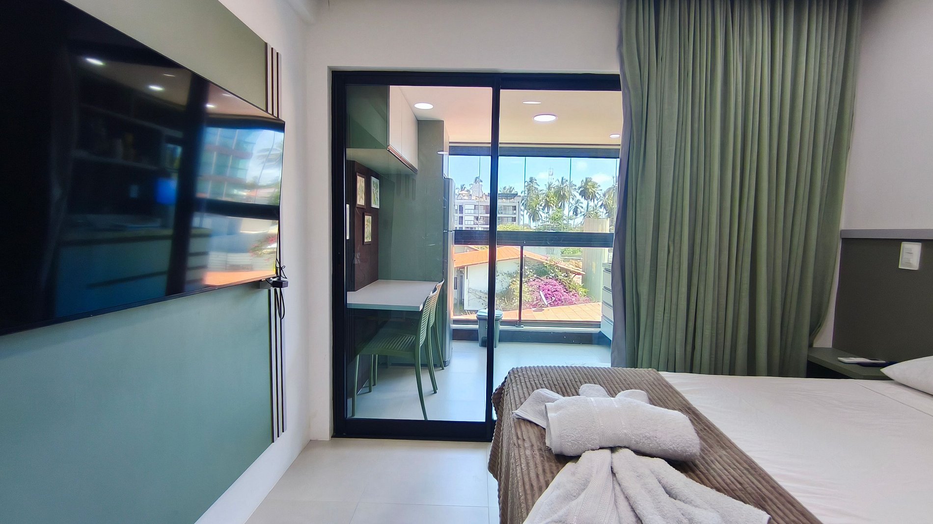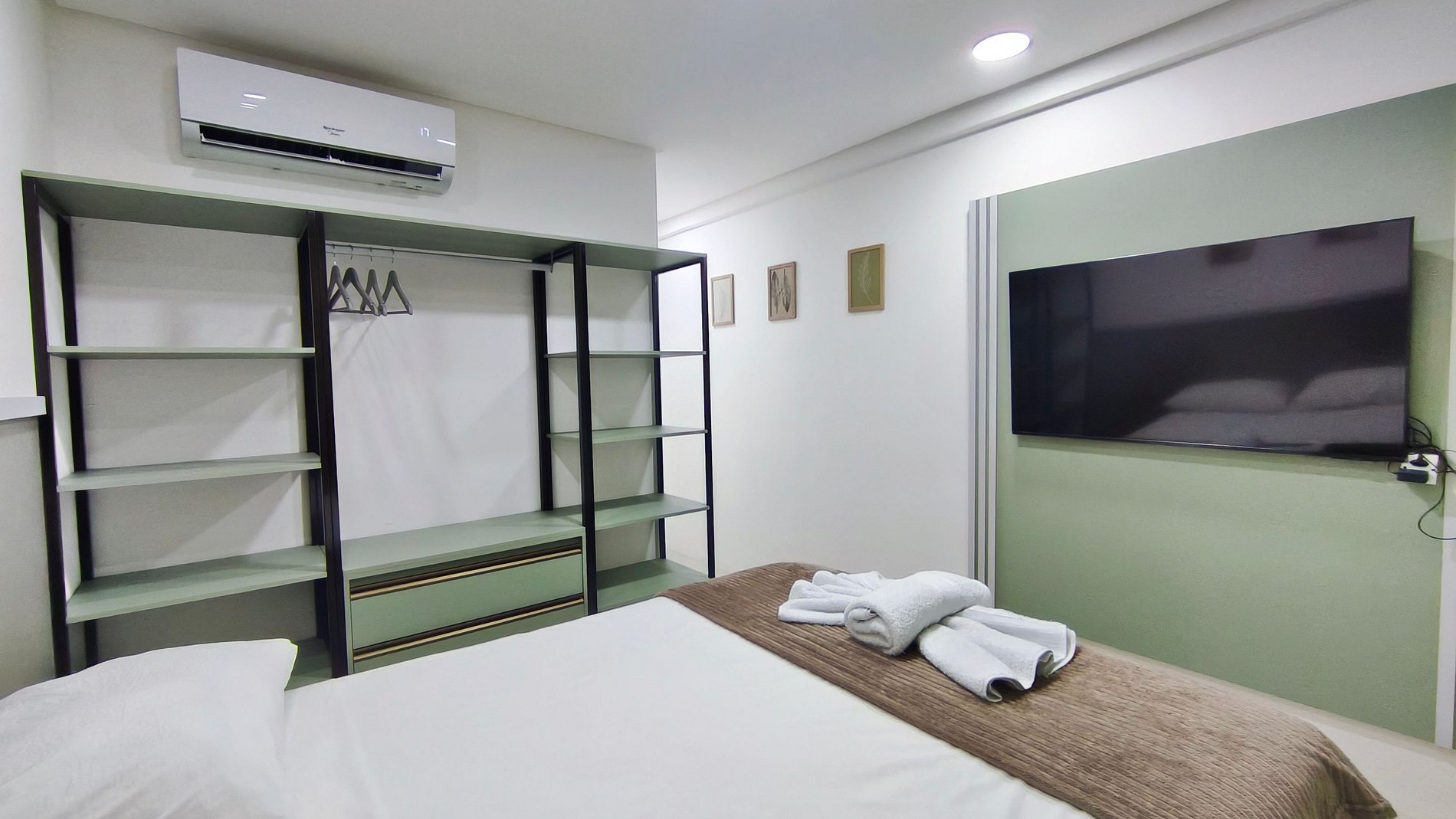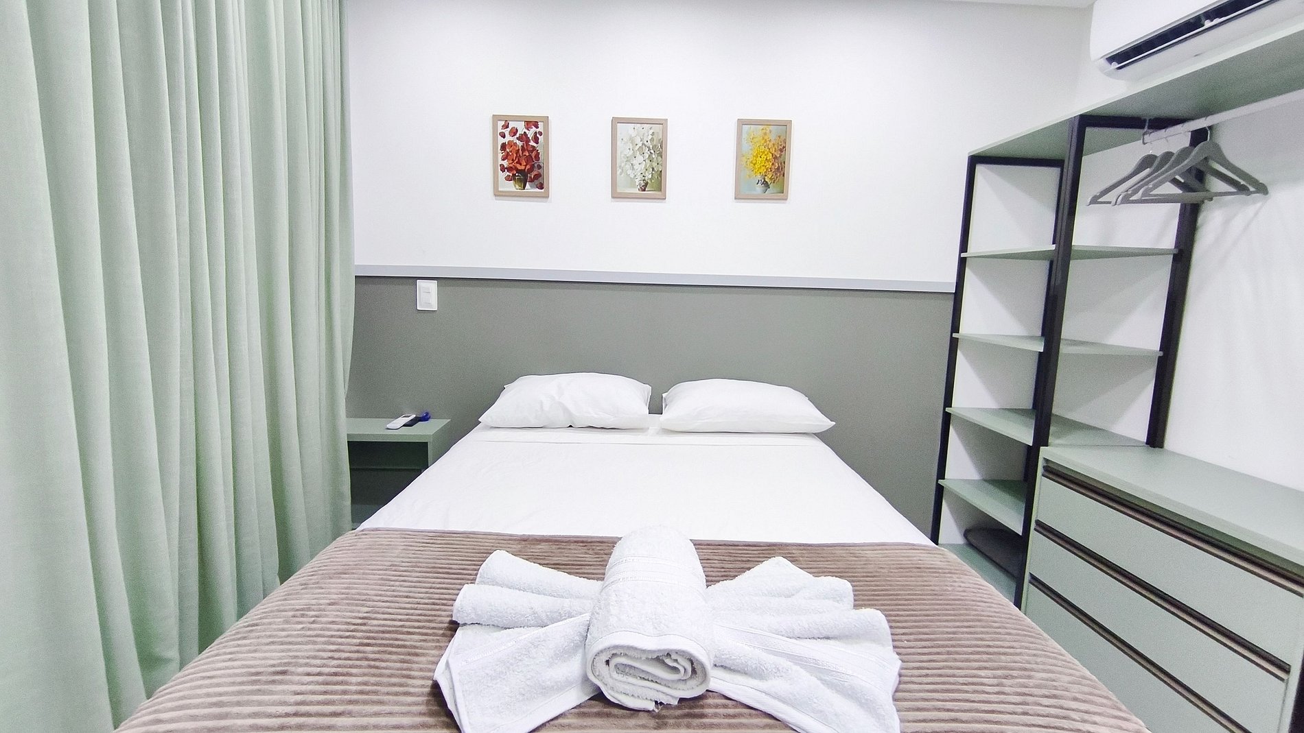 - Estúdio: 1 cama casal, TV, armários e ar-condicionado.