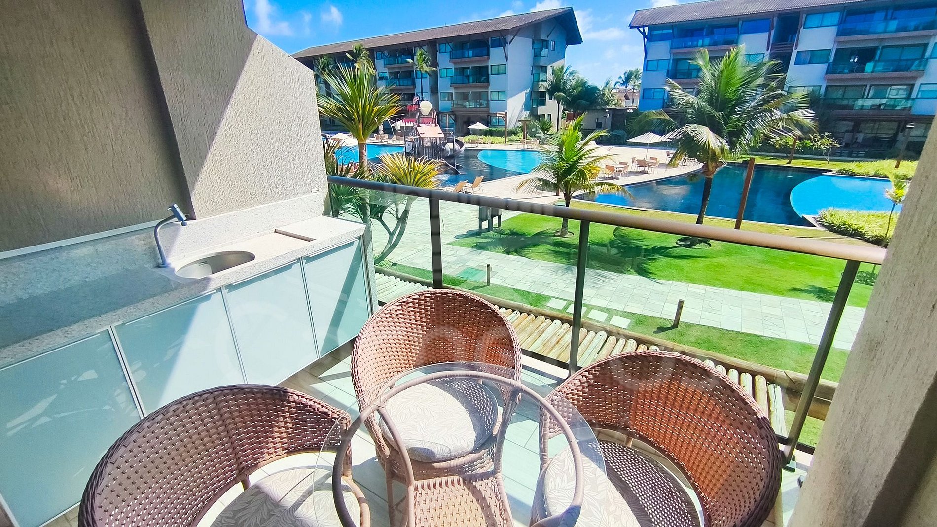 ✹ O flat se encontra no primeiro andar do prédio. Possui vista para as piscinas e varanda gourmet ✹A sala de estar conta com uma linda decoração aconchegante, TV, sofá e ar-condicionado. A cozinha é completa e equipada com geladeira, micro-ondas, fogão, forno, liquidificador, sanduicheira, airfryer e outros utensílios, além da mesa de jantar. Possui 02 banheiros completos e proteção (tela) na varanda e janelas.