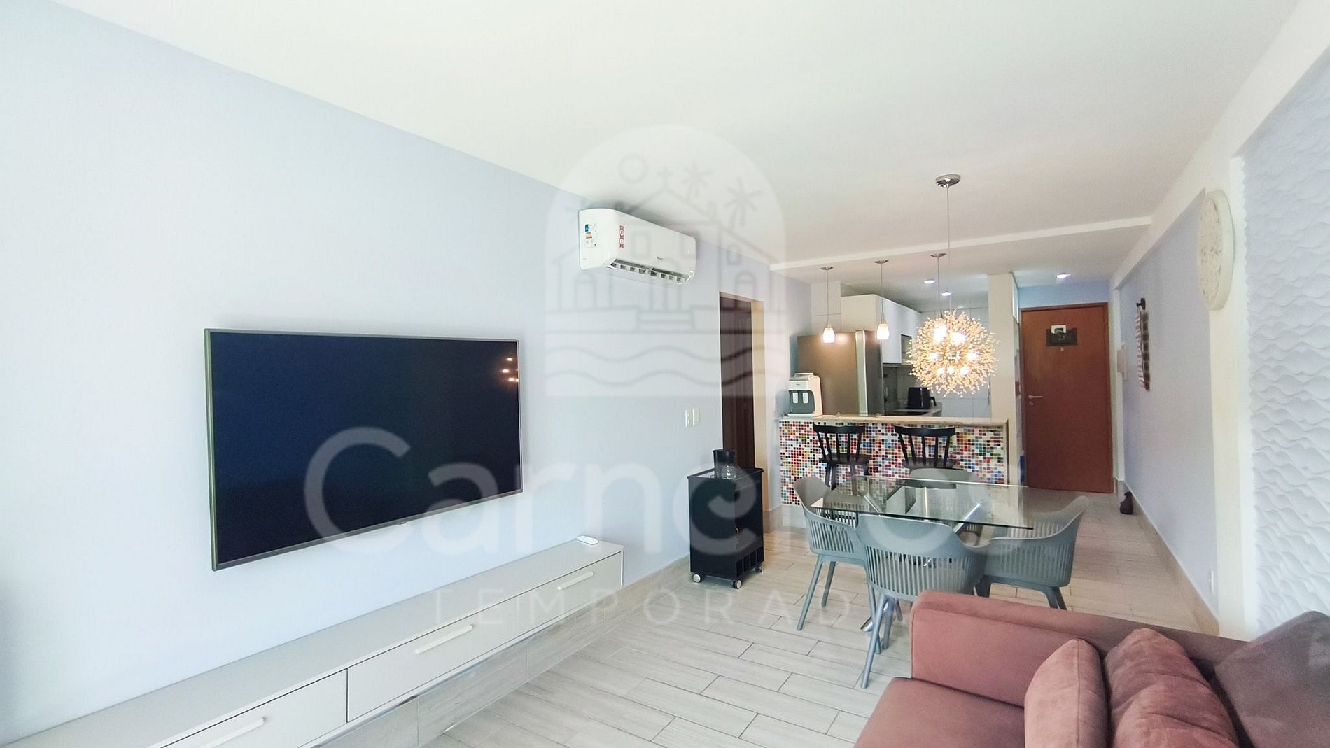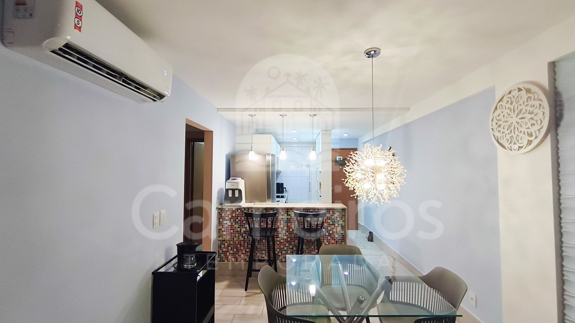 ✹ O flat se encontra no primeiro andar do prédio. Possui vista para as piscinas e varanda gourmet ✹A sala de estar conta com uma linda decoração aconchegante, TV, sofá e ar-condicionado. A cozinha é completa e equipada com geladeira, micro-ondas, fogão, forno, liquidificador, sanduicheira, airfryer e outros utensílios, além da mesa de jantar. Possui 02 banheiros completos e proteção (tela) na varanda e janelas.