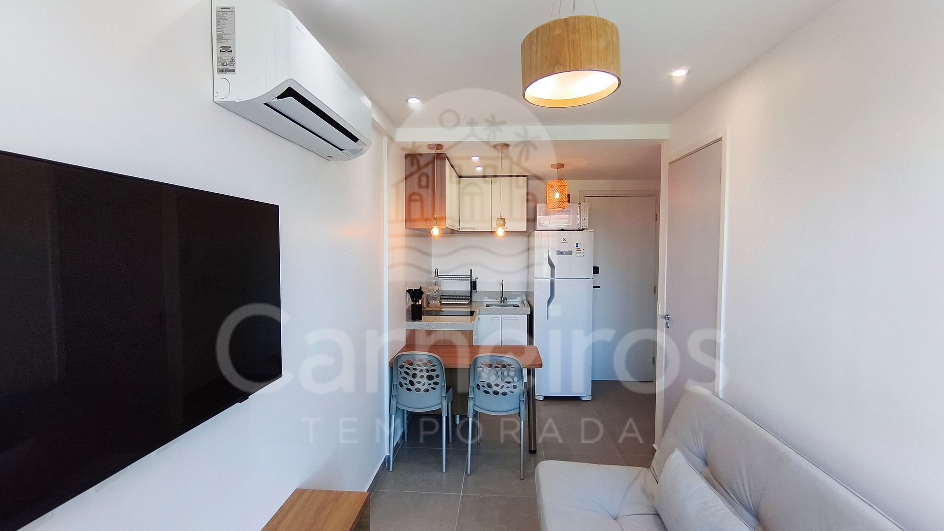 No ambiente integrado você encontrará uma decoração agradável, TV, mesa e cadeiras e ar-condicionado. A cozinha é completa e possui diversas comodidades como louça, copos, panelas, talheres, micro-ondas, fogão, gelareira, sanduicheira, liquidificador e diversos utensílios. O estúdio possui 01 banheiro completo.