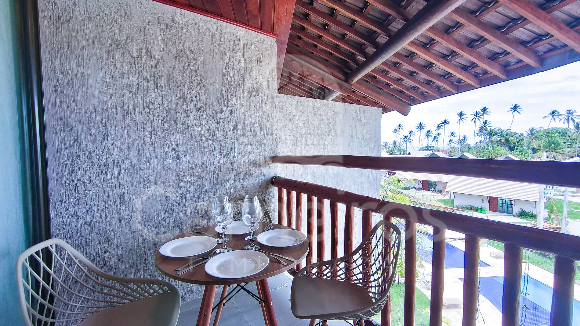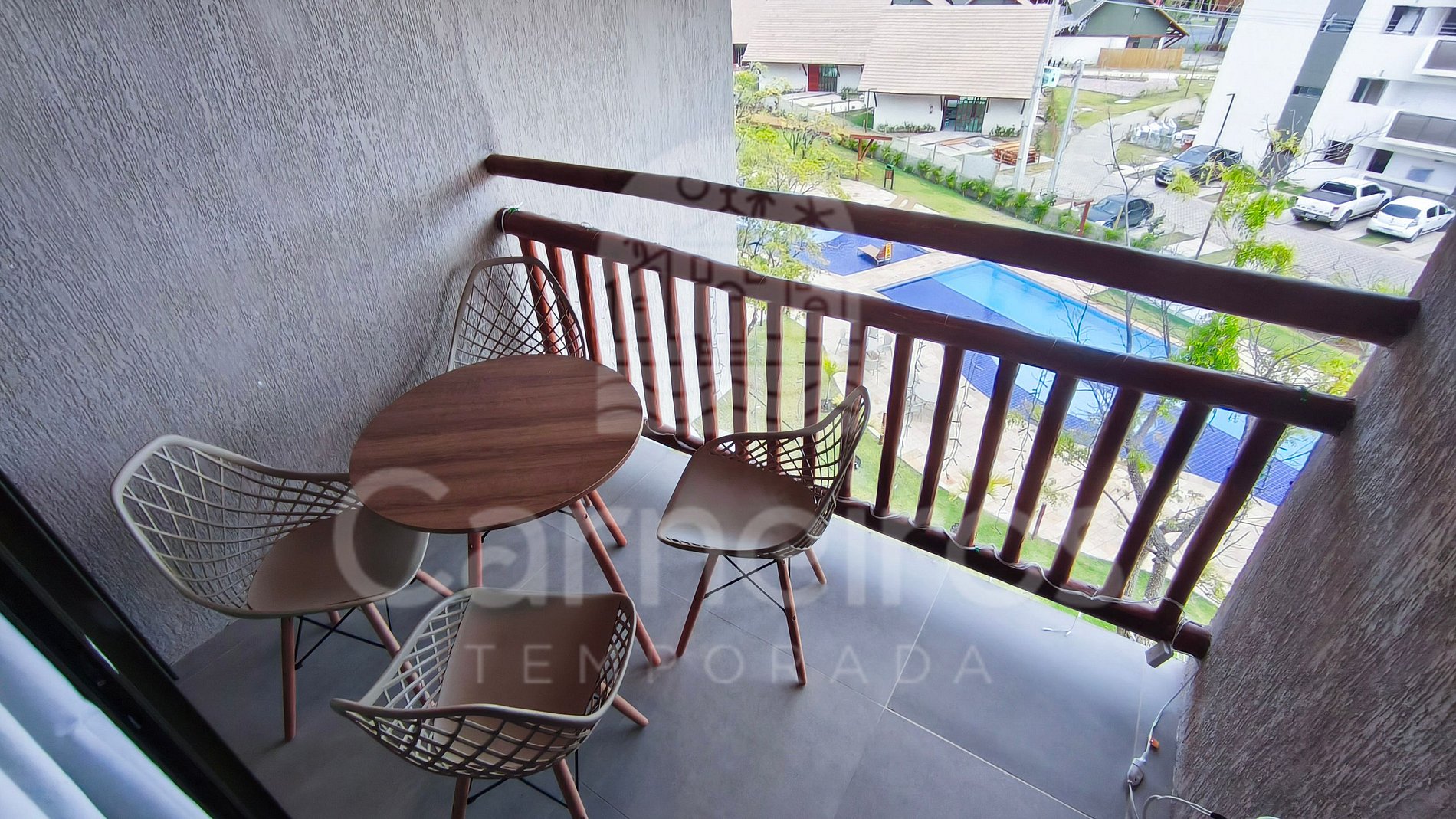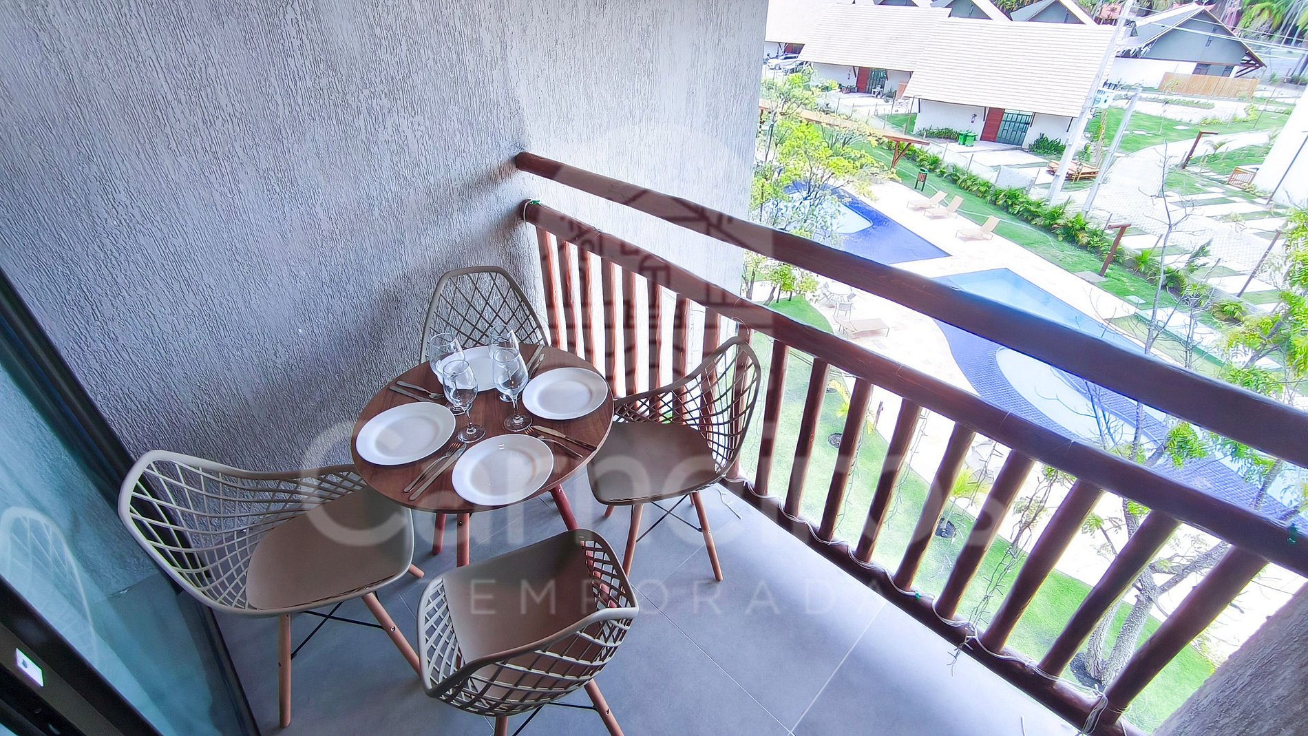 ✹ O flat está localizado no terceiro andar, possui vista para a piscina e conta com uma varanda confortável, equipada com mesa e cadeiras ✹