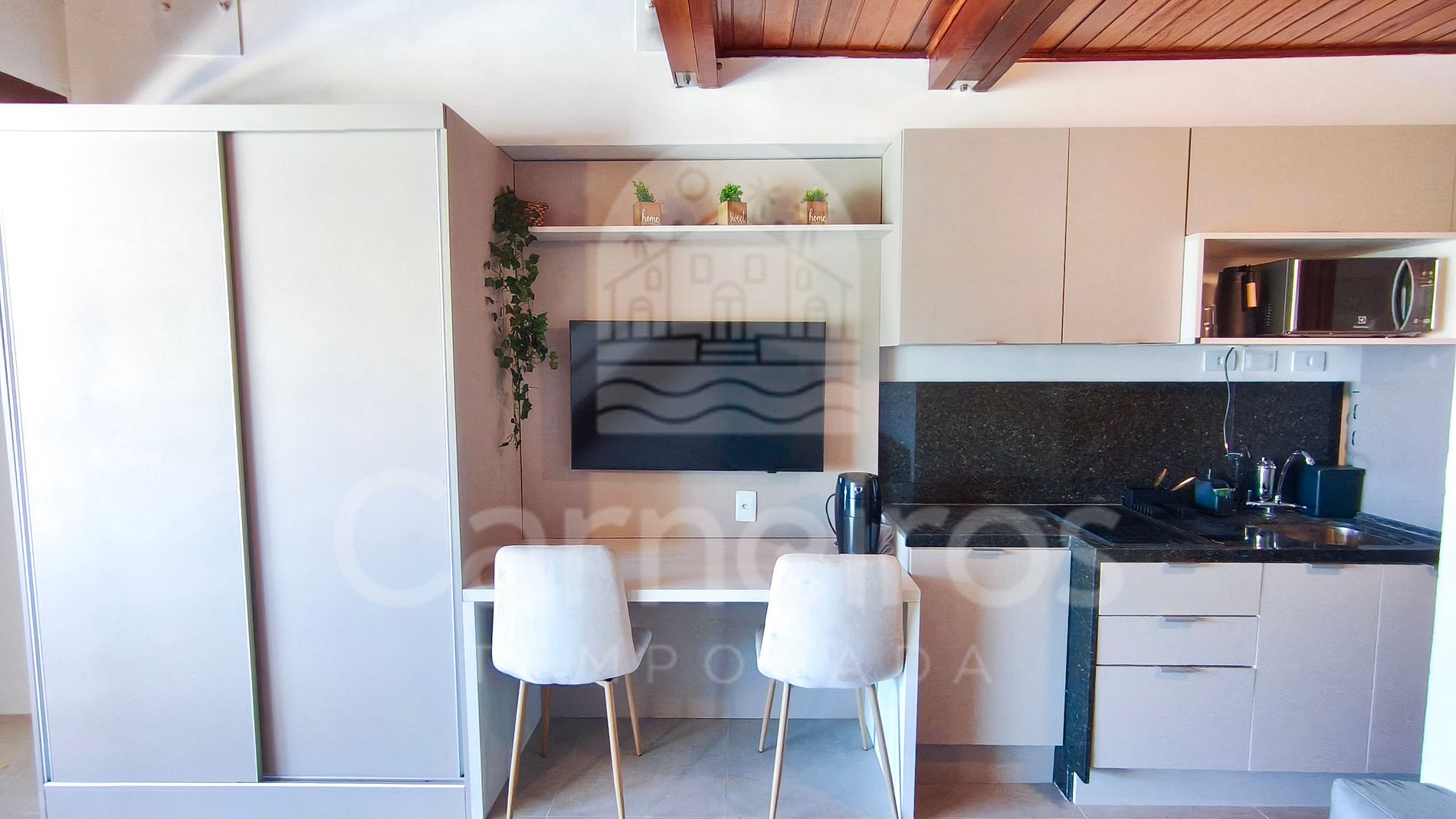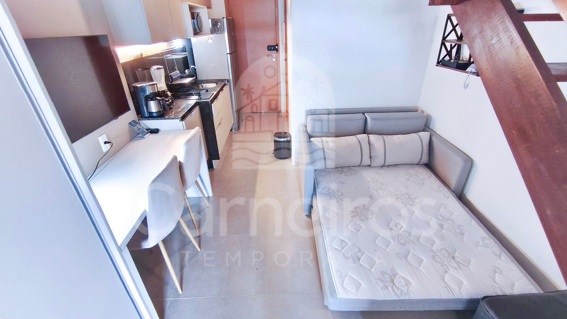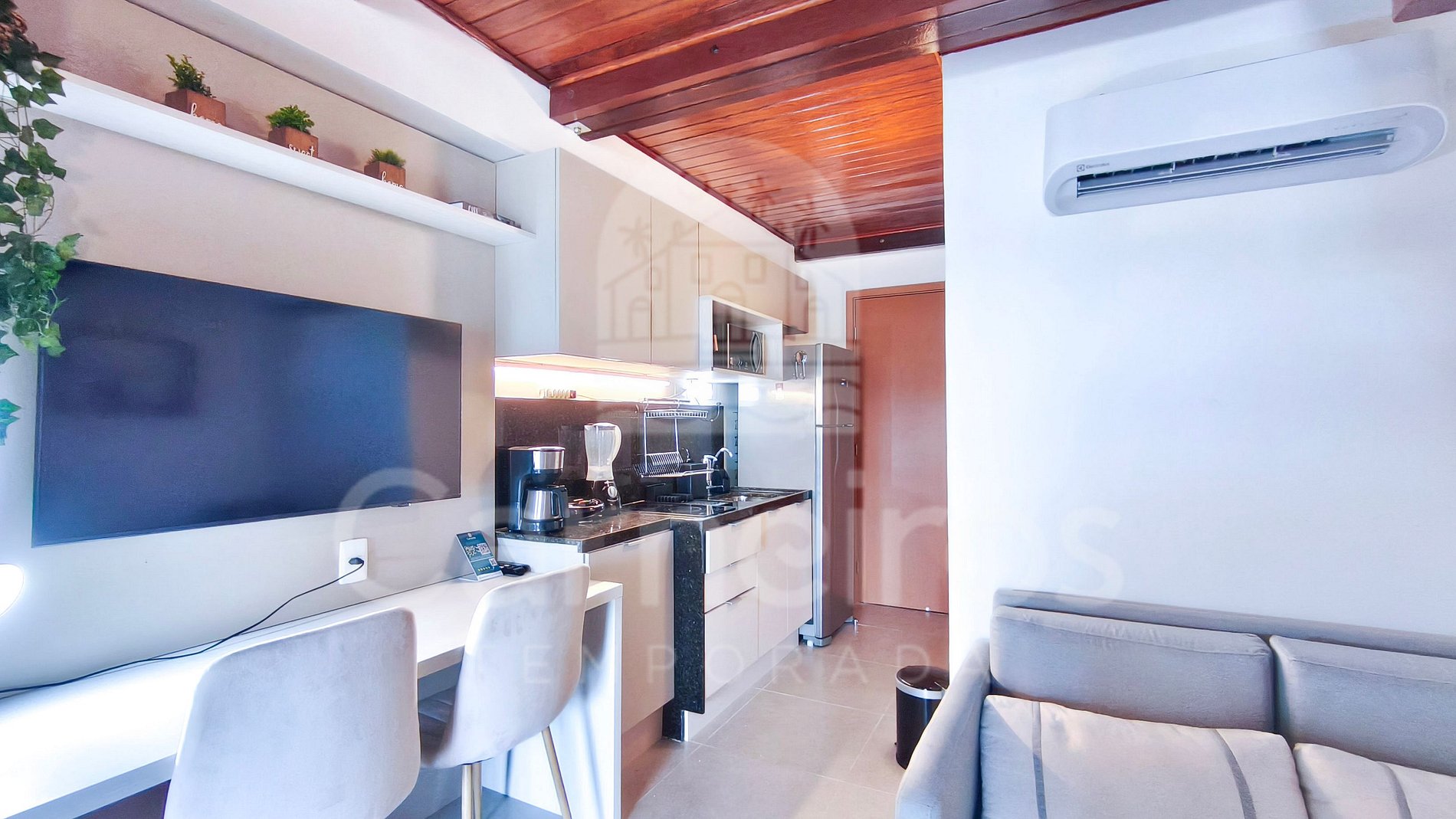 O flat possui ambiente integrado, com decoração agradável e bem distribuída entre quarto, cozinha e banheiro. A cozinha é completa, equipada com geladeira, fogão duas bocas, micro-ondas, sanduicheira e demais utensílios essenciais para sua estadia. O imóvel dispõe de TV, ar-condicionado e banheiro completo.