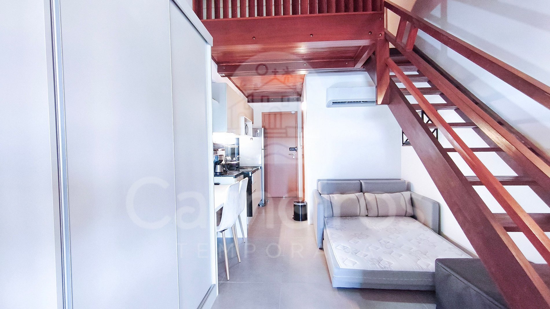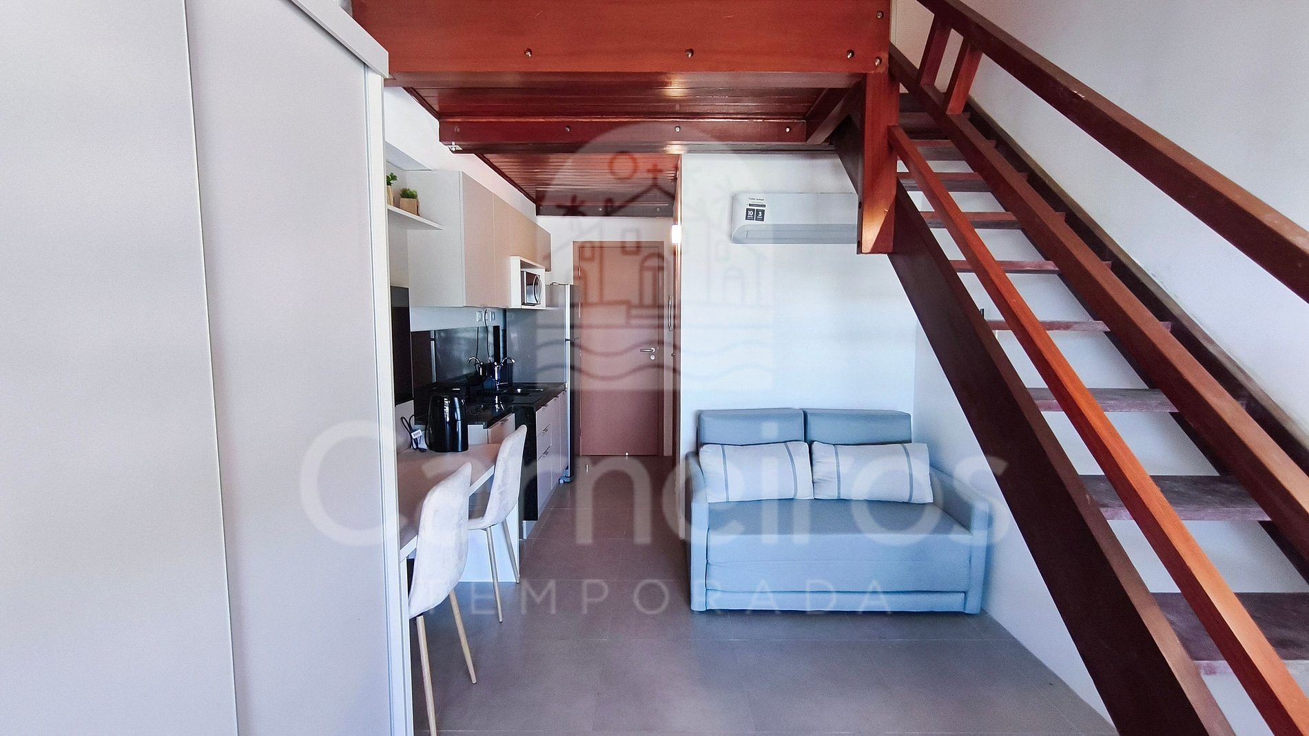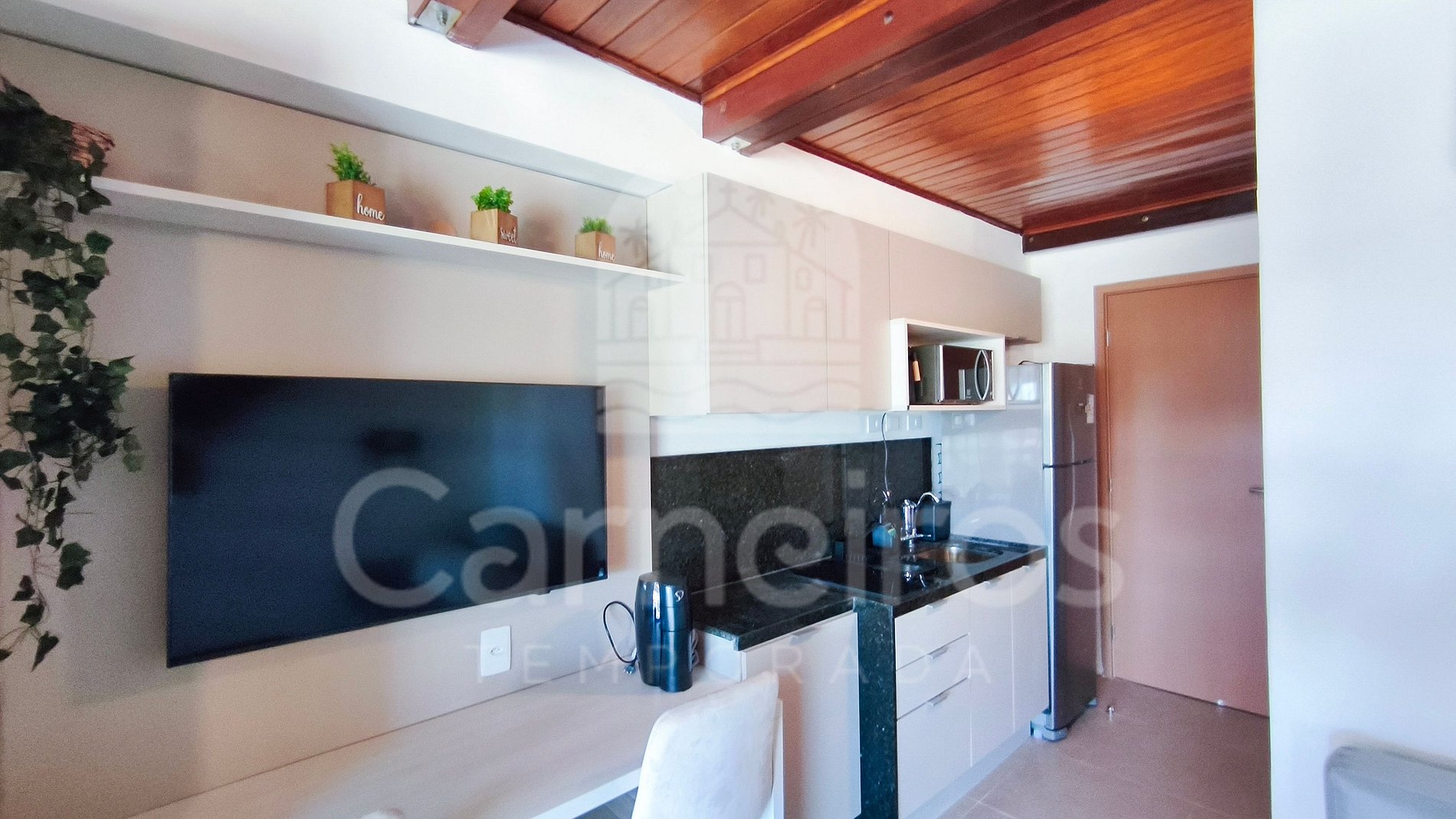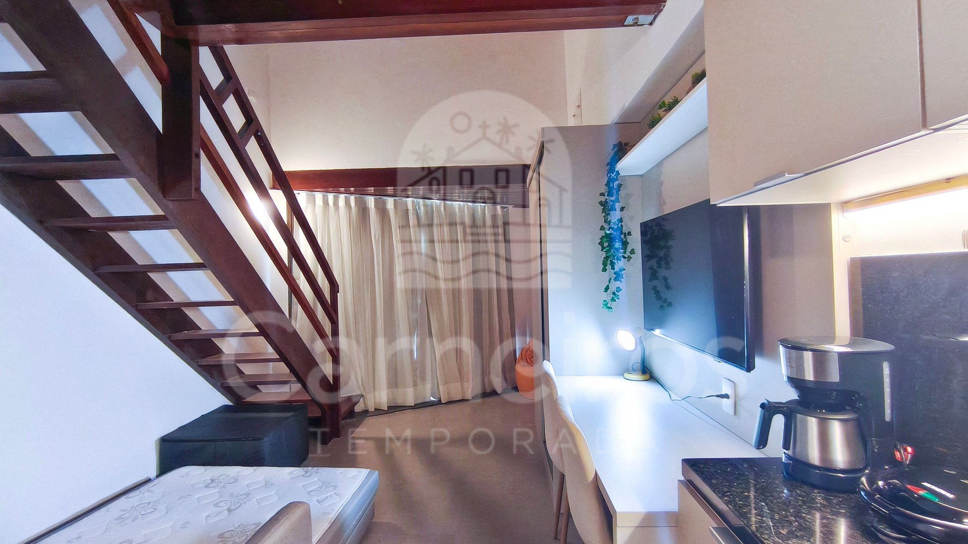 O flat possui ambiente integrado, com decoração agradável e bem distribuída entre quarto, cozinha e banheiro. A cozinha é completa, equipada com geladeira, fogão duas bocas, micro-ondas, sanduicheira e demais utensílios essenciais para sua estadia. O imóvel dispõe de TV, ar-condicionado e banheiro completo.