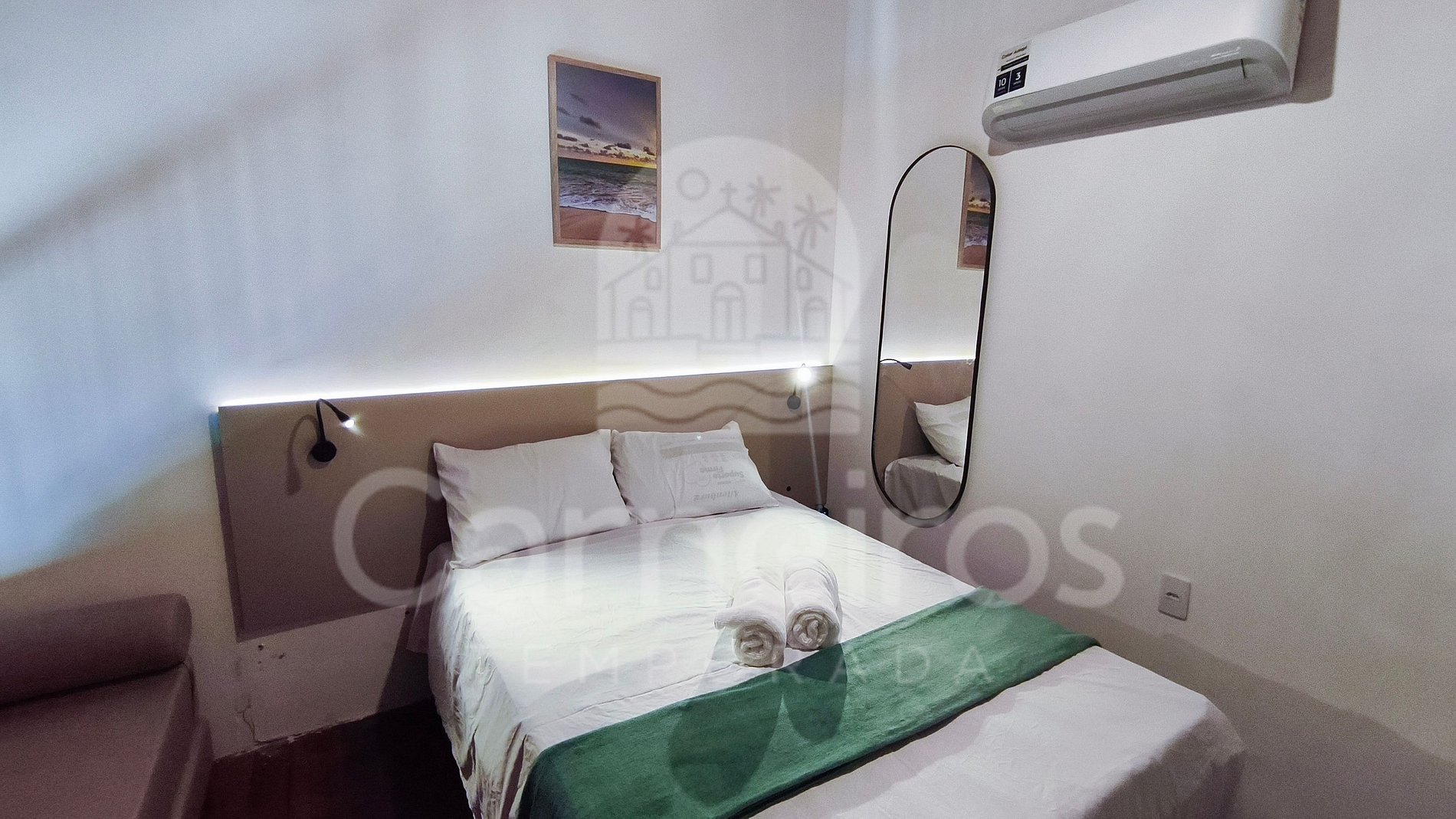 Acomoda confortavelmente até 6 pessoas: 1 cama box de casal e 2 sofás-cama.