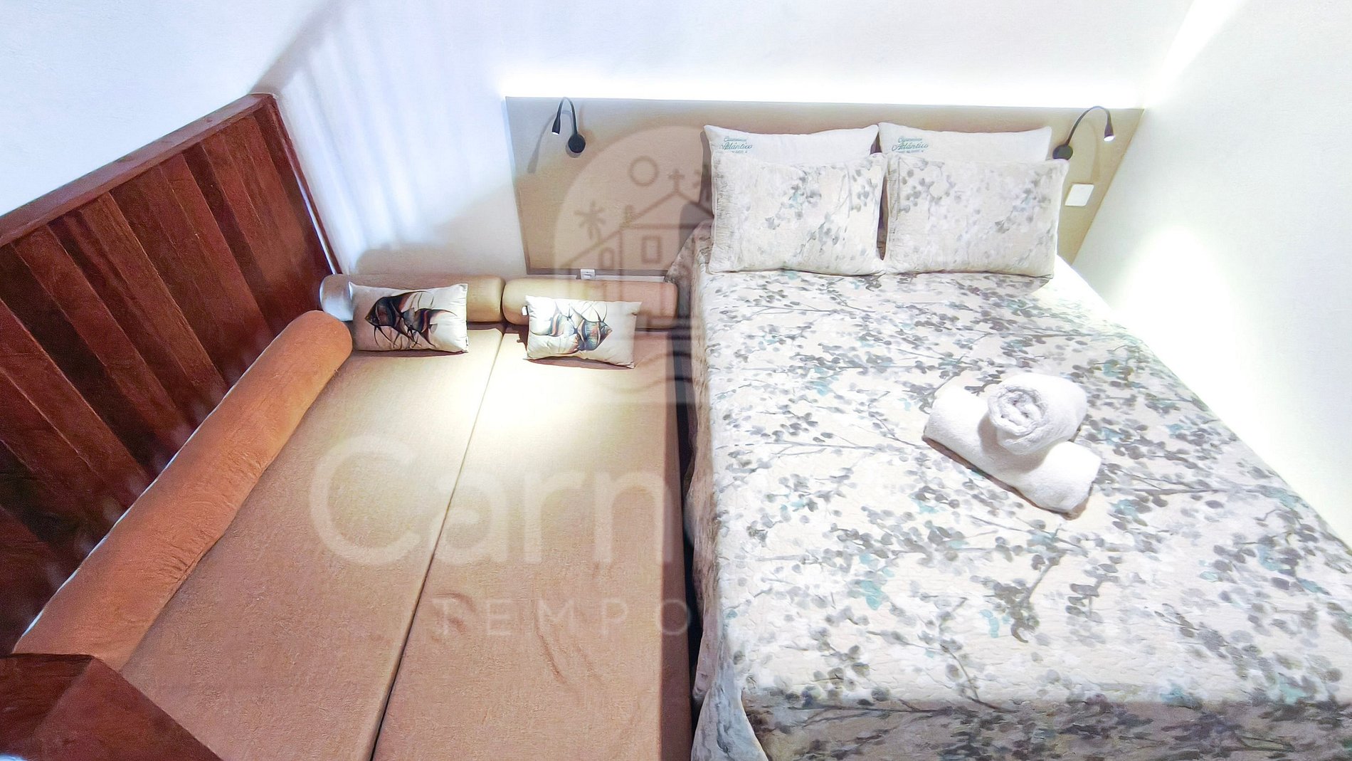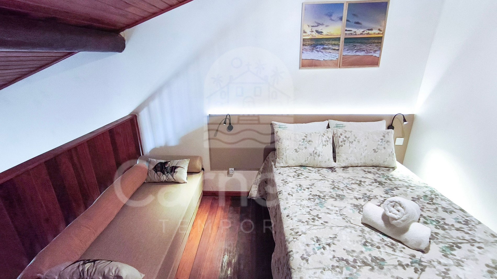Acomoda confortavelmente até 6 pessoas: 01 cama casal e 02 sofás-cama.