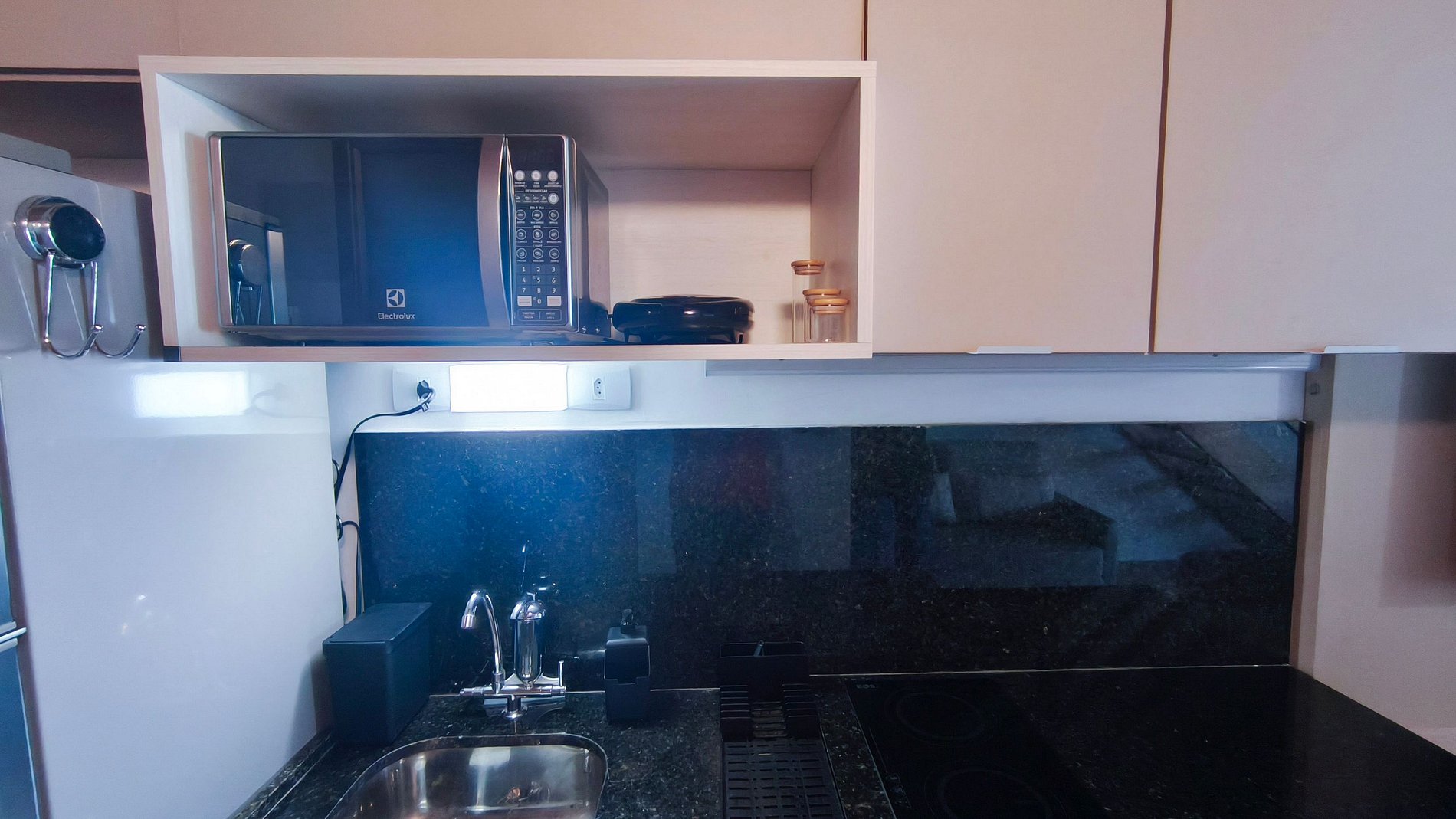 Cozinha - Equipada com geladeira, fogão cooktop de 2 bocas, micro-ondas, sanduicheira e utensílios básicos de cozinha.
