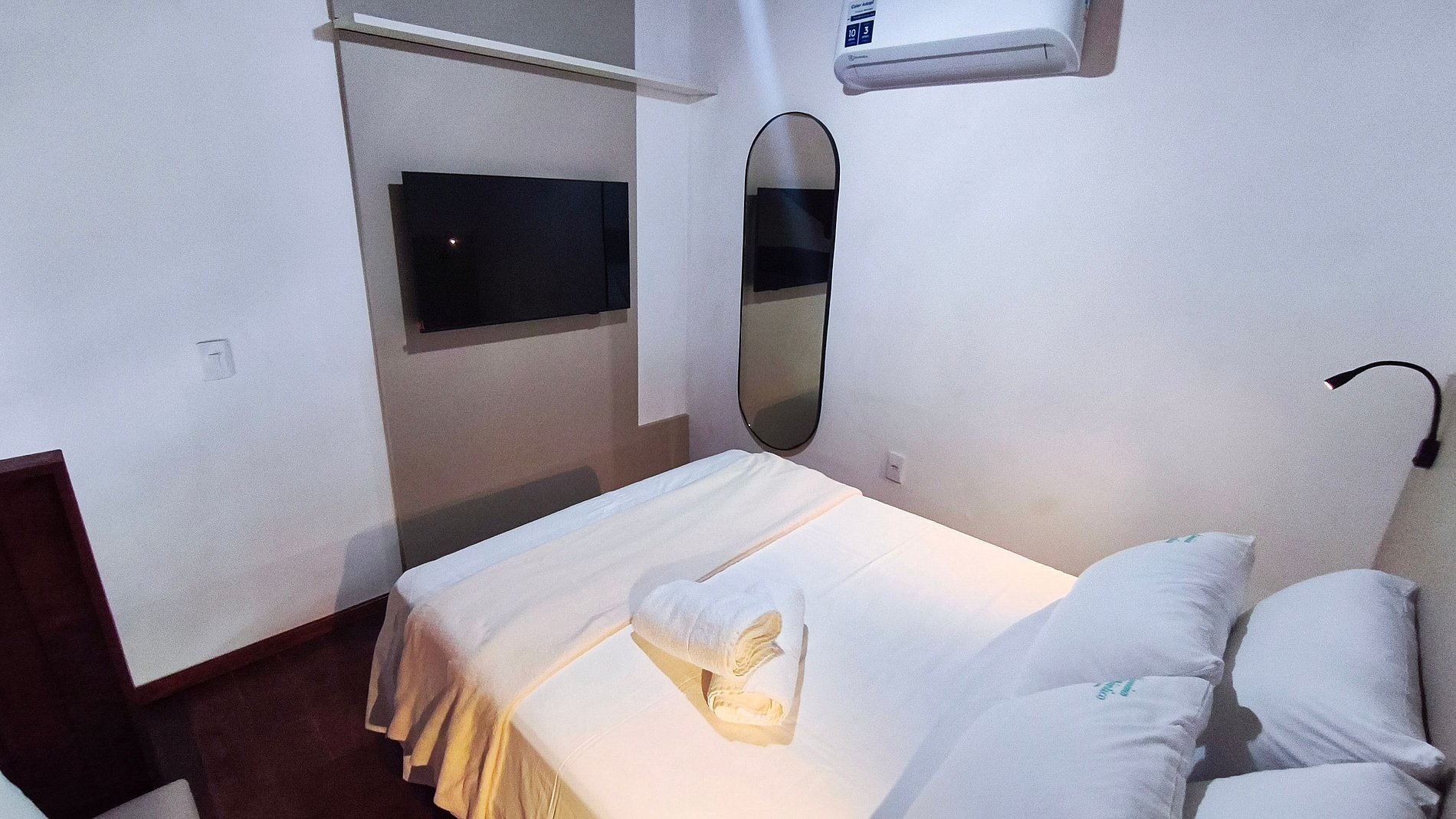 Ambiente integrado e climatizado com 01 cama box de casal e 02 sofás-cama. Dispõe de Wi-Fi e TV.