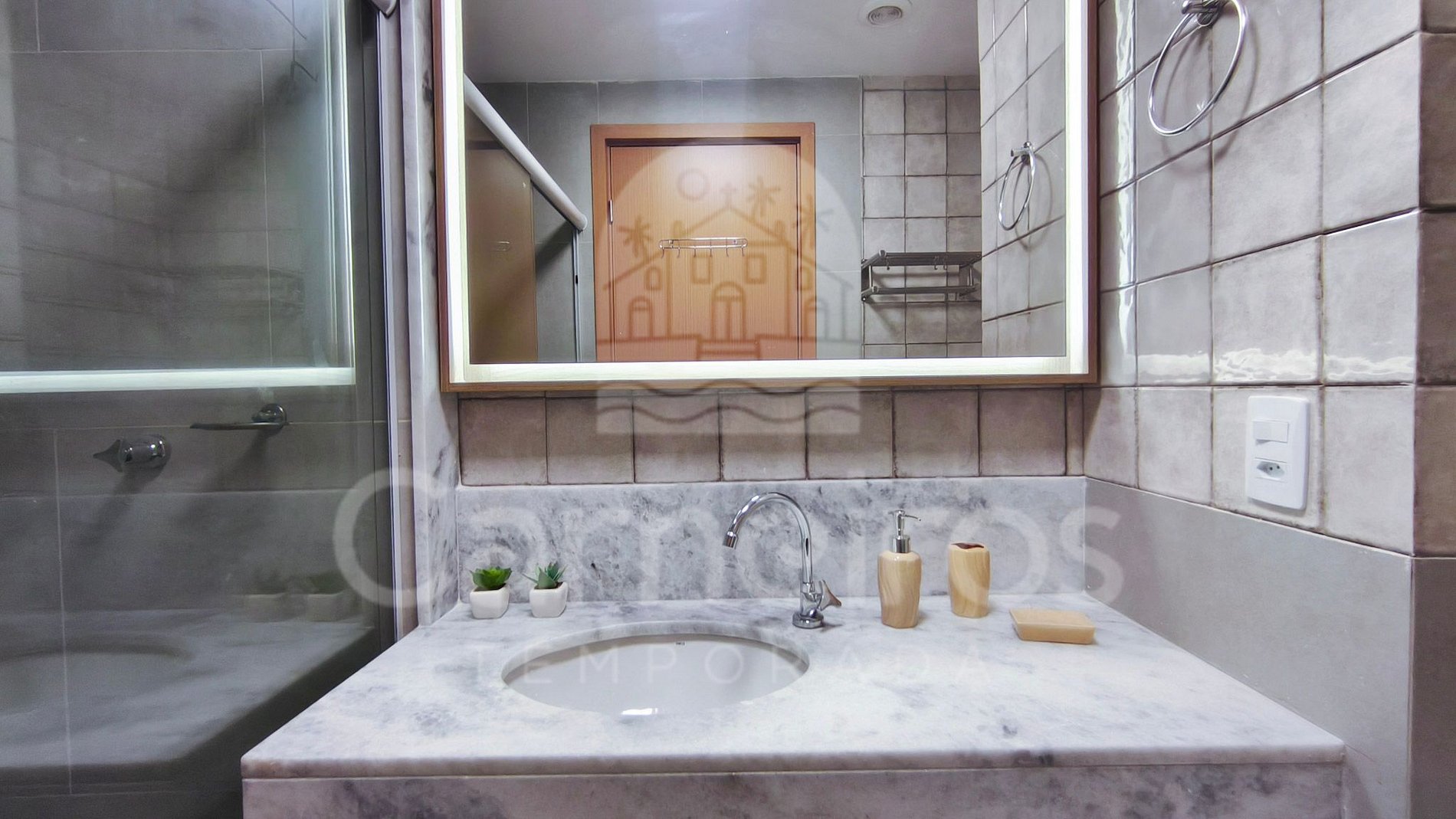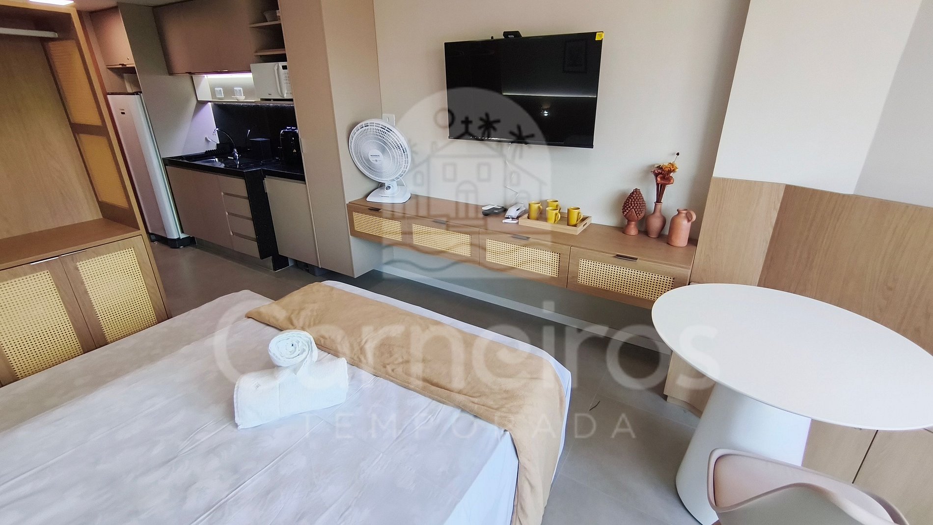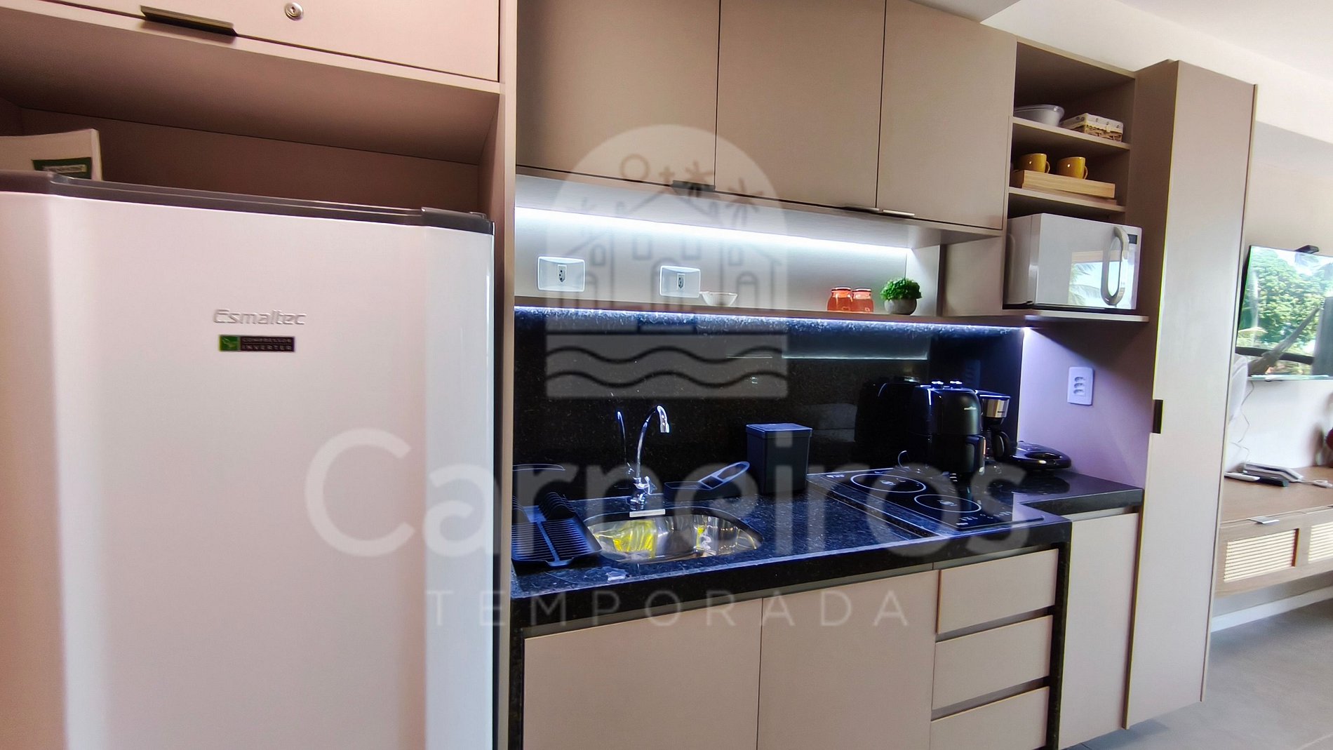 O ambiente integrado possui decoração moderna contando com contando com TV, ar-condicionado e um banheiro completo. A cozinha é completa com geladeira, fogão, micro-ondas, airfryer, sanduicheira, cafeteira elétrica, entre outros utensílios. Possui 1 banheiro completo.