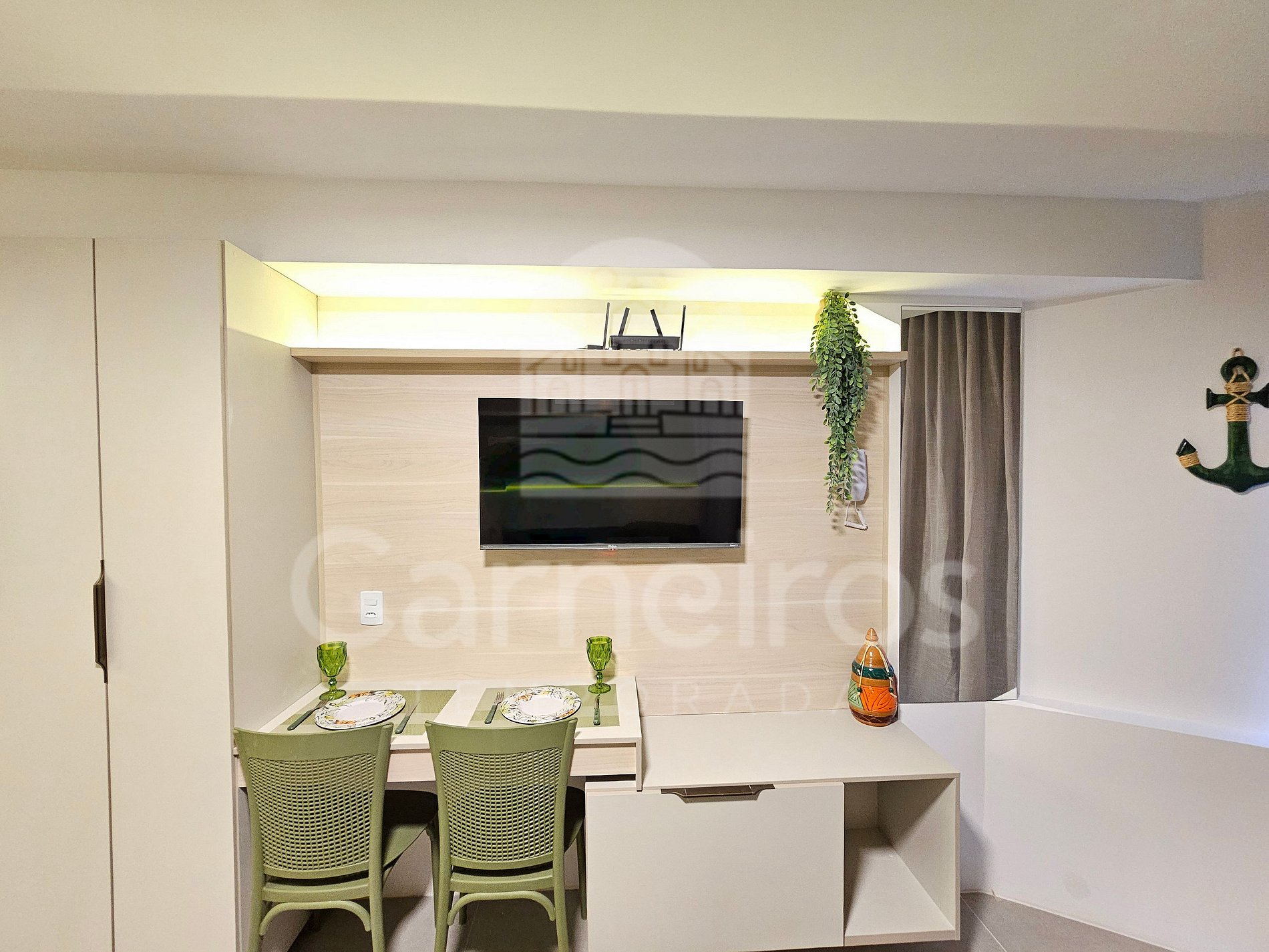 O flat dispõe de uma agradável varanda mobiliada, perfeita para momentos de descanso. O ambiente interno é integrado, com decoração moderna e aconchegante, proporcionando conforto e funcionalidade durante toda a estadia.