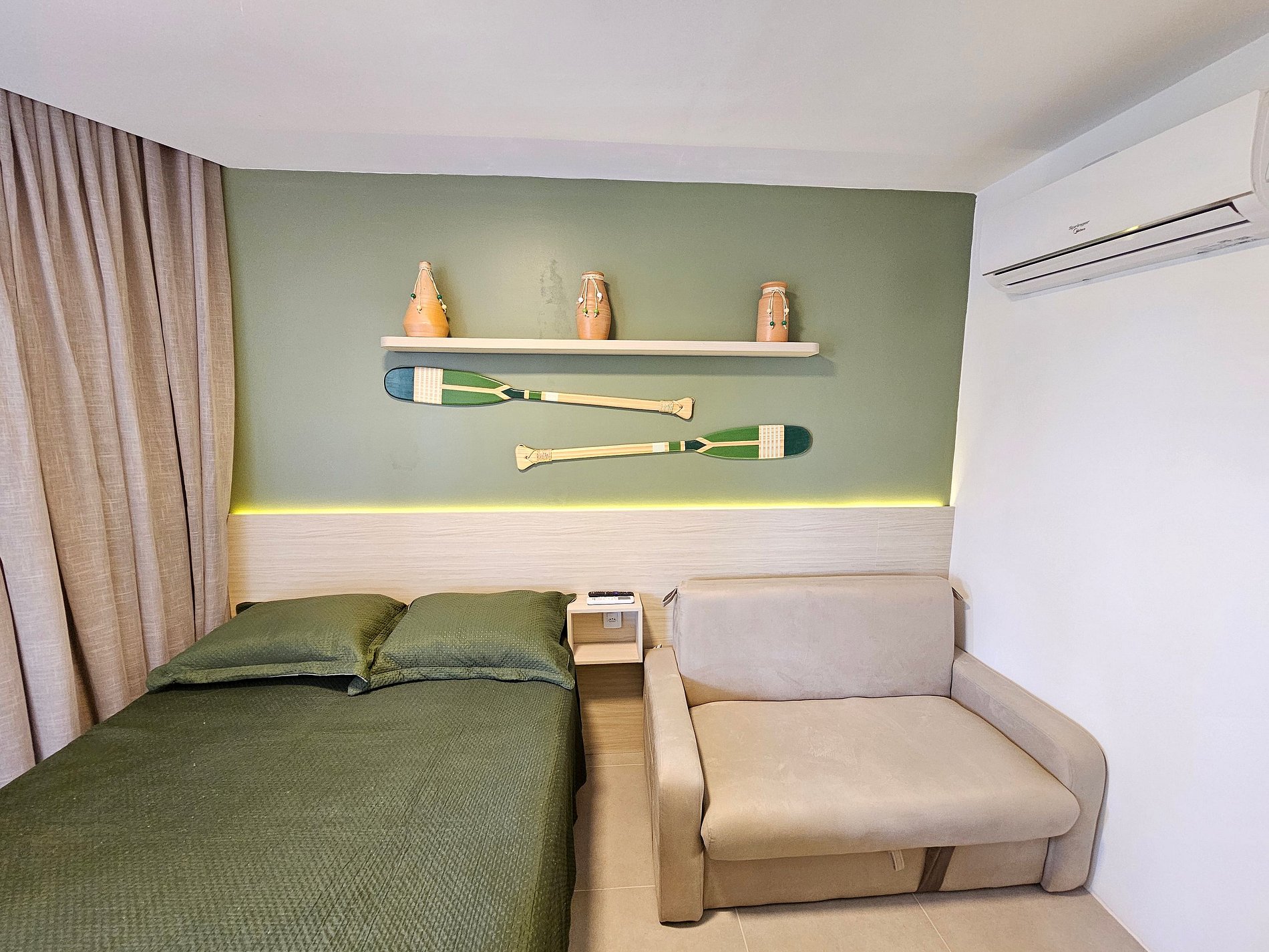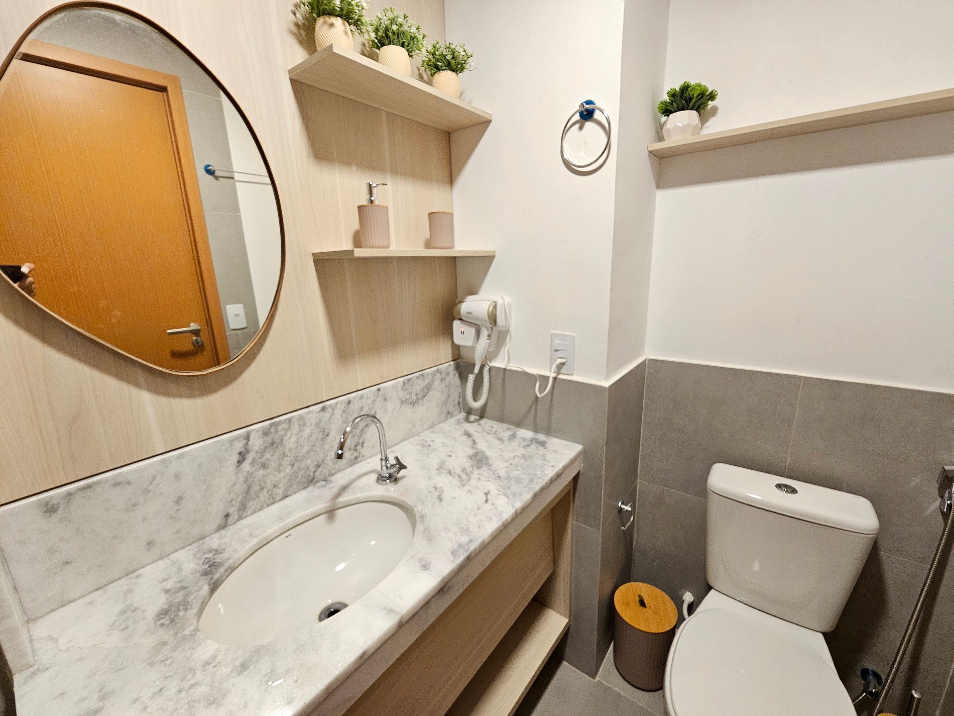 O flat dispõe de uma agradável varanda mobiliada, perfeita para momentos de descanso. O ambiente interno é integrado, com decoração moderna e aconchegante, proporcionando conforto e funcionalidade durante toda a estadia.
