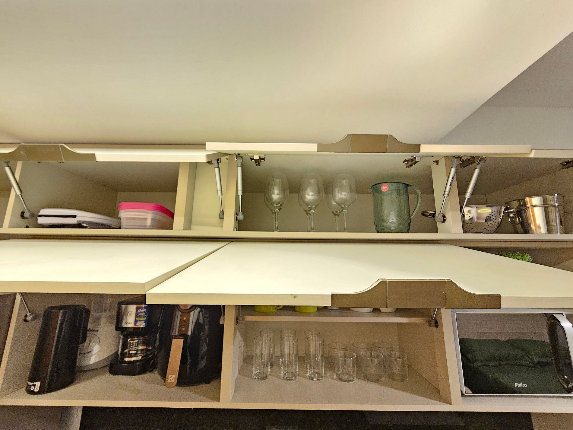 A cozinha é completa e equipada com geladeira, cooktop, micro-ondas, airfryer, sanduicheira, liquidificador e utensílios, permitindo total praticidade no preparo das refeições.