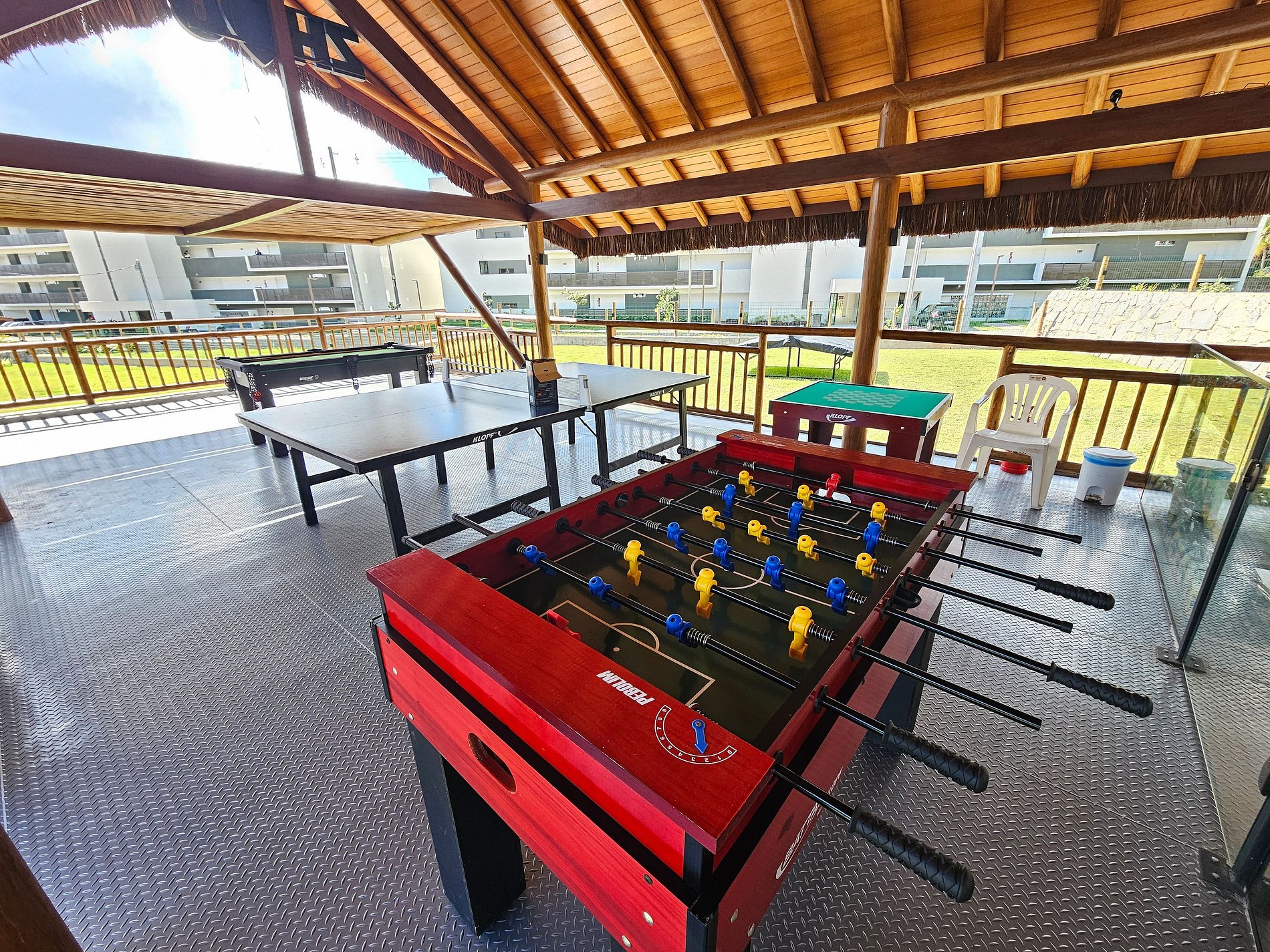 O condomínio oferece opções de lazer e conveniência, como restaurante, loja de conveniência, guarda-sóis e cadeira de praia, mesas de ping-pong, totó e futmesa, materiais esportivos, piscinas adulto e infantil, academia, espaço kids e vagas de estacionamento.