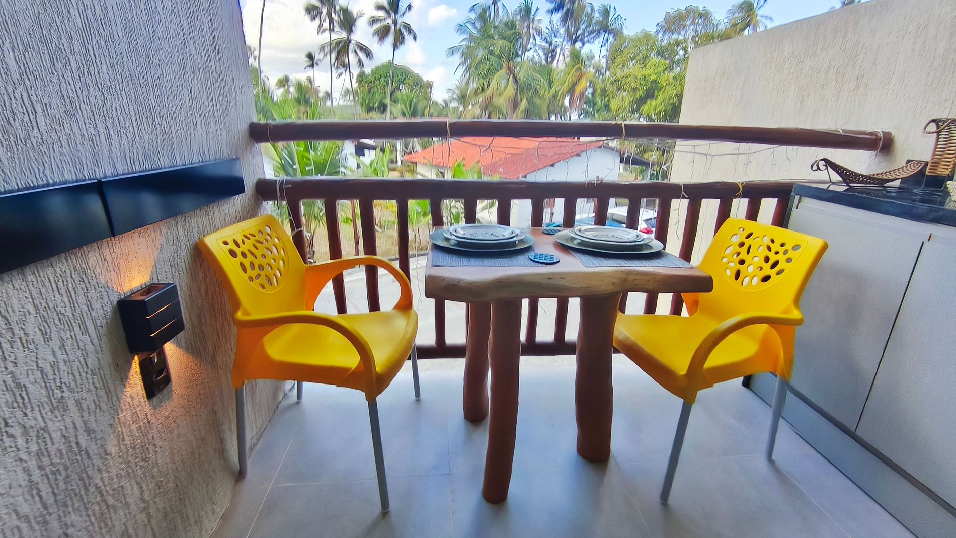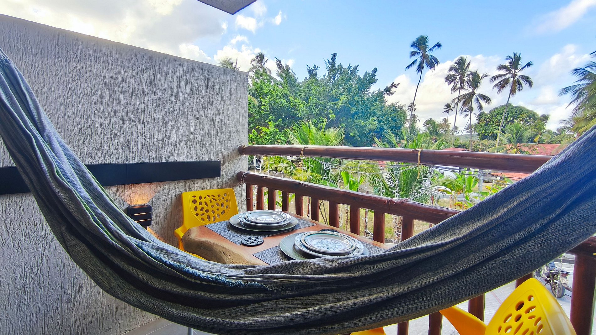 ✹O flat está localizado no primeiro andar, possui vista para os coqueiros da praia e o mar, e conta com uma varanda com mesa, cadeiras e rede