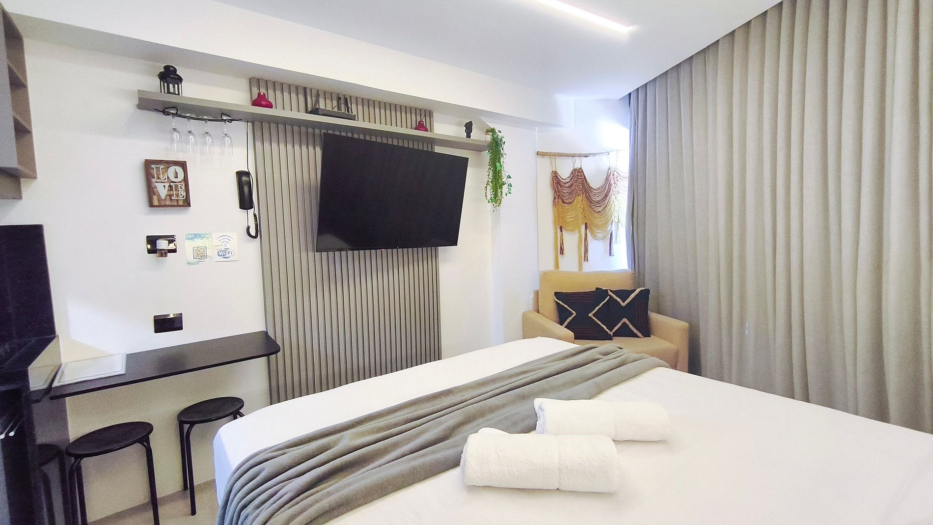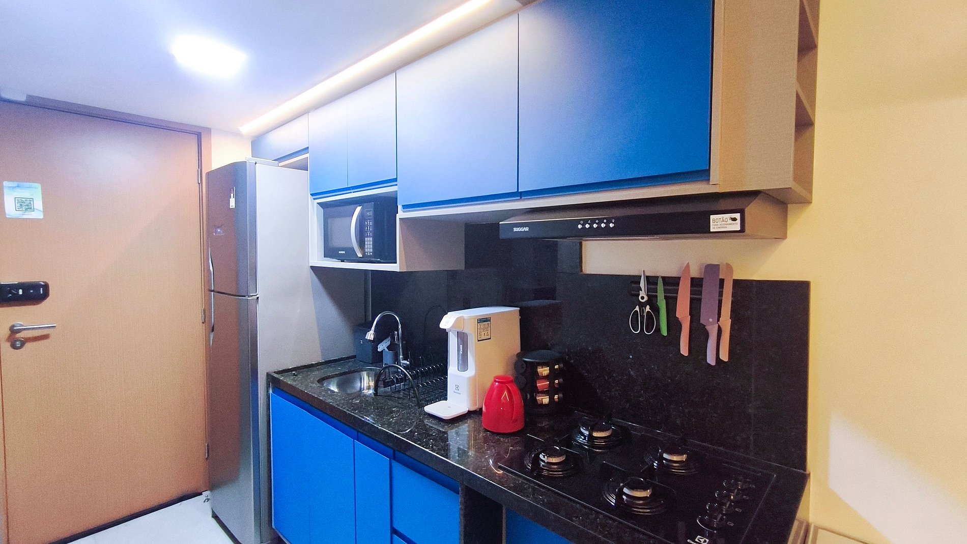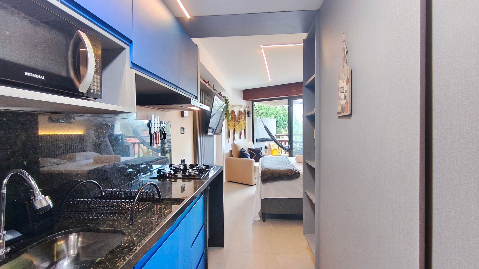✹ O ambiente integrado possui decoração aconchegante. A cozinha é completa com geladeira, fogão elétrico de indução , micro-ondas, airfryer, sanduicheira, cafeteira elétrica, liquidificador, entre outros utensílios. O estúdio possui smart TV, internet, ar-condicionado e um banheiro completo.