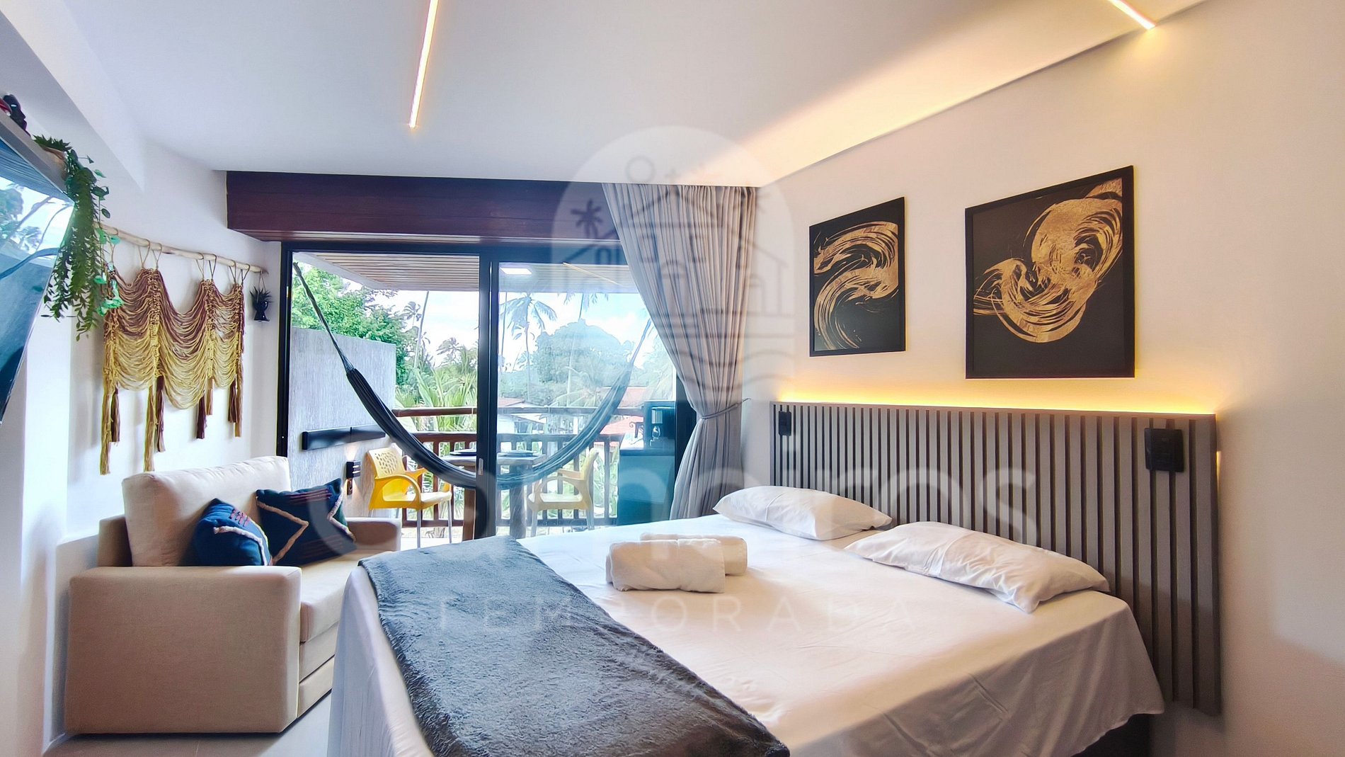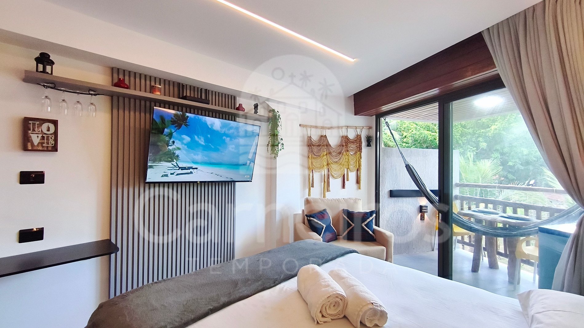 O ambiente integrado possui decoração aconchegante. A cozinha é completa com geladeira, fogão elétrico de indução , micro-ondas, airfryer, sanduicheira, cafeteira elétrica, liquidificador, entre outros utensílios. O estúdio possui smart TV, internet, ar-condicionado e um banheiro completo. Há também varanda de frente para os coqueiros da praia e o mar, rede, mesa e cadeiras.