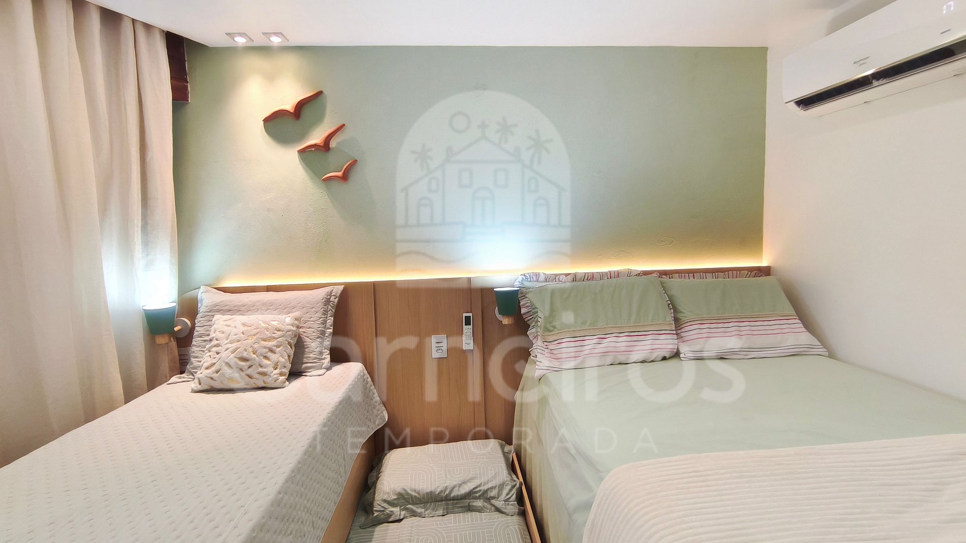 Acomodação para até 4 pessoas, com 1 cama de casal, uma cama de solteiro e uma bicama.