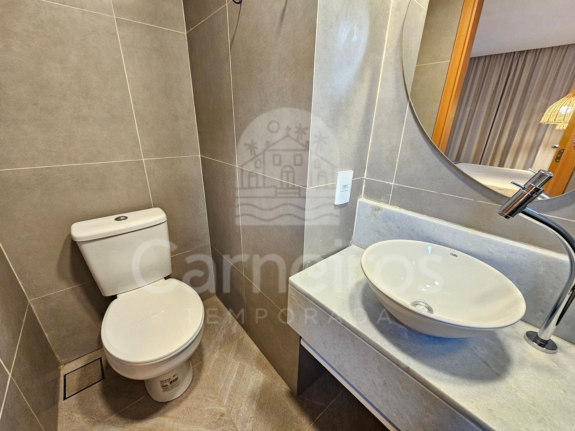 O ambiente integrado possui decoração aconchegante e moderna. A cozinha é completa com geladeira, fogão cooktop duas bocas, micro-ondas, airfryer, sanduicheira, cafeteira, liquidificador, cooler para praia e piscina, entre outros utensílios. O studio possui TV, ar-condicionado, bancada com cadeiras, armários e um banheiro completo.